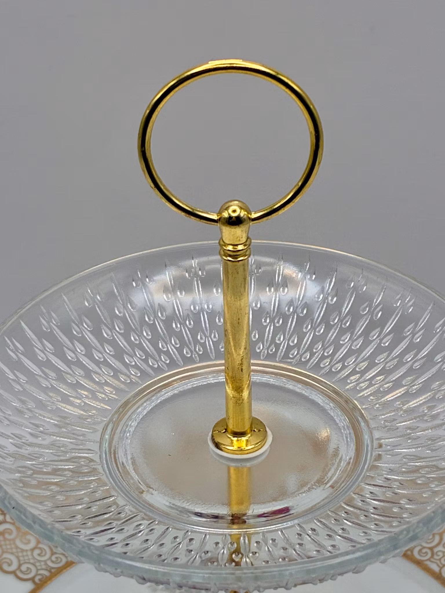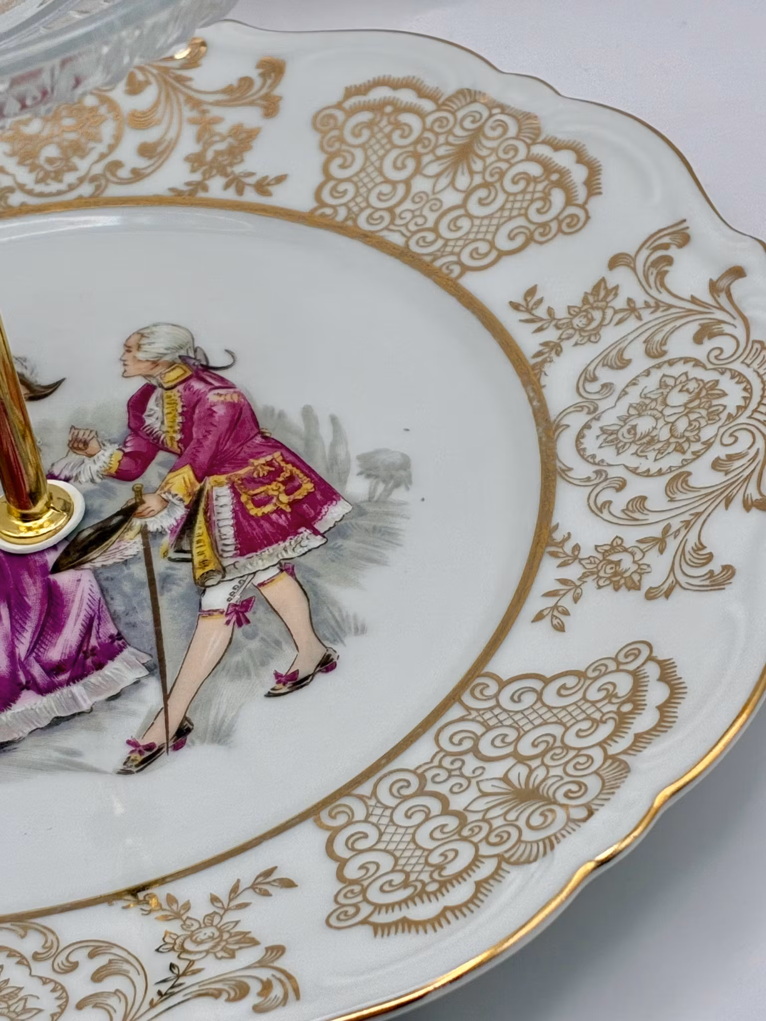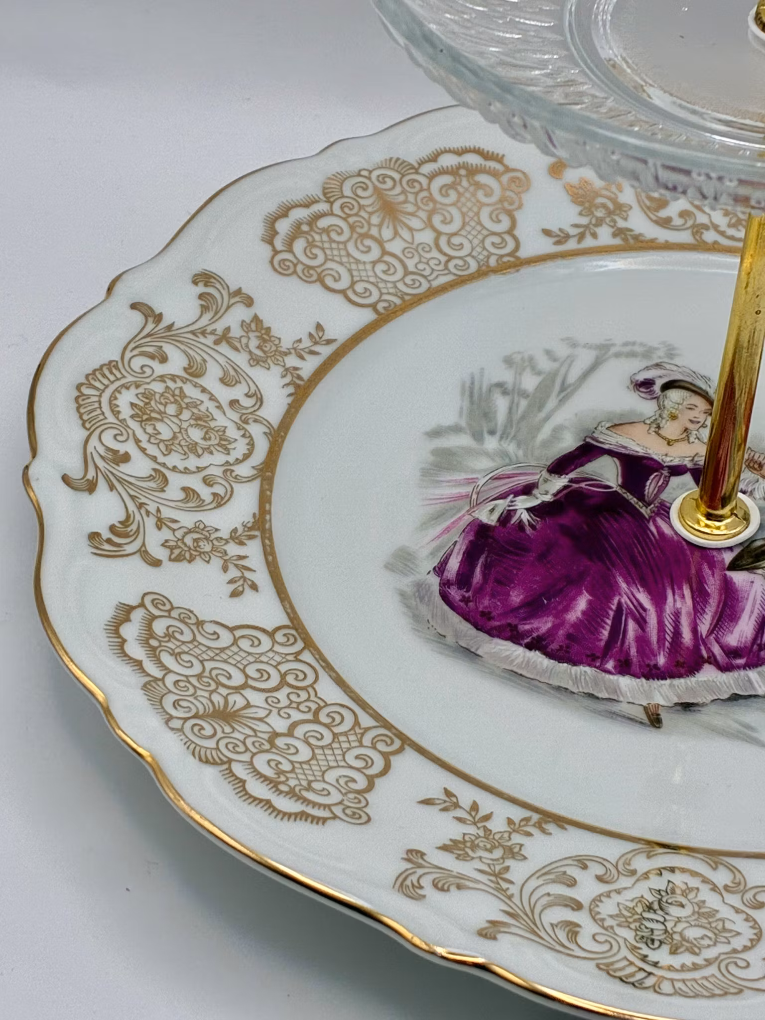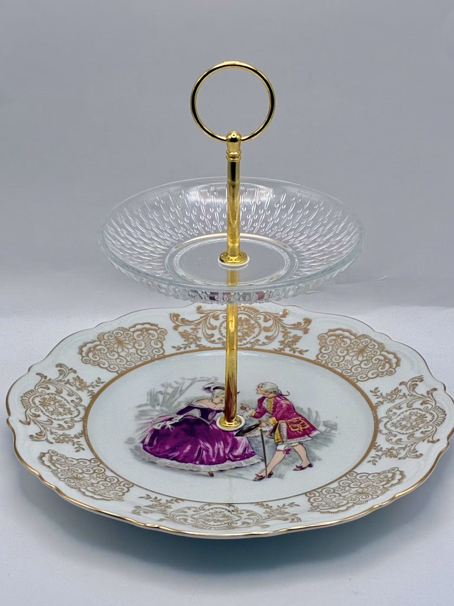 Dette nydelige etasjefatet er satt sammen av vintage Bavaria-porselen med gyllent mønster og et sjarmerende 1700-talls motiv – supplert med en krystallklar glassasjett på toppen for en touch av letthet og luksus.