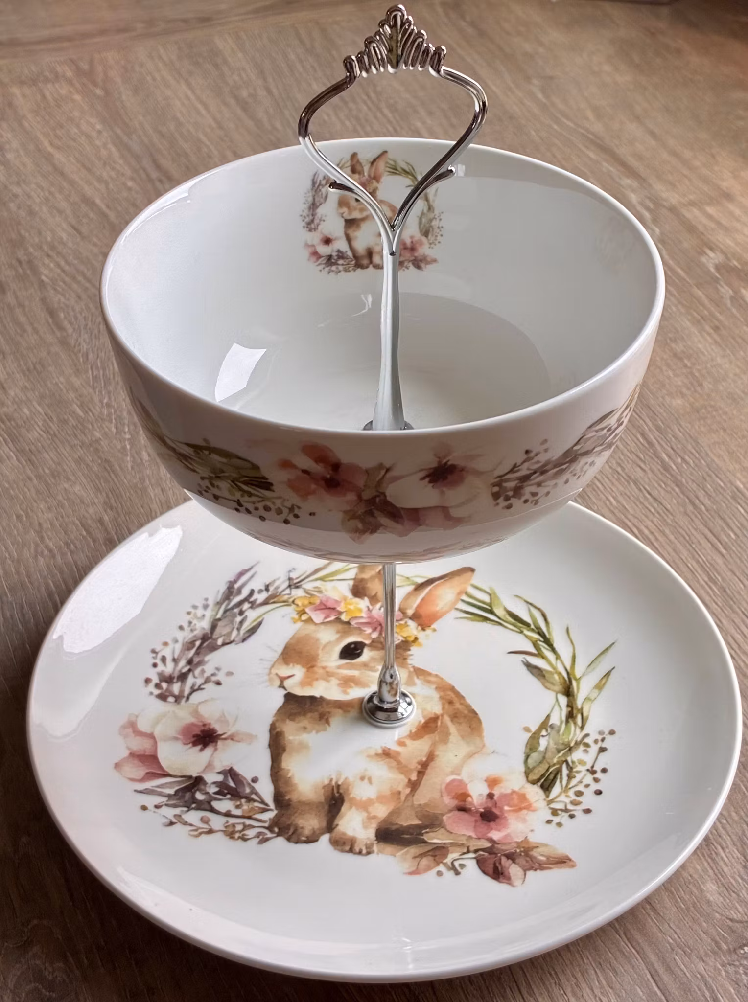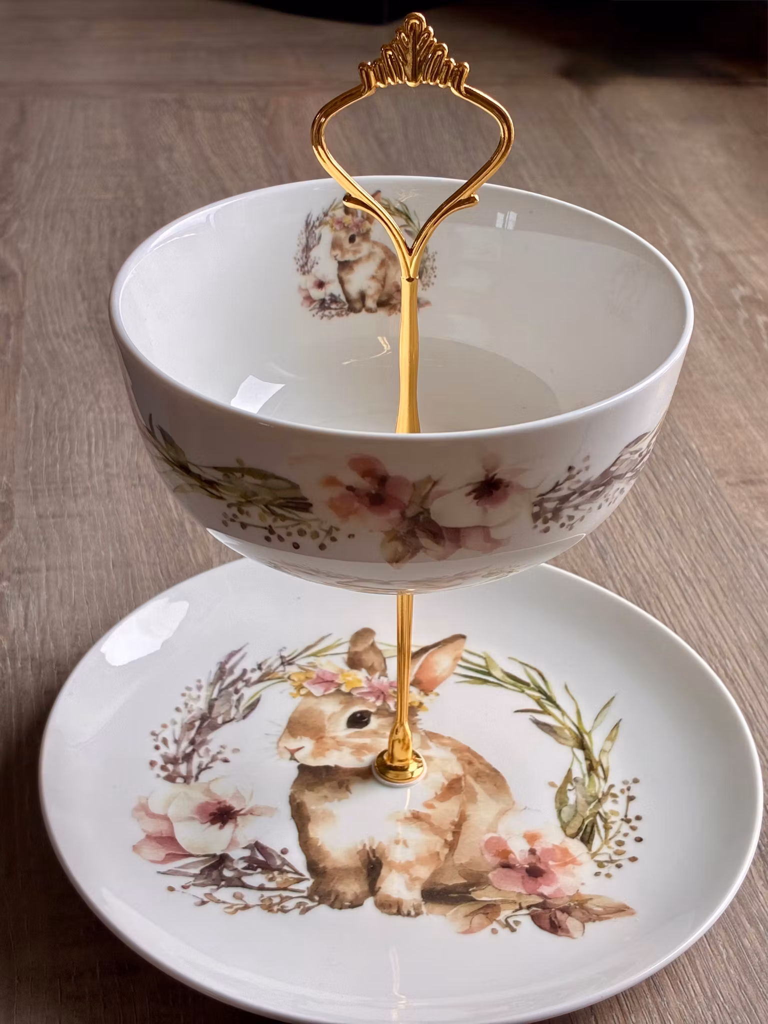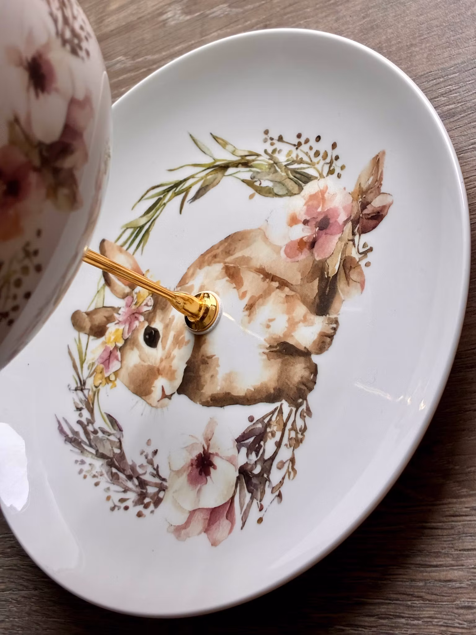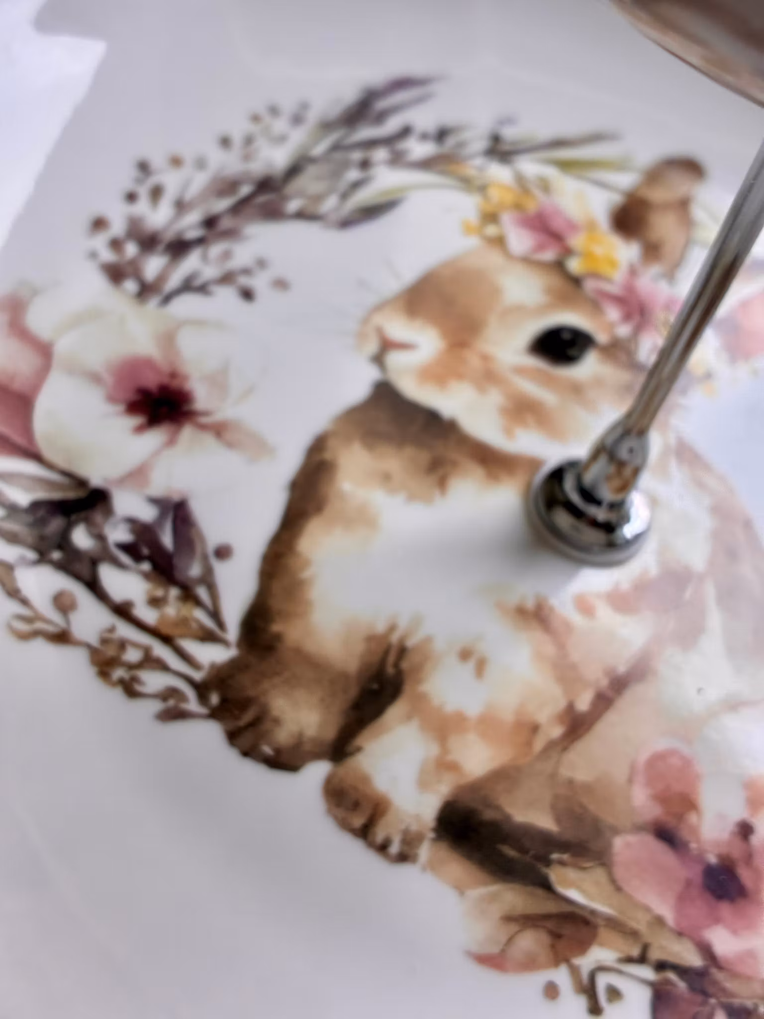 Fatet er satt sammen av nye deler, vakkert med et mykt og nostalgisk kaninmotiv, omgitt av sarte blomsterdetaljer.