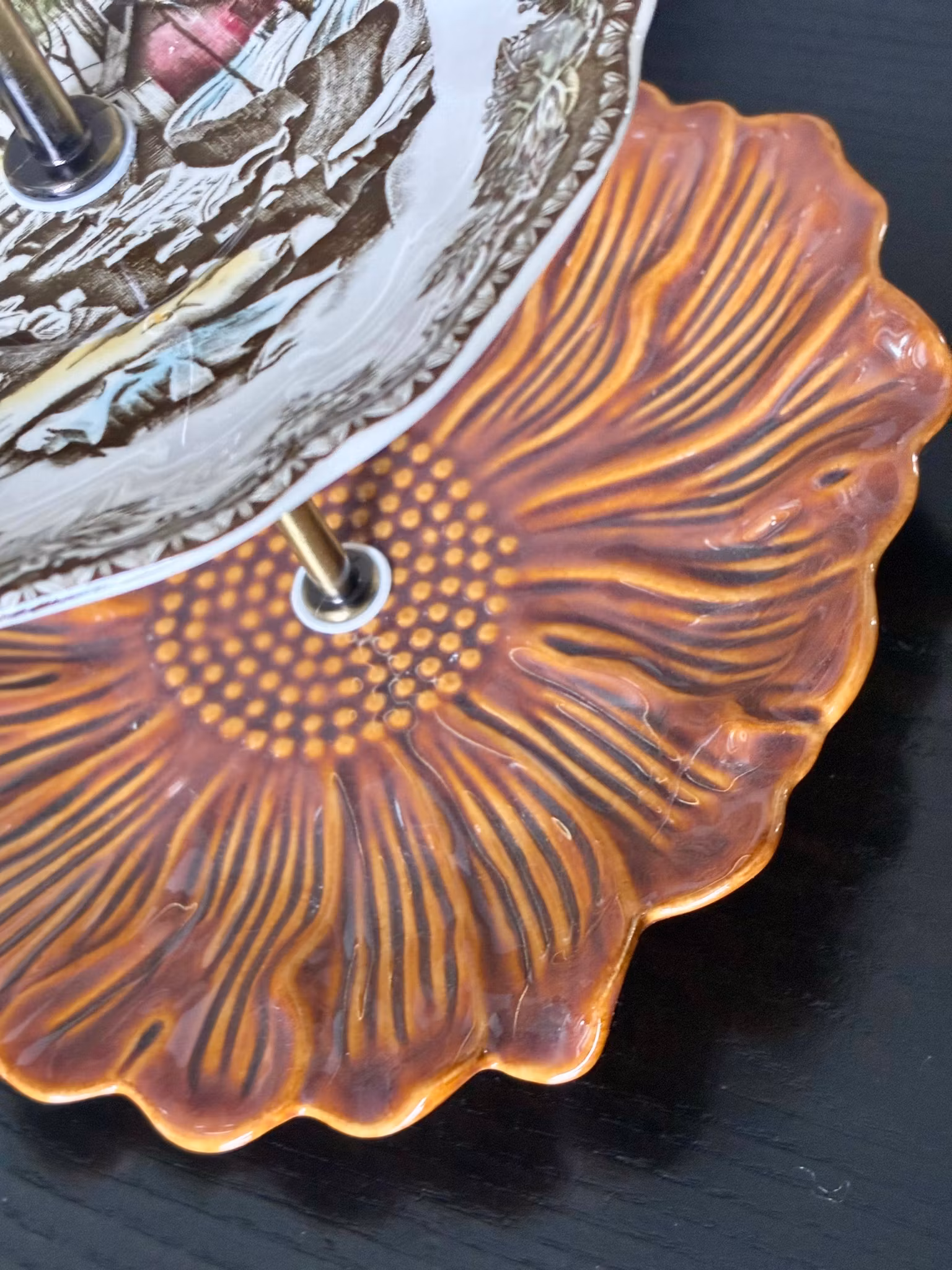Nederst finner du et varmt, blomsterformet fat i dype rusttoner med vakker struktur og håndverksfølelse. Det gir et lunt og naturlig preg, og fungerer som en solid og dekorativ base.