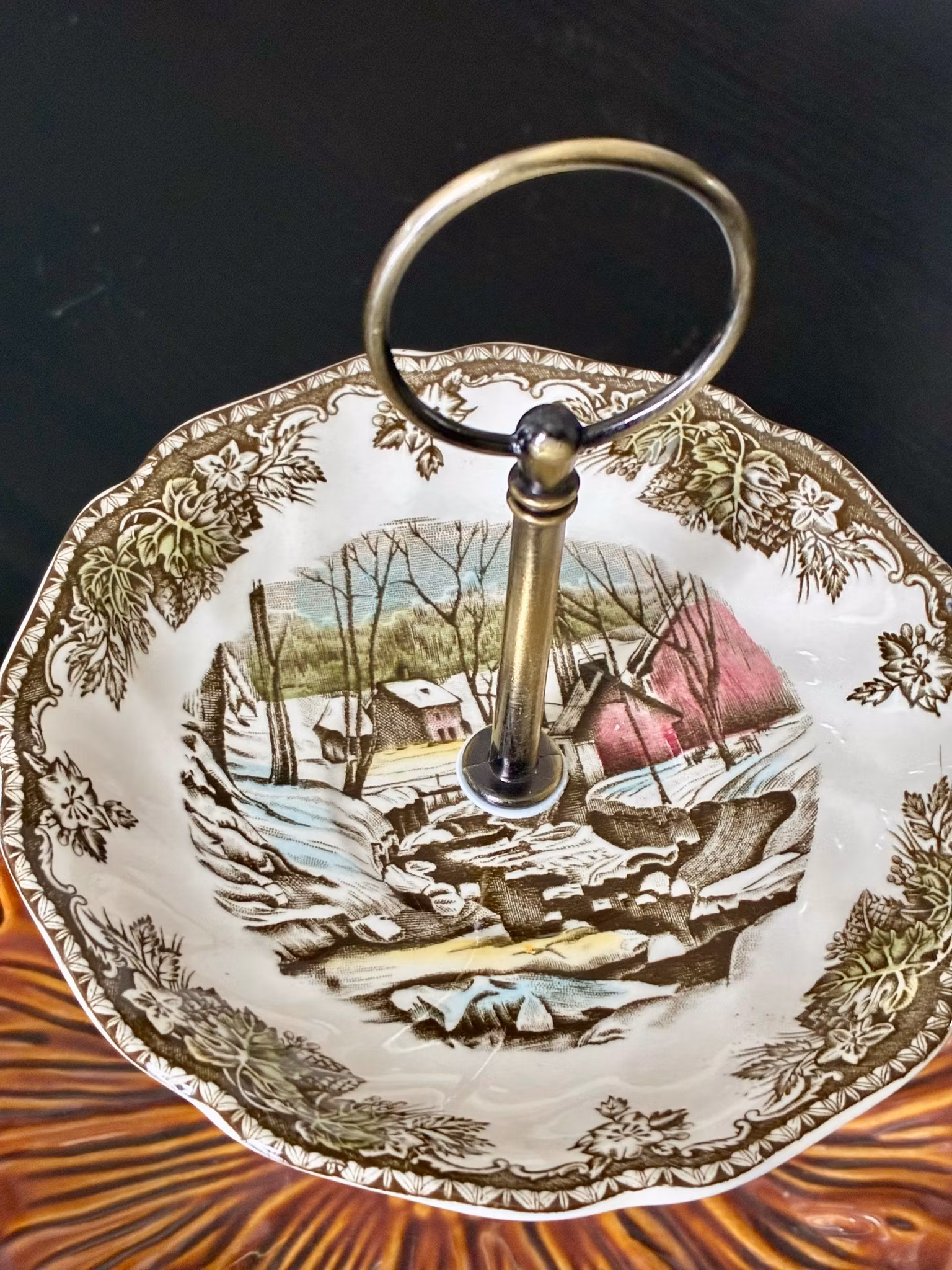 Øverst troner en vintage skål fra Johnson Brothers – The Friendly Village, motivet “The Ice House”. Den nostalgiske landsbyillustrasjonen i duse bruntoner gir et klassisk, tidløst uttrykk og en fin kontrast til den rustikke bunnen.