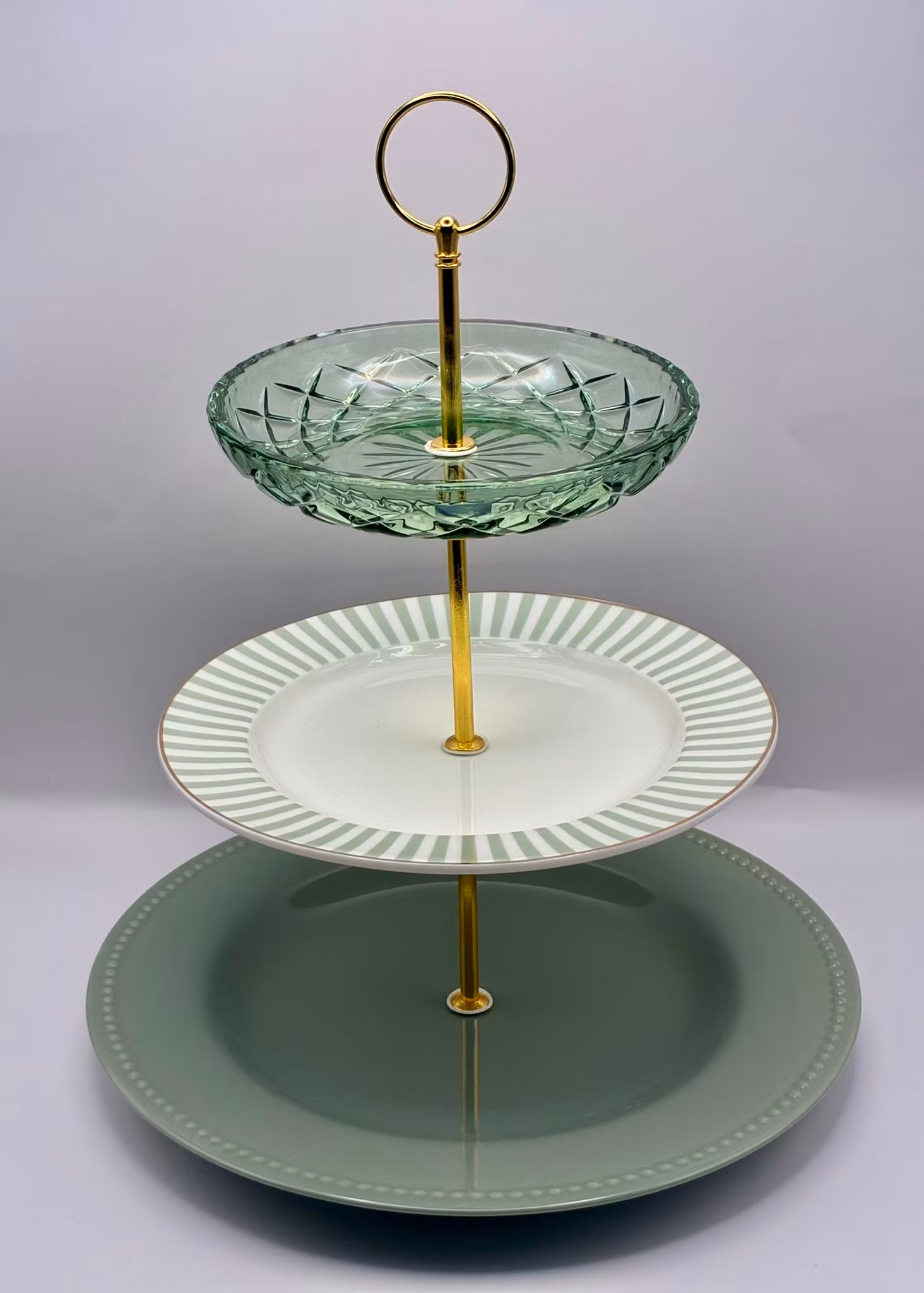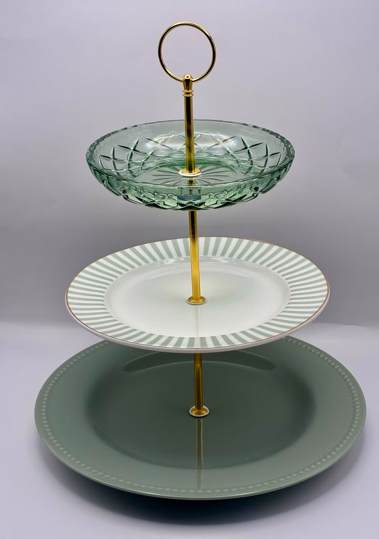 Dette treetasjes etasjefatet er satt sammen av kun nye deler, og gir et rent, elegant uttrykk som passer perfekt både til hverdagskos og høytidsfeiringer.