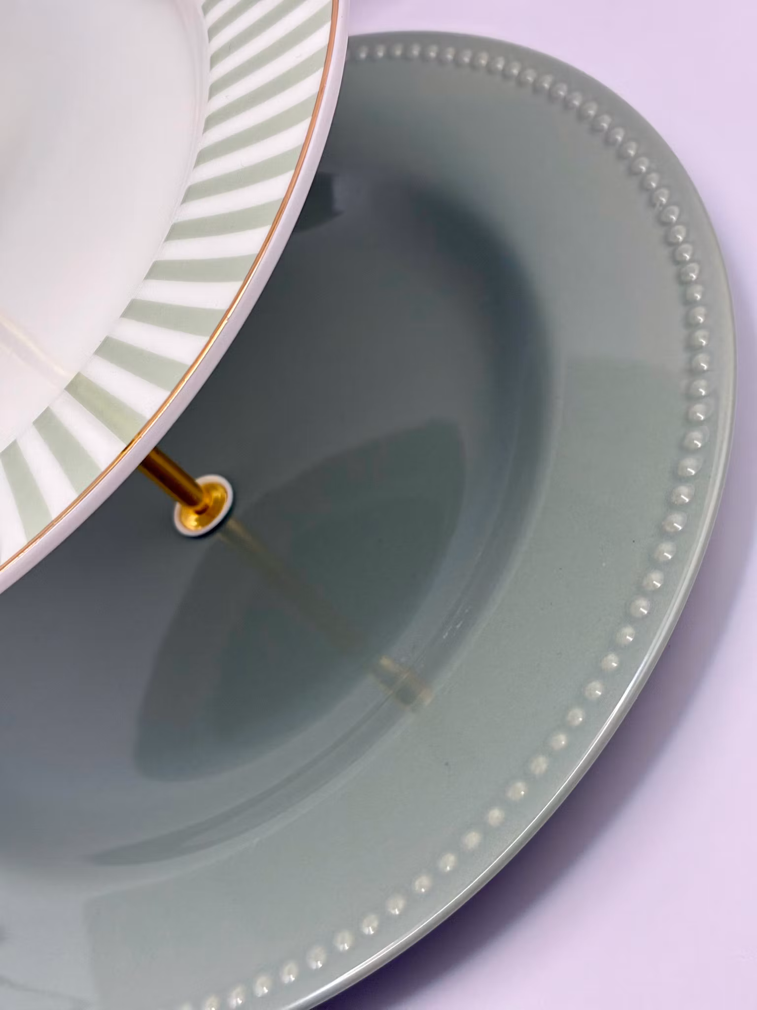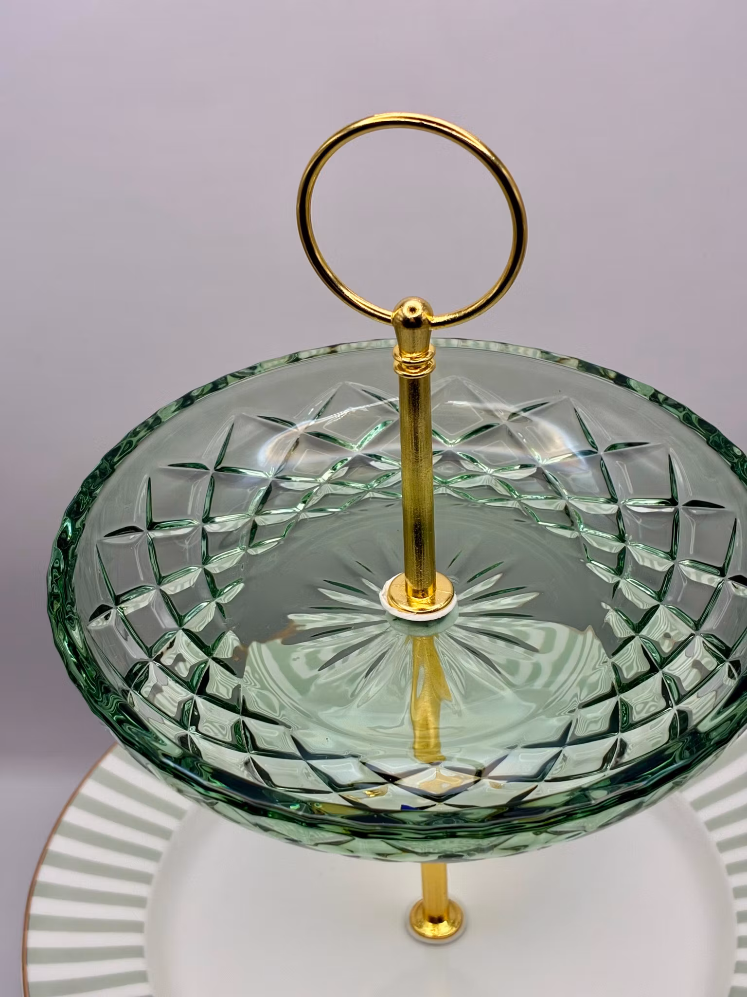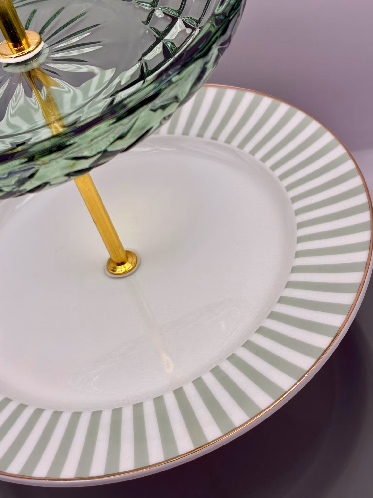 Den vakre kombinasjonen av mintsalvie, dus grønn krystall og myke striper gjør fatet både moderne og klassisk på samme tid. Gullfargede stenger gir det lille ekstra løftet – akkurat nok til å gjøre serveringen litt mer luksuriøs.