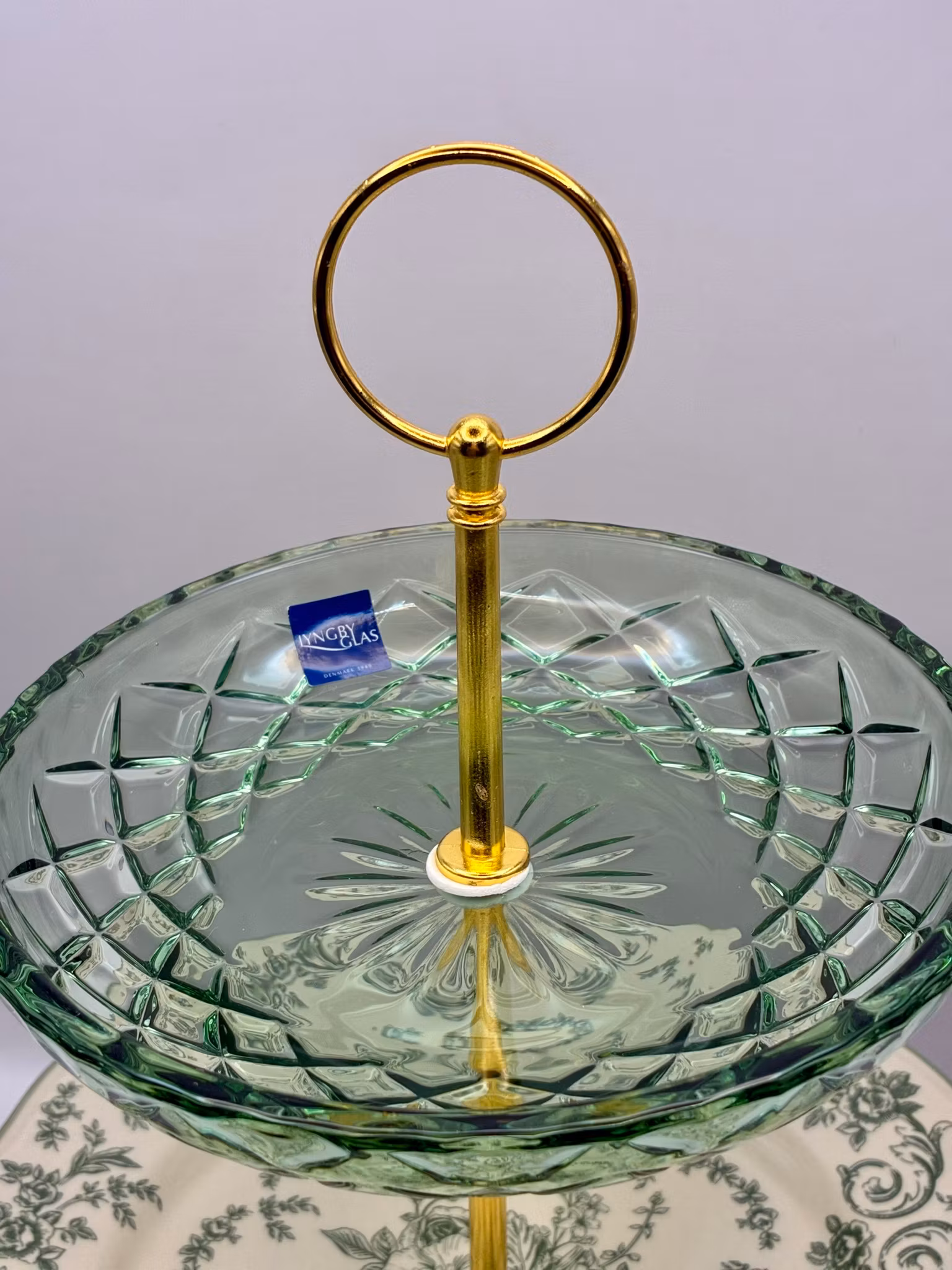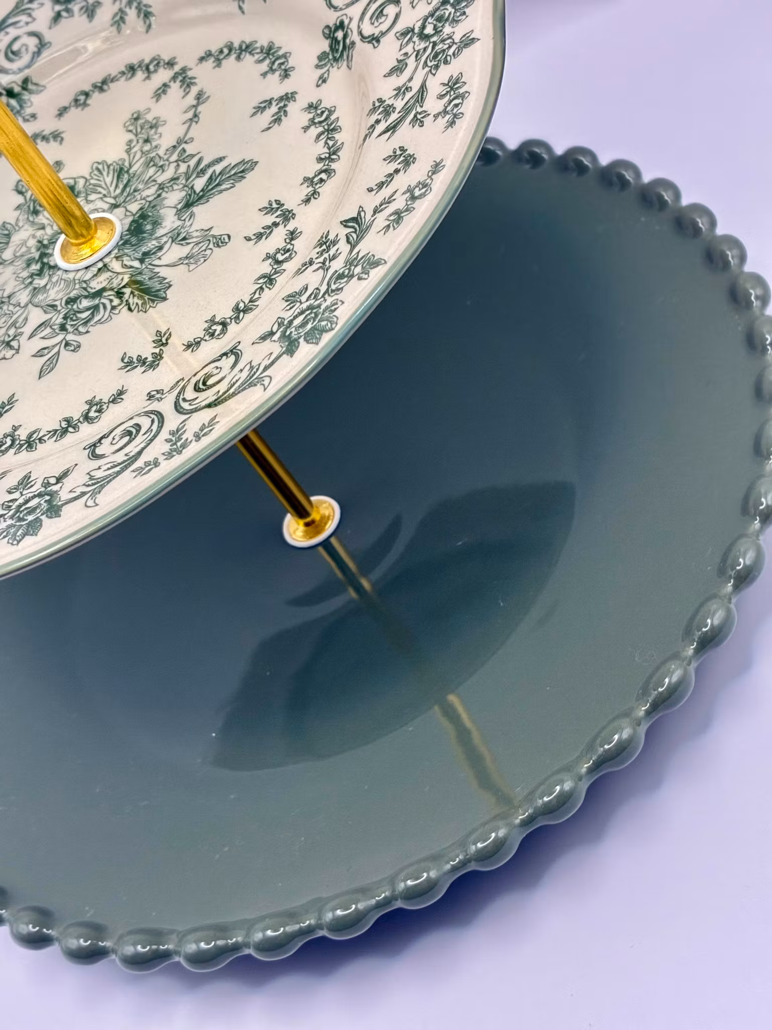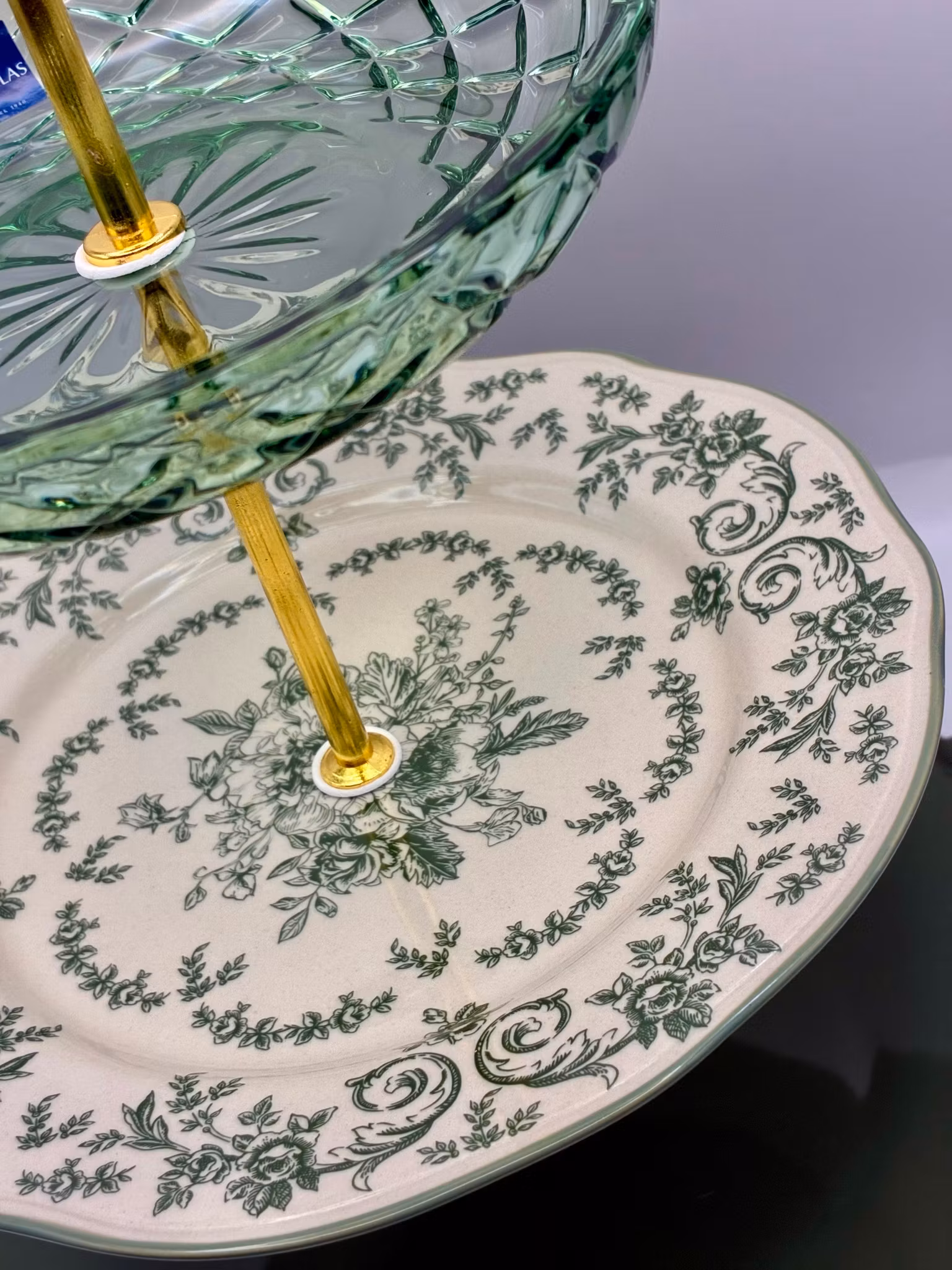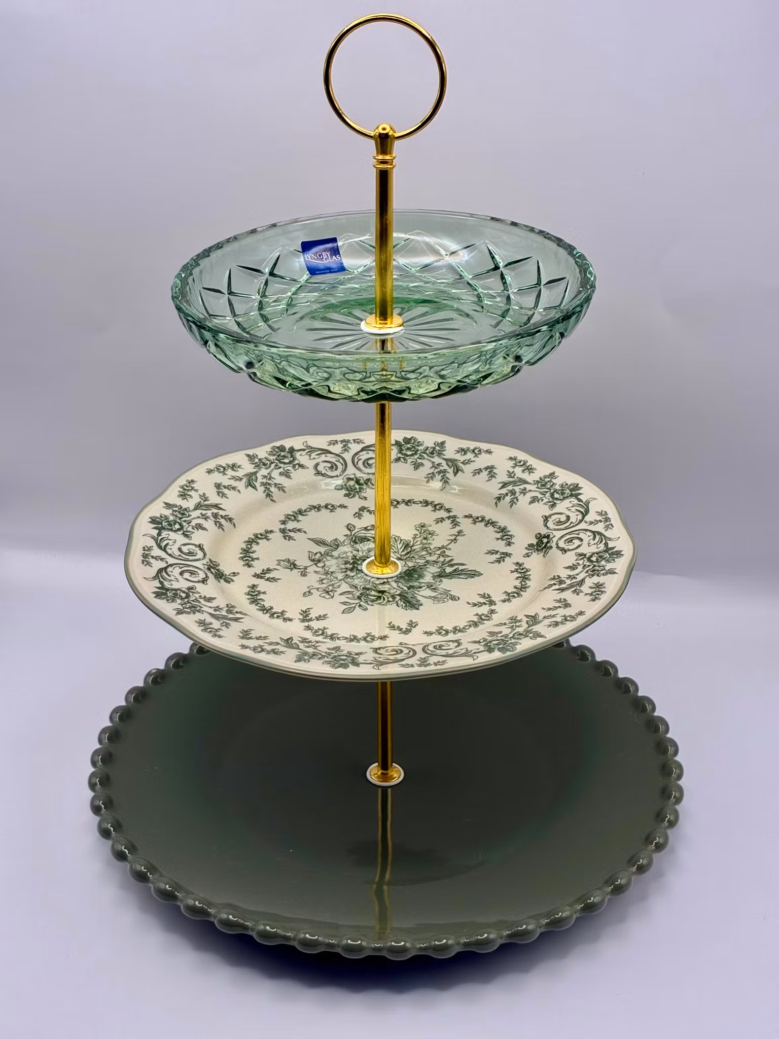 Dette vakre etasjefatet er håndlaget av nøye utvalgte tallerkner, satt sammen til et unikt og harmonisk uttrykk. De tre etasjene kombinerer ulike nyanser av grønt og klassiske mønstre som gir et tidløst og elegant preg – perfekt til kakebordet, servering av småretter eller som et dekorativt blikkfang i hjemmet.