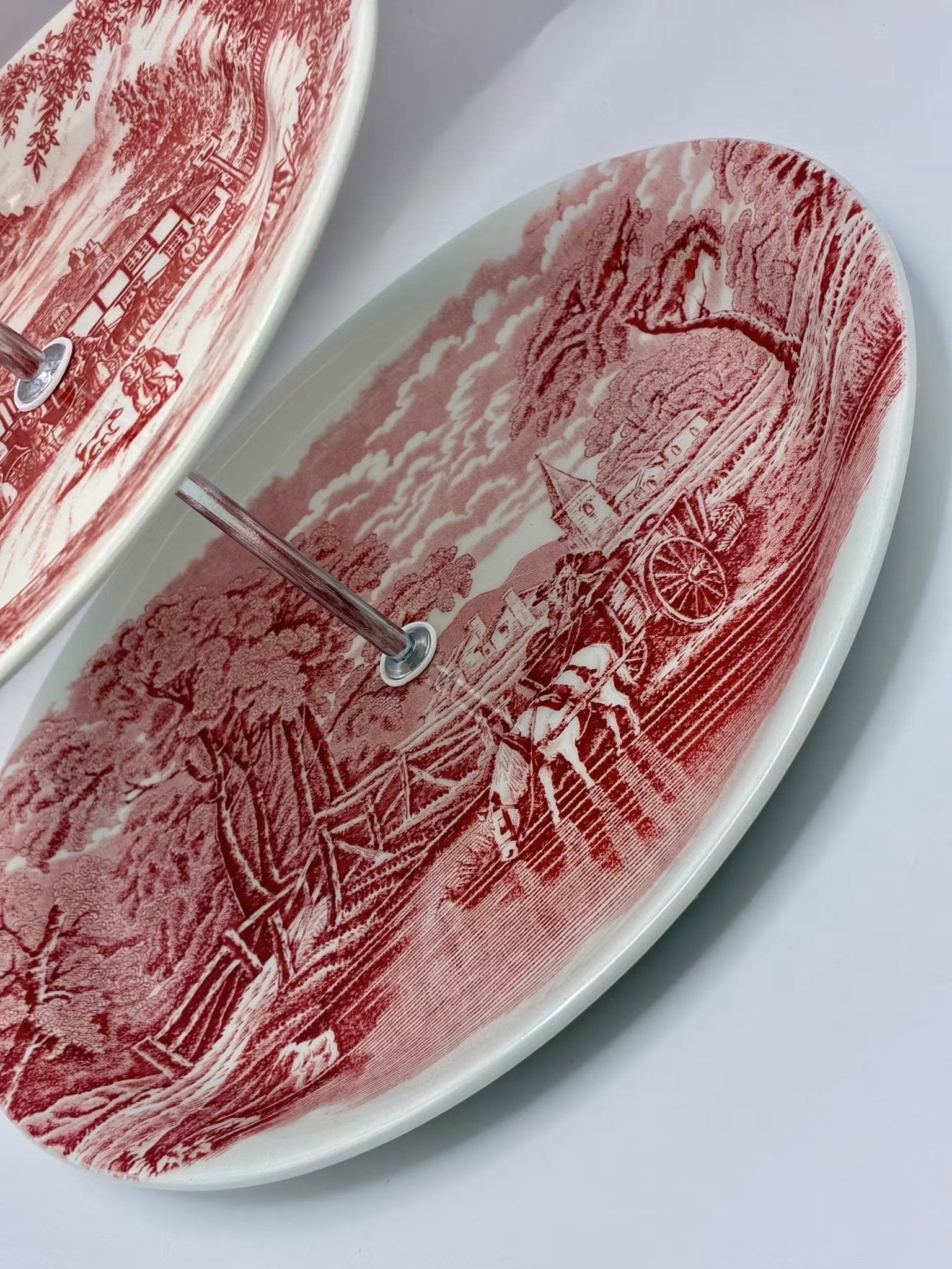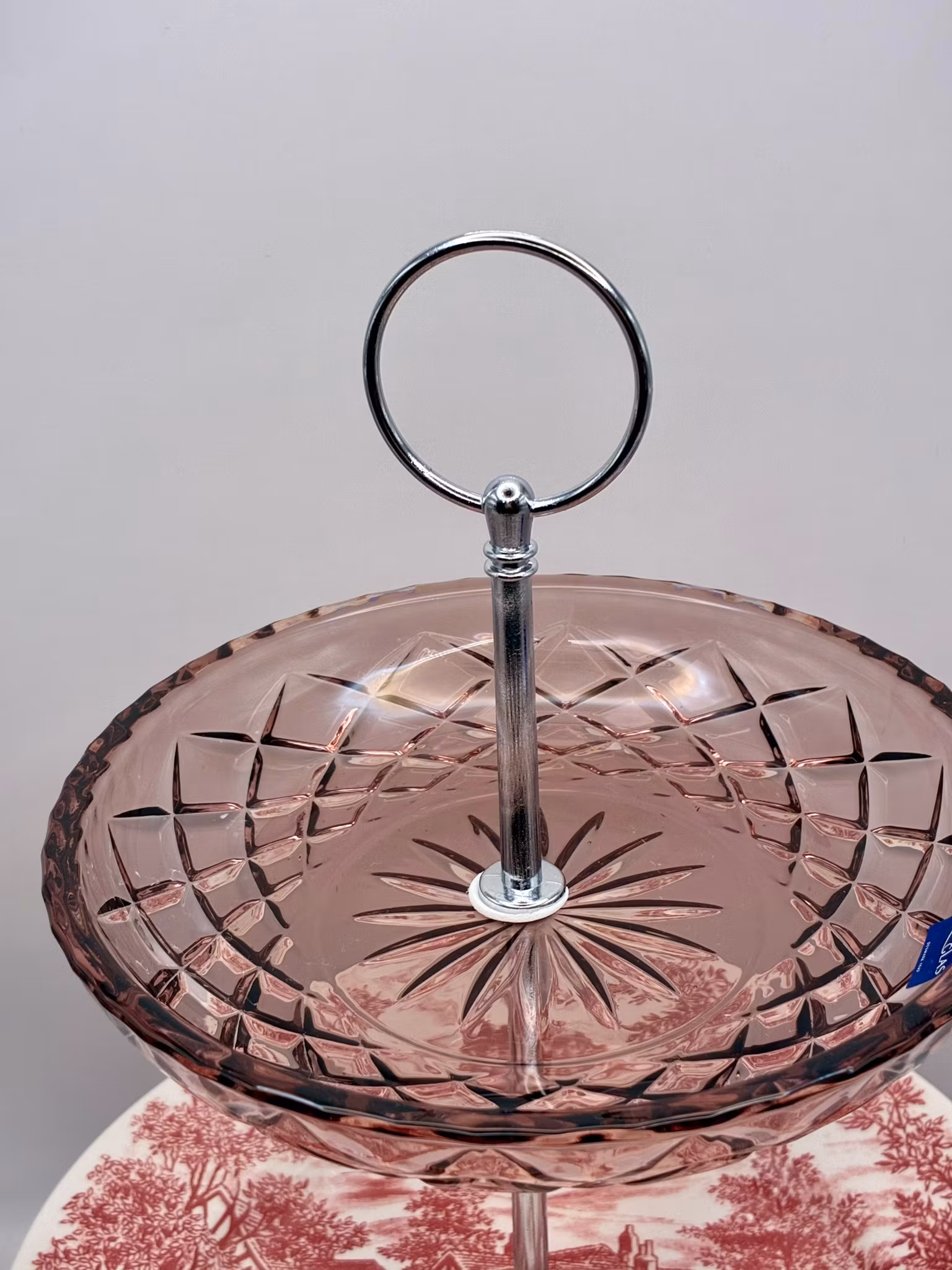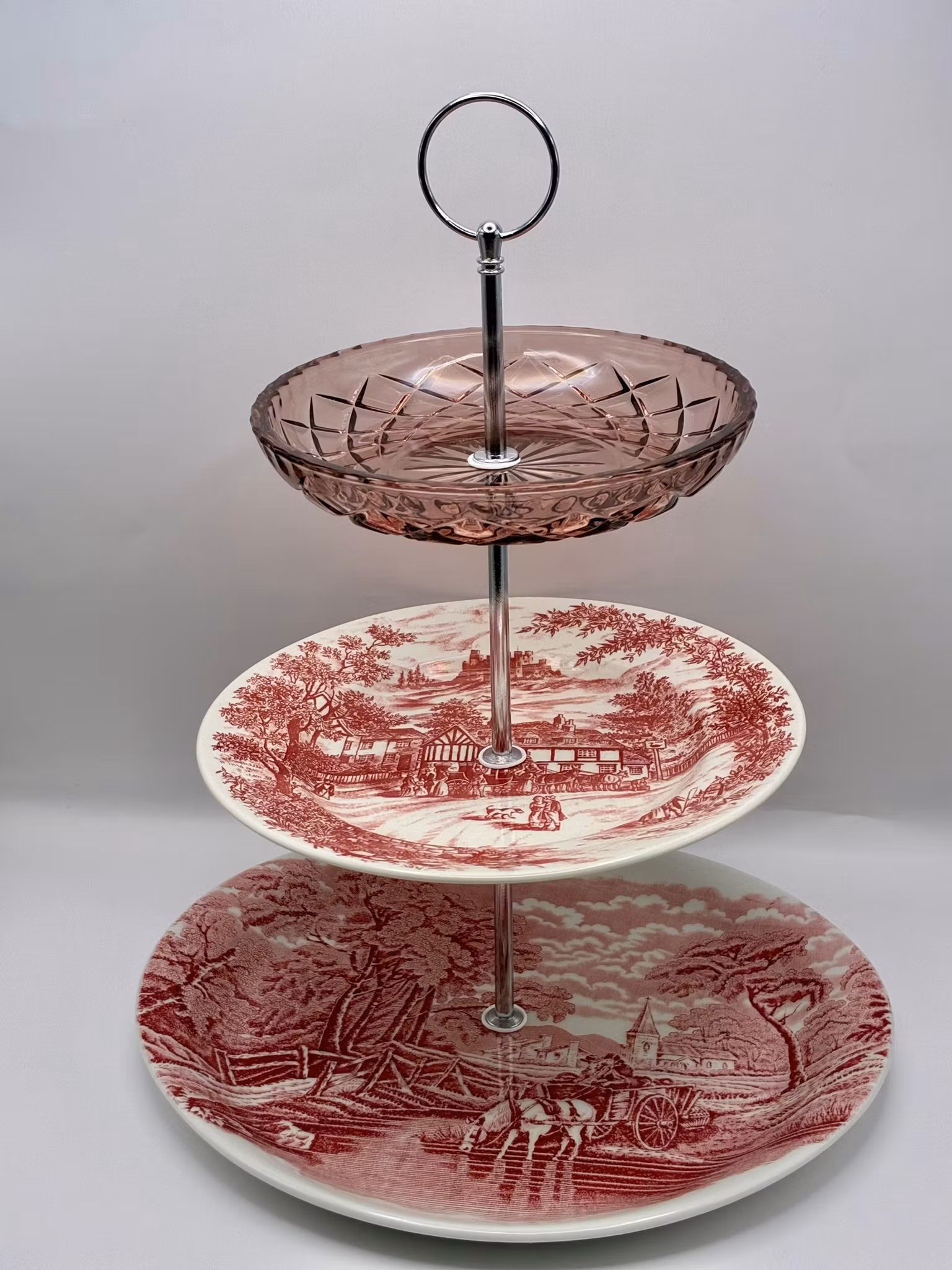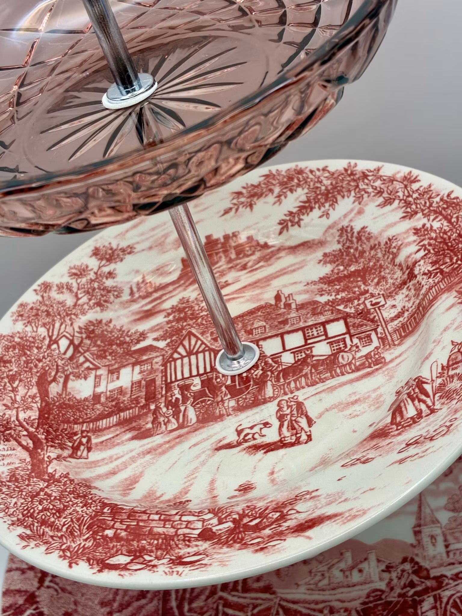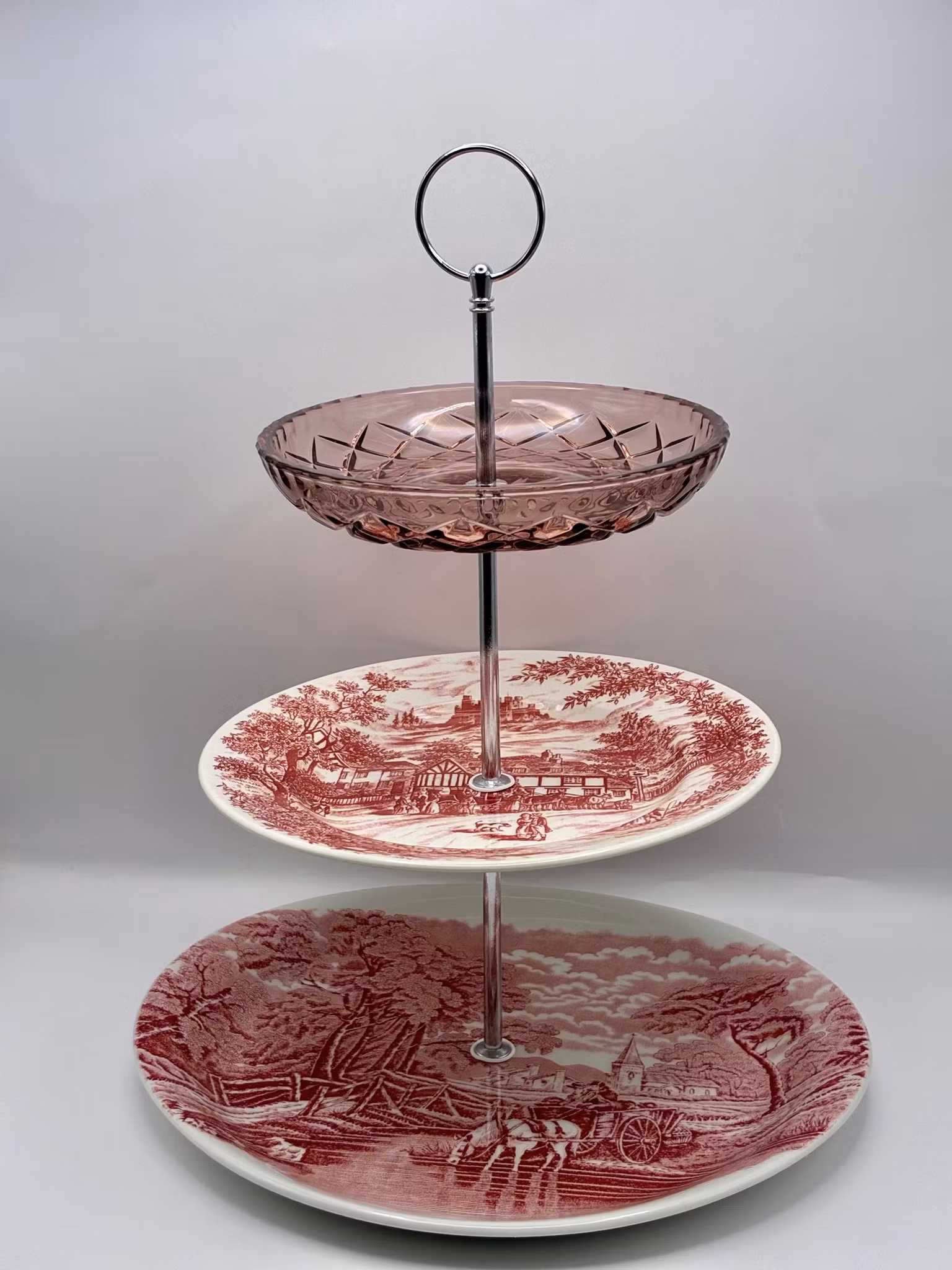 Dette elegante etasjefatet er satt sammen av nydelige funn i engelsk porselen kombinert med en toppskål fra Lyngby. De varme røde porselensmotivene gir et klassisk uttrykk, mens den rosatonede Lyngby-skålen løfter helheten med et moderne og eksklusivt preg.