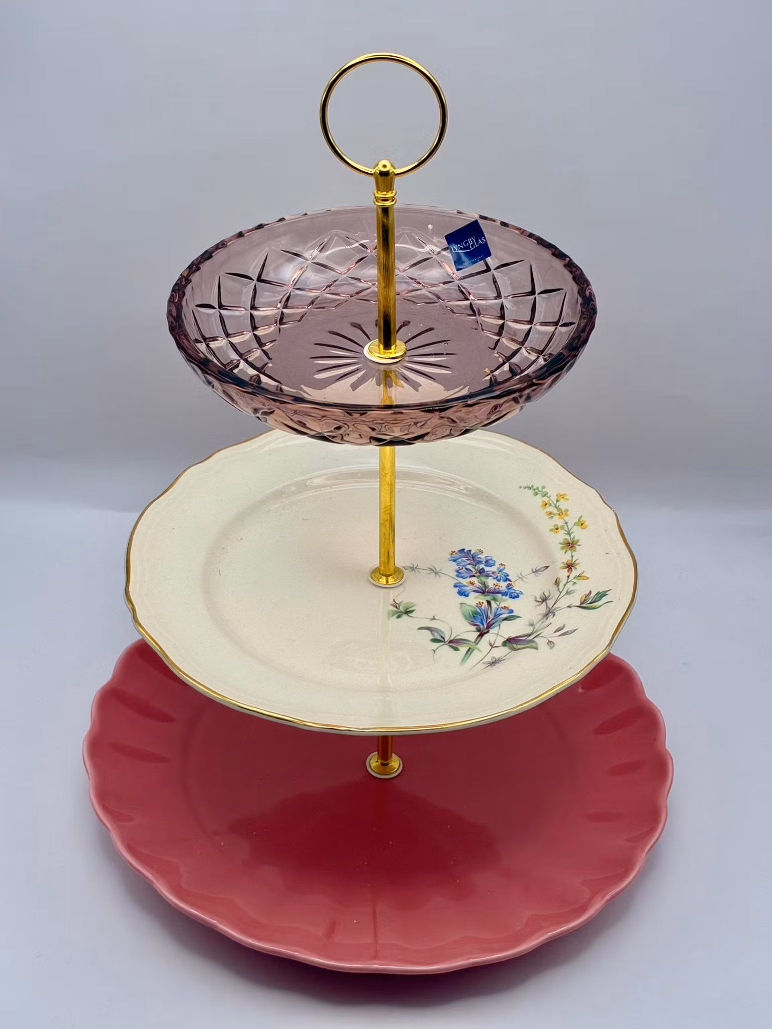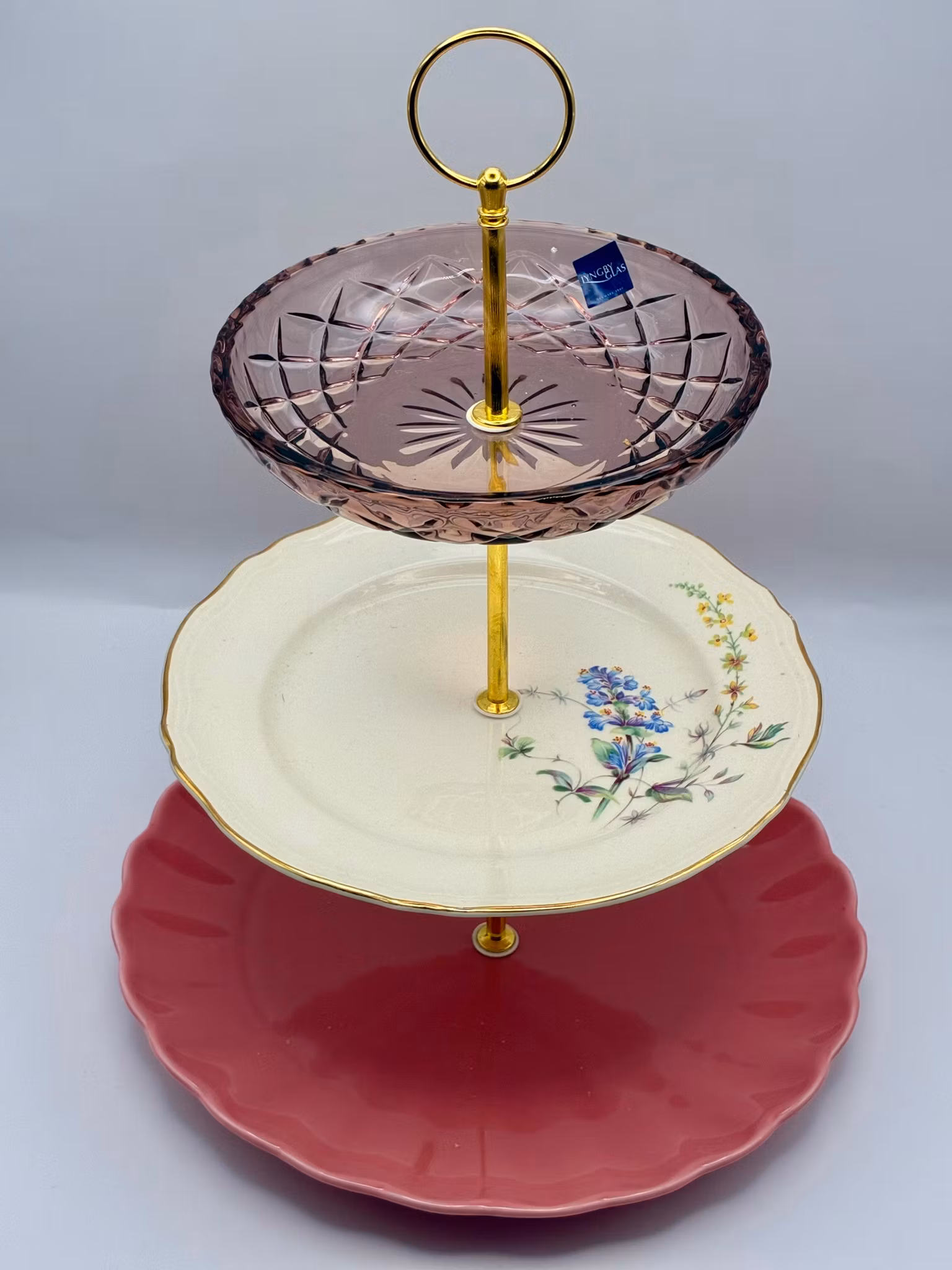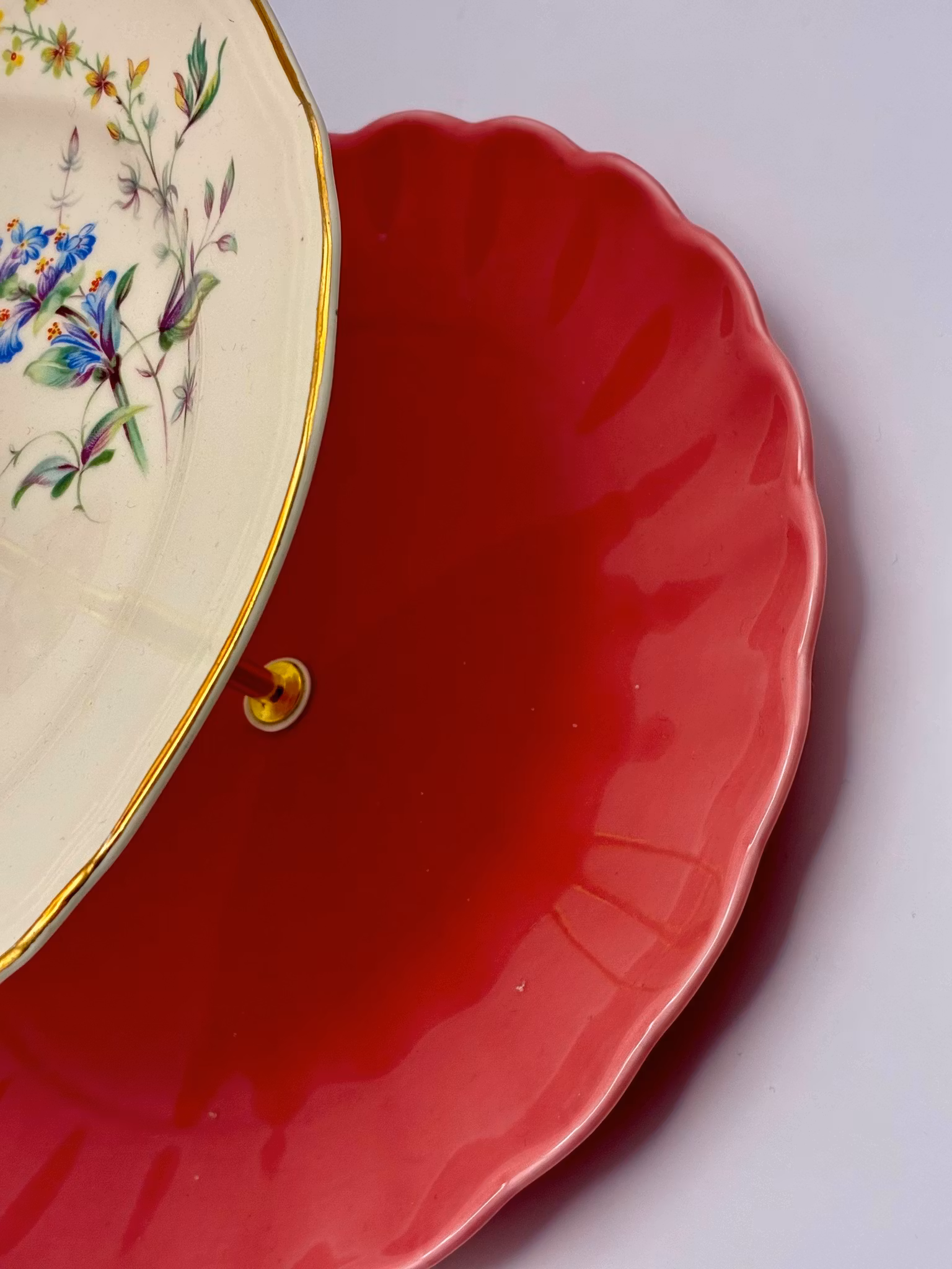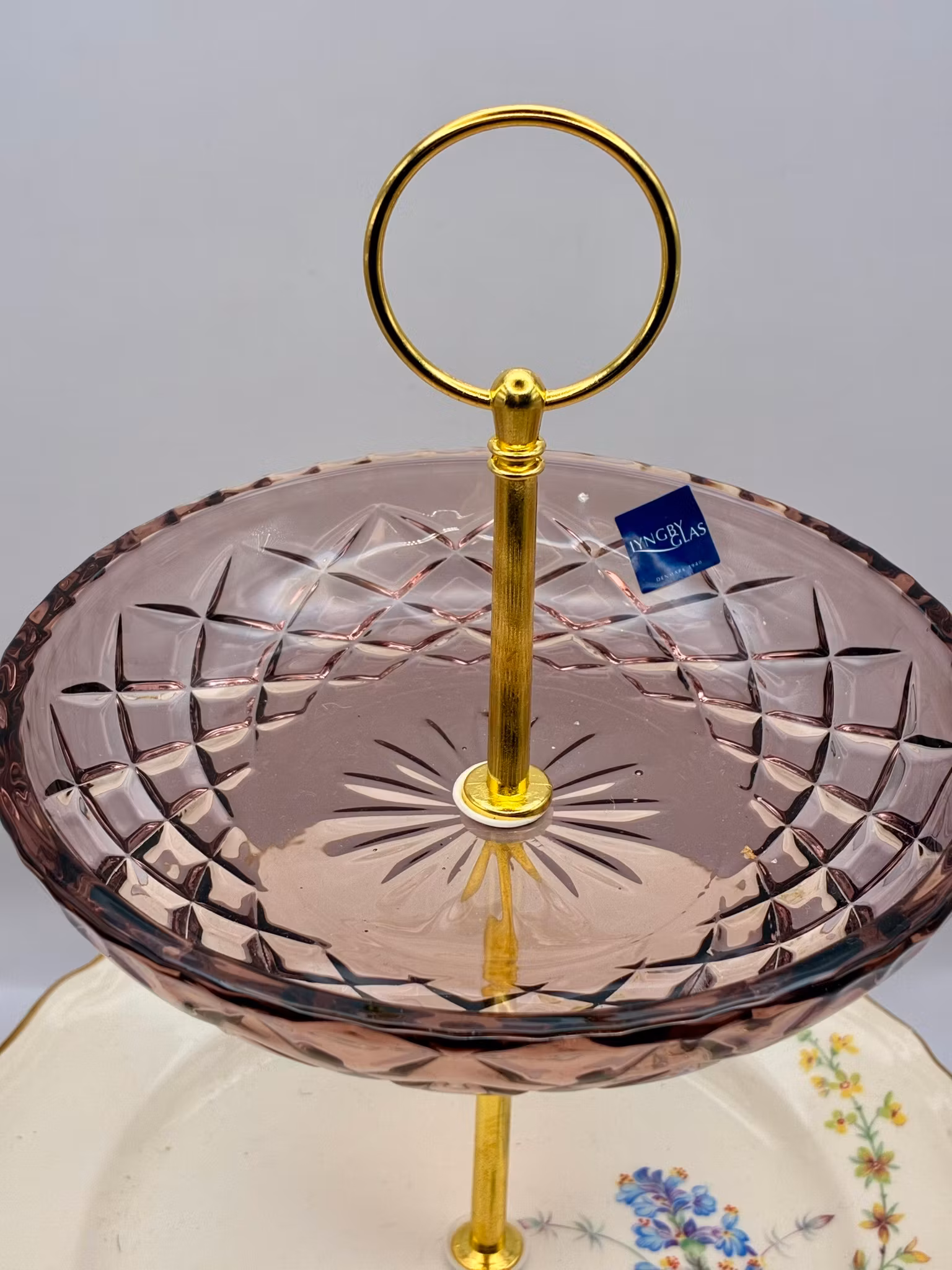 🌸✨ Treetasjes fat – Lyngby Sorrento, Engblomst & rosarødt tallerken fra CG