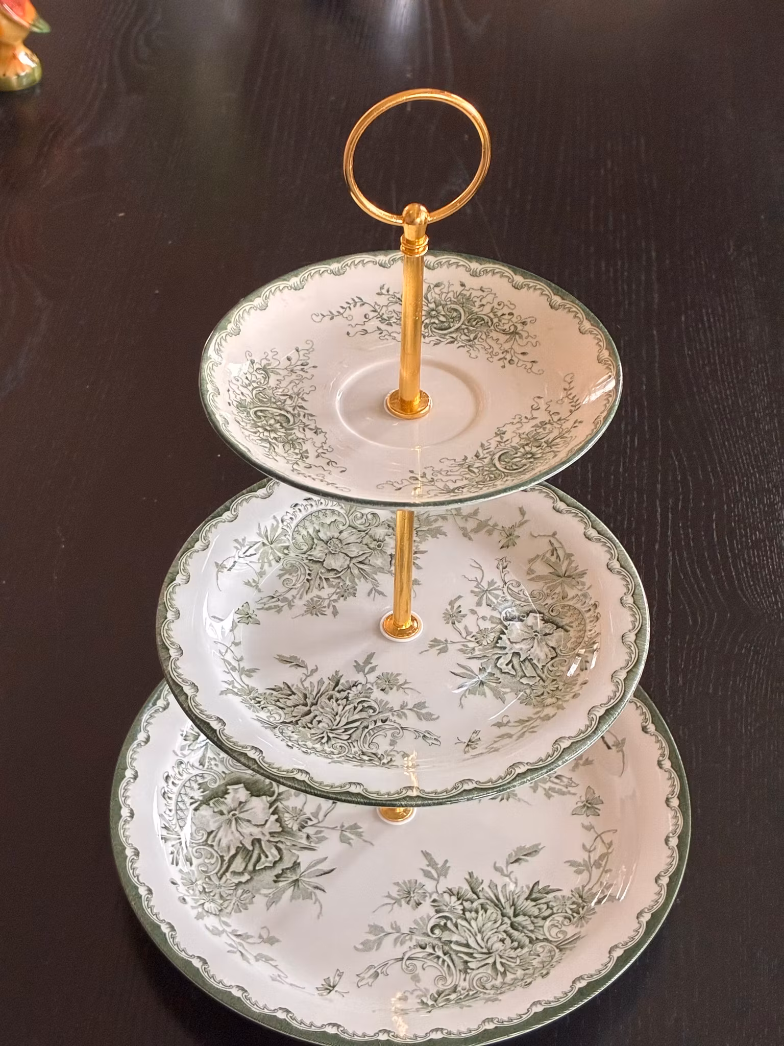 Vakkert etasjefat satt sammen av servisedeler i det klassiske mønsteret Grøn Anna. Fatet består av tre tallerkener i ulike størrelser, montert med et elegant gullfarget håndtak som gjør det både praktisk og dekorativt.