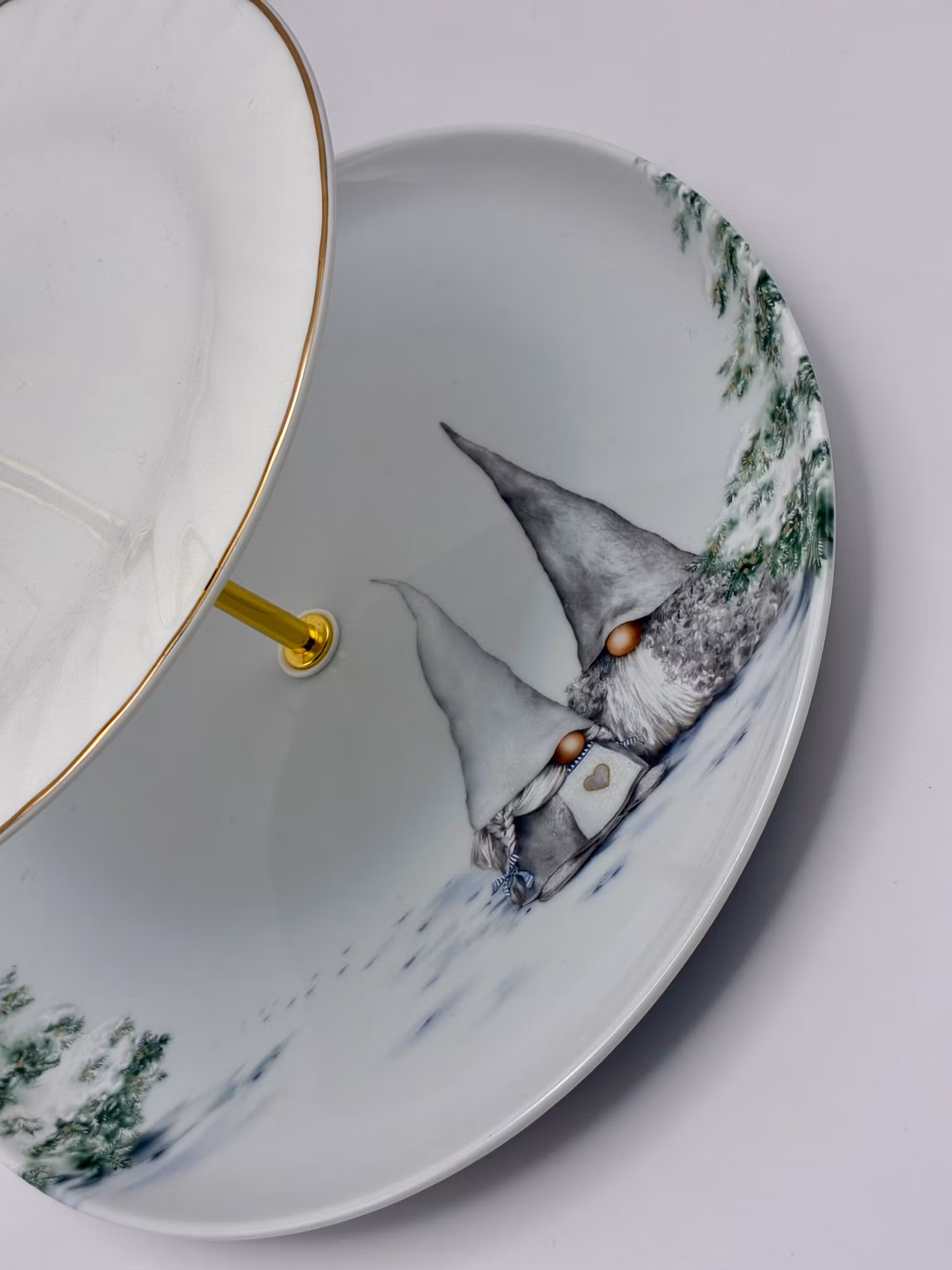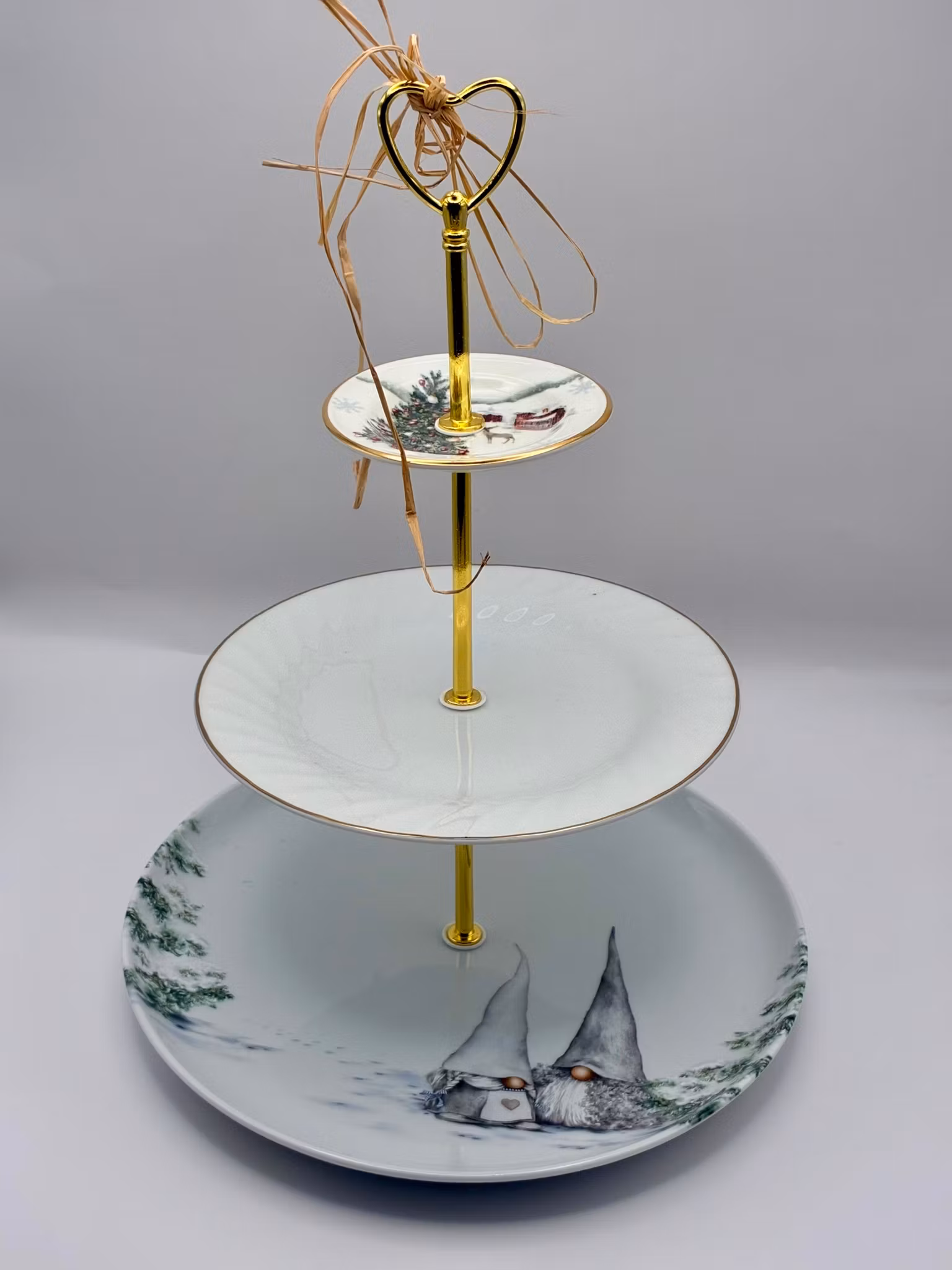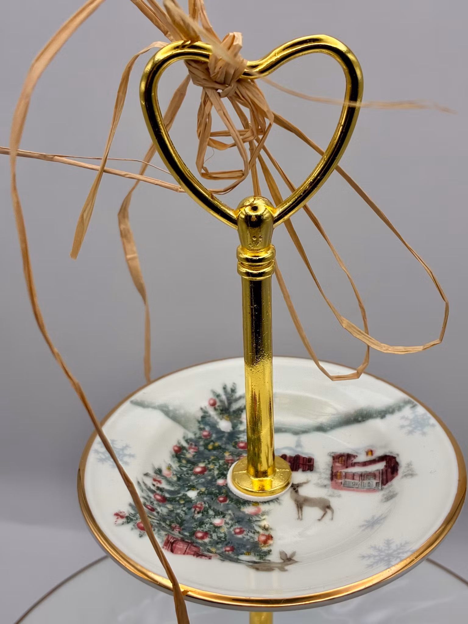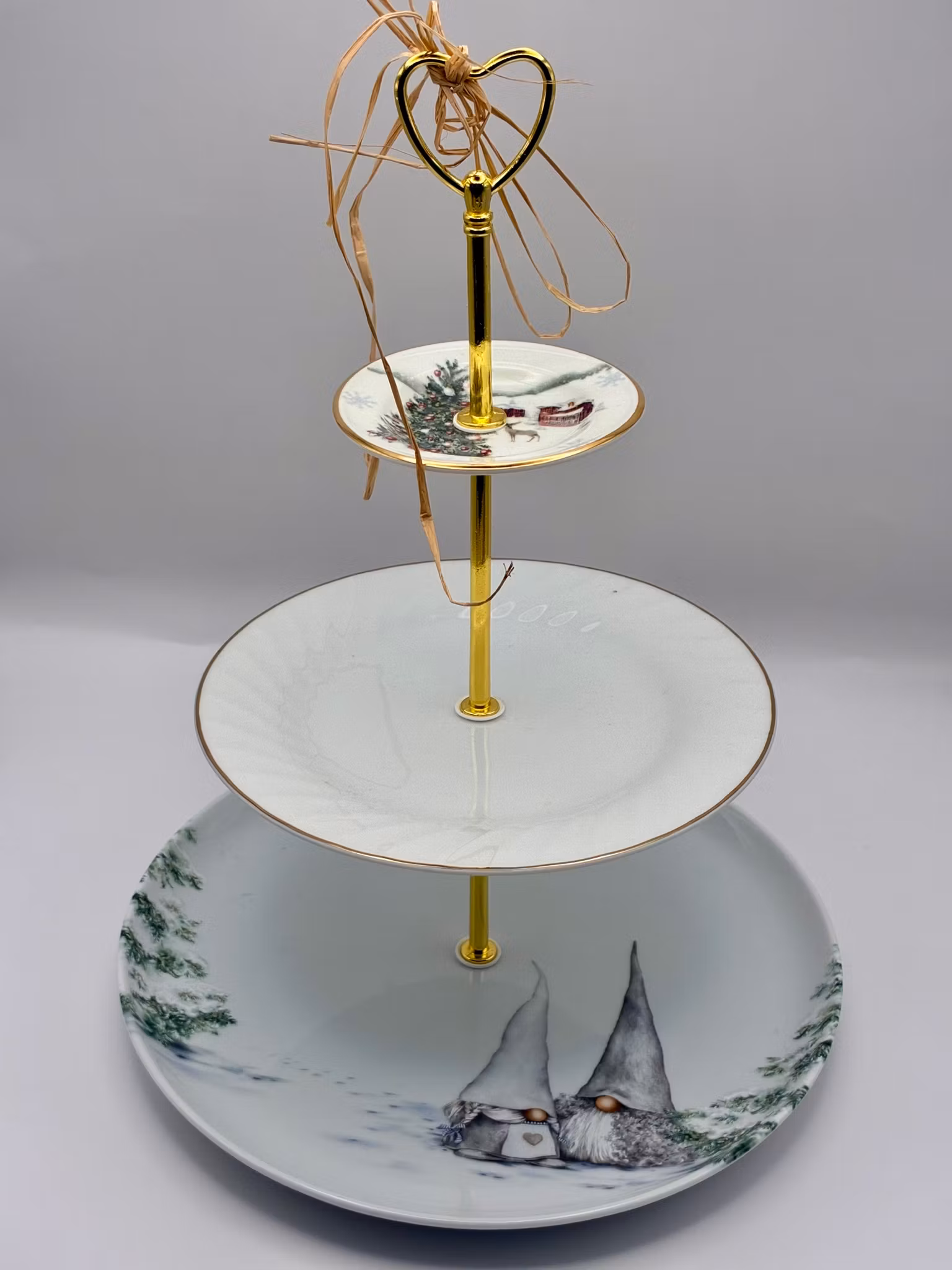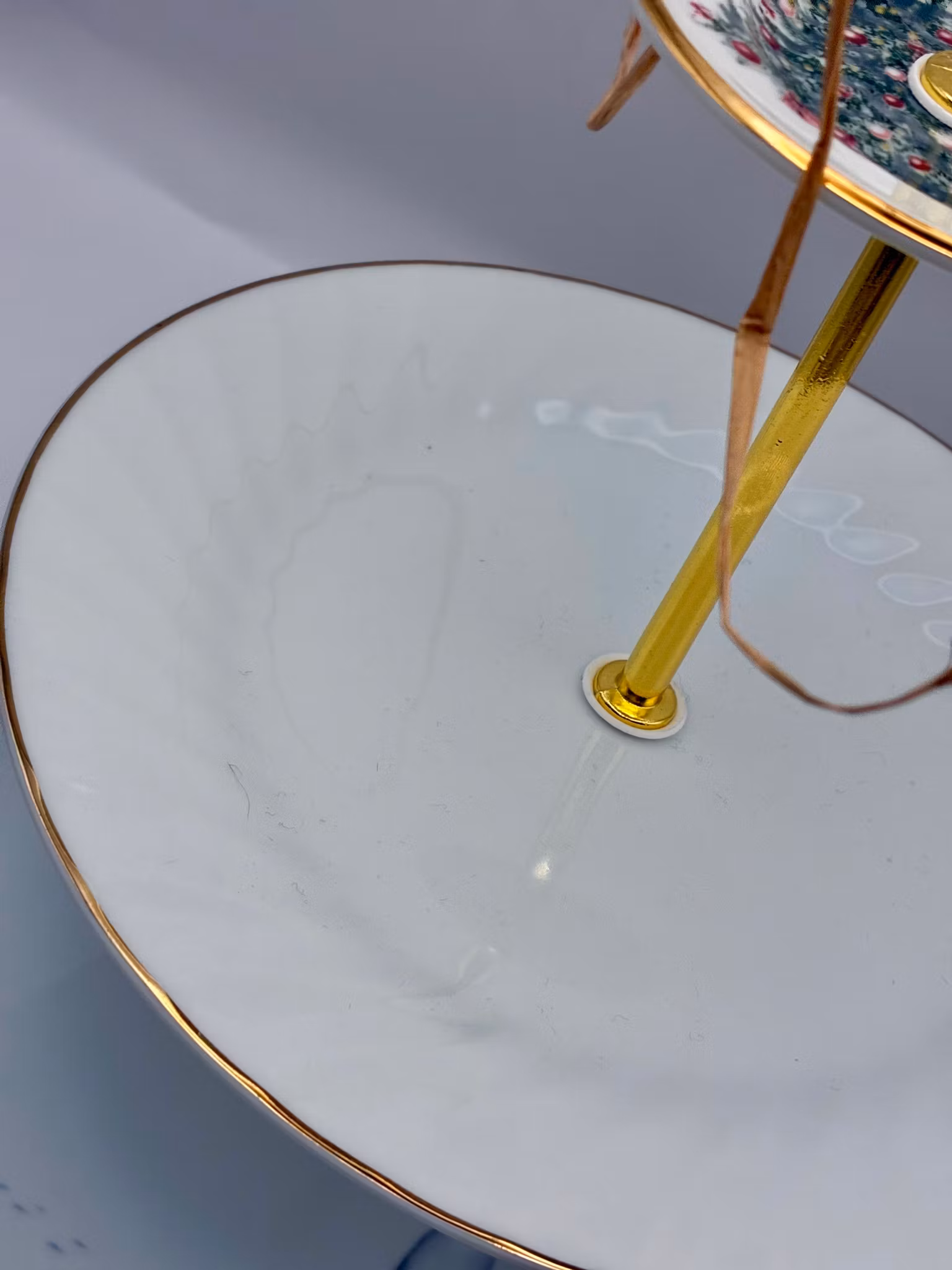 Skap magi på julebordet med et etasjefat basert på Åsas jul fra Firkløveren. I midten en hvit vintage tallerken med gullkant. Fatet er toppet med en liten skål fra HMHome. Gullfargede stenger. Et elegant og stilrent fat som passer til de fleste bord.