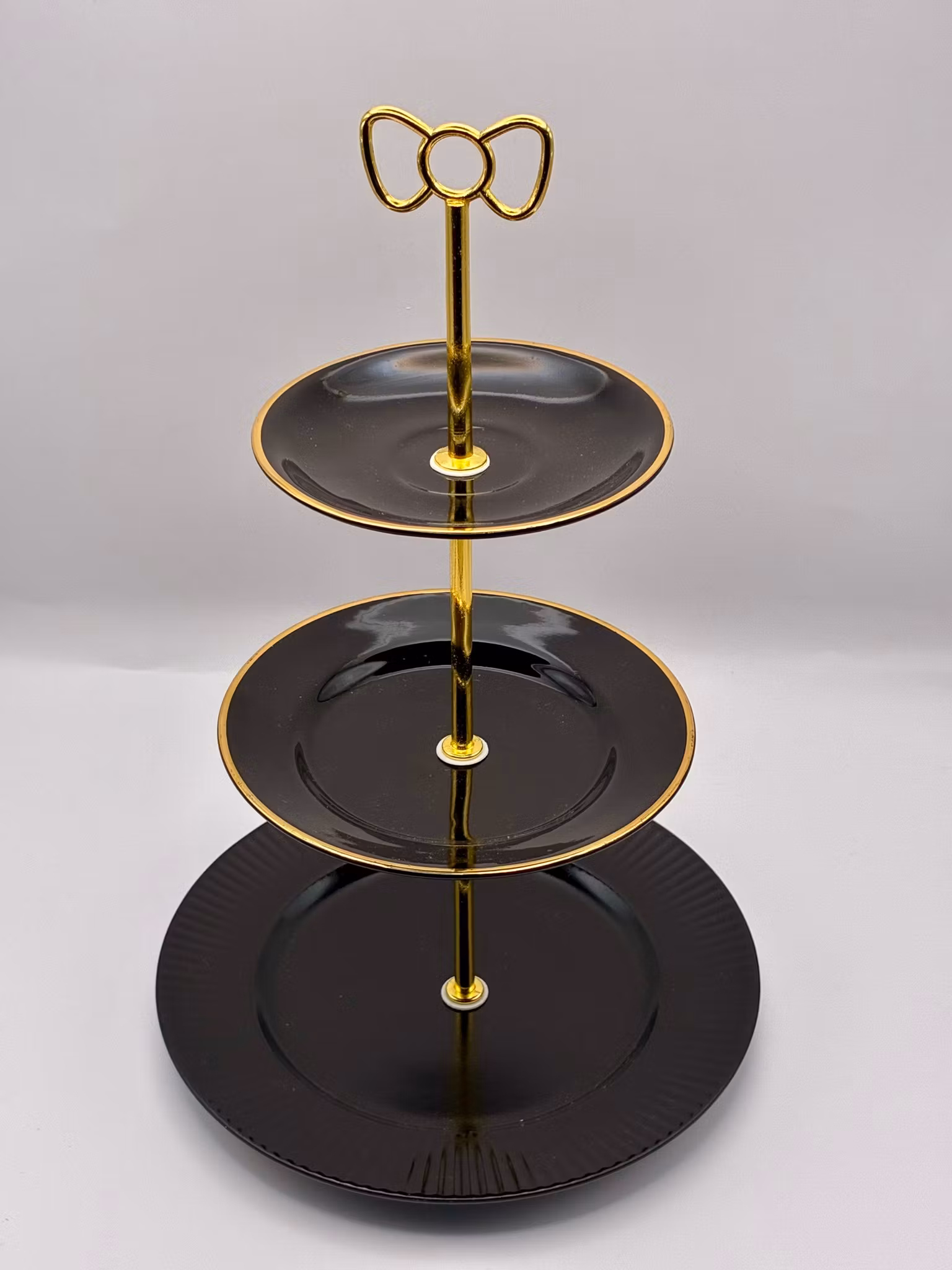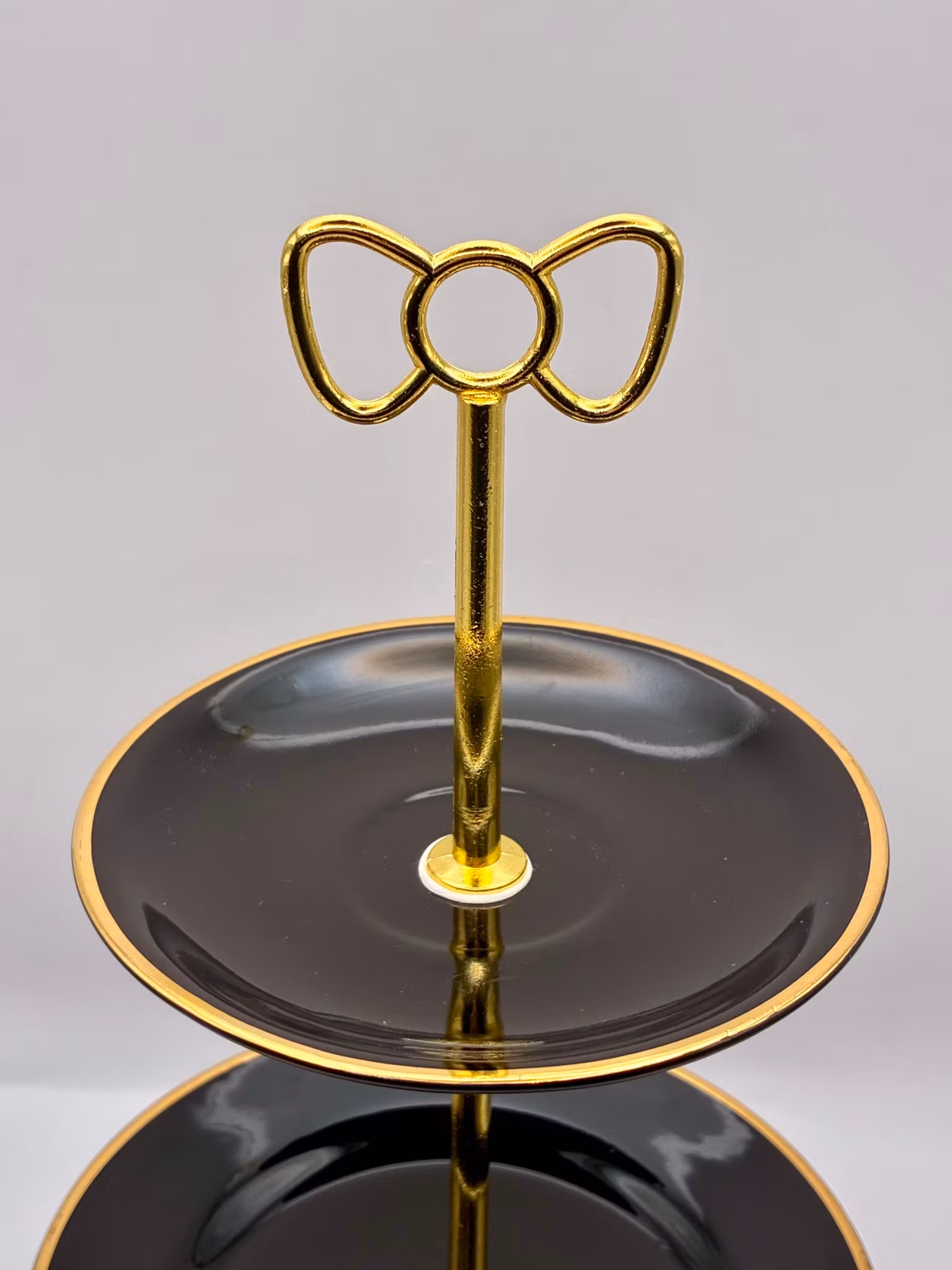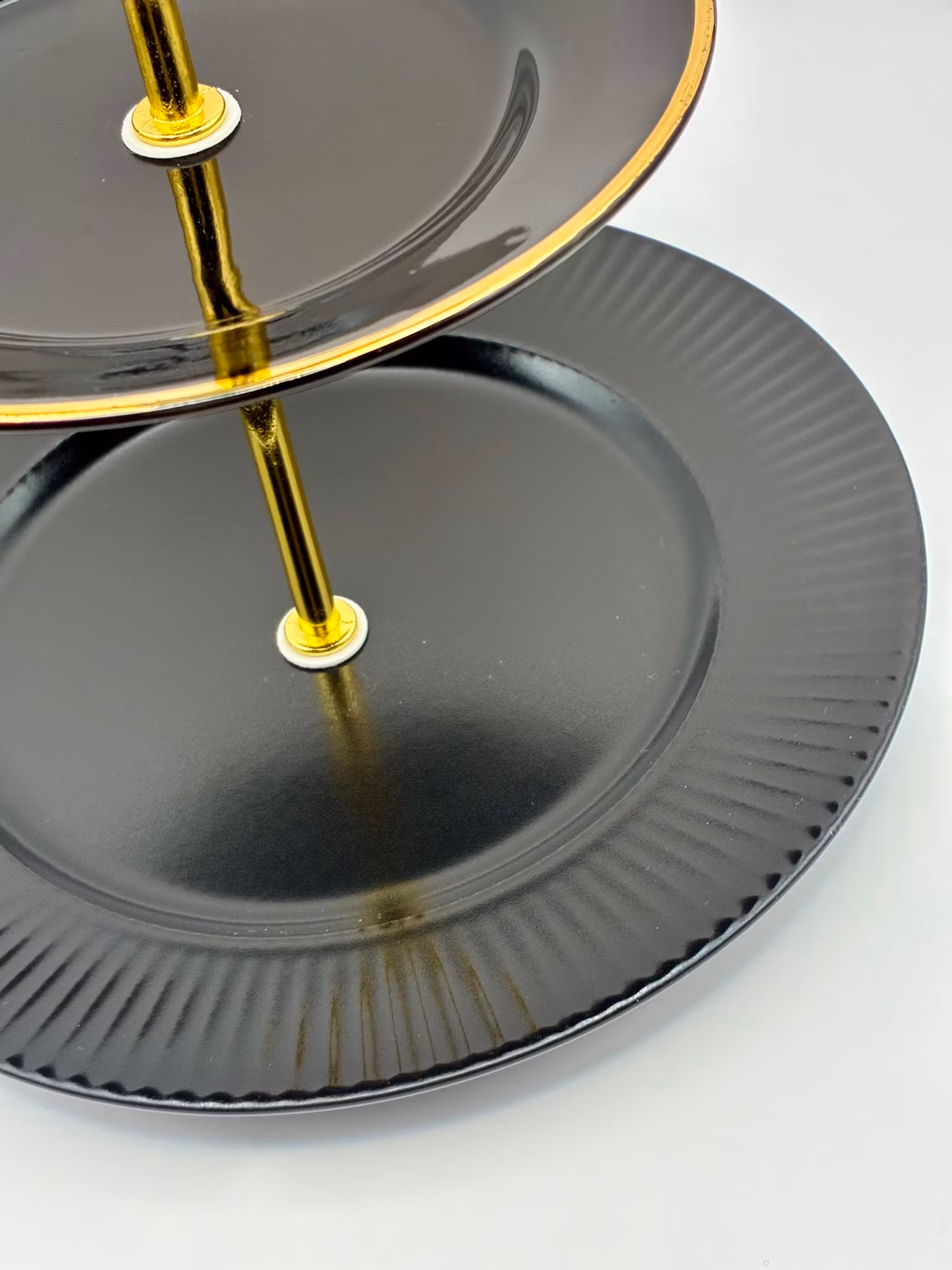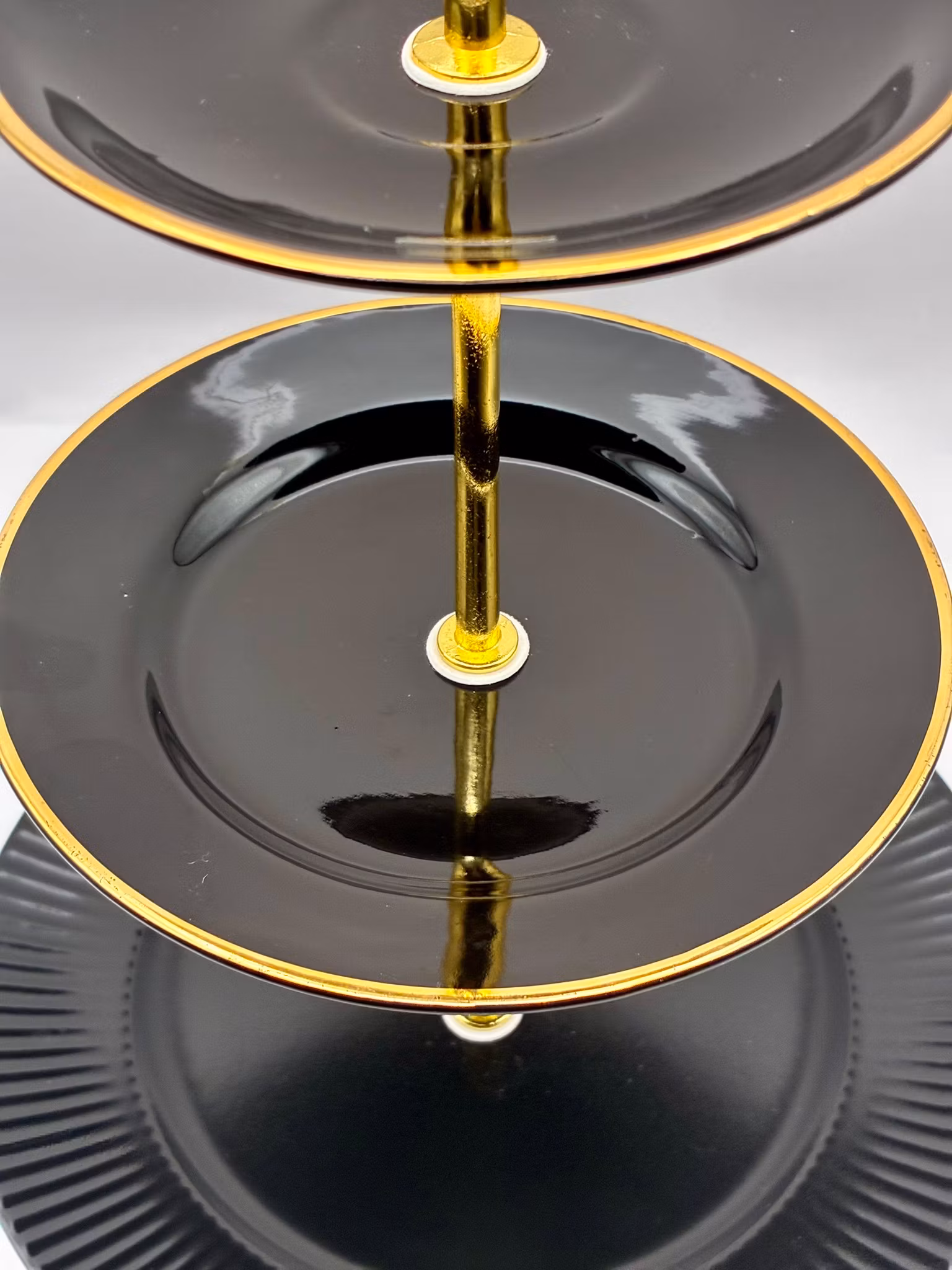 Dette unike treetasjesfatet består av to vintage Egersund Flint-fat kombinert med en ny sort tallerken nederst. Klassisk, luksuriøst og helt unikt – perfekt til småkaker, tapas eller som dekor.