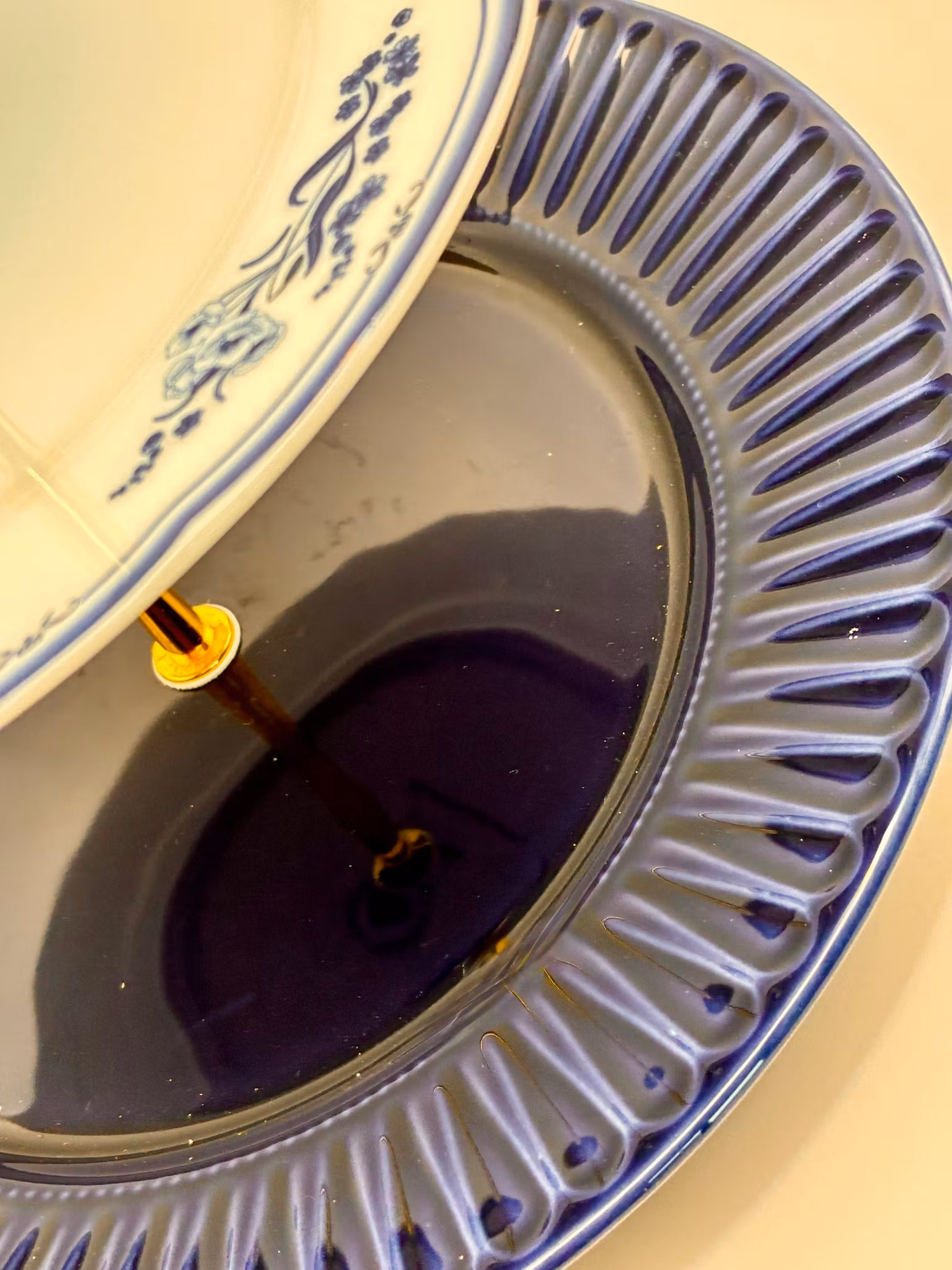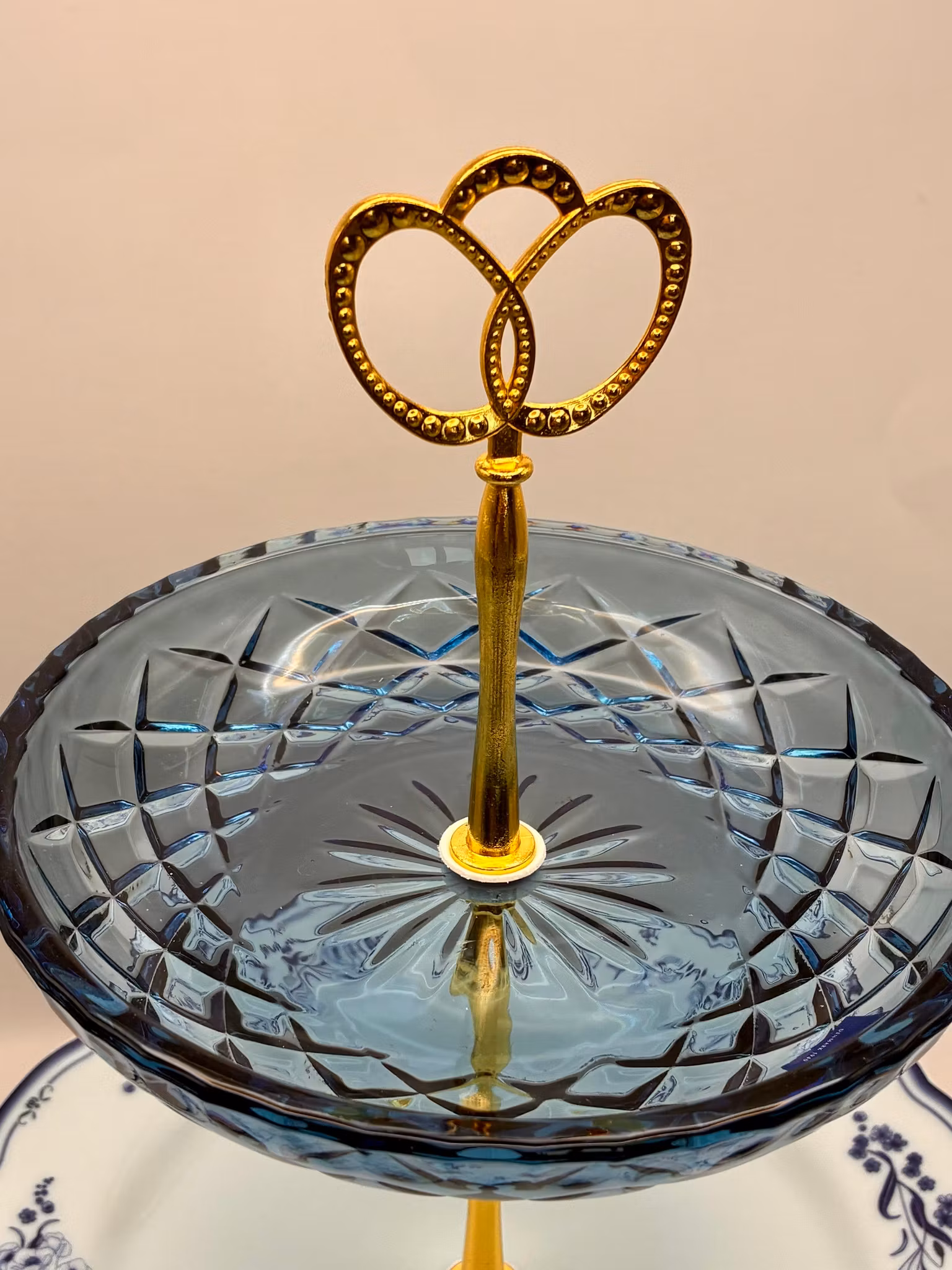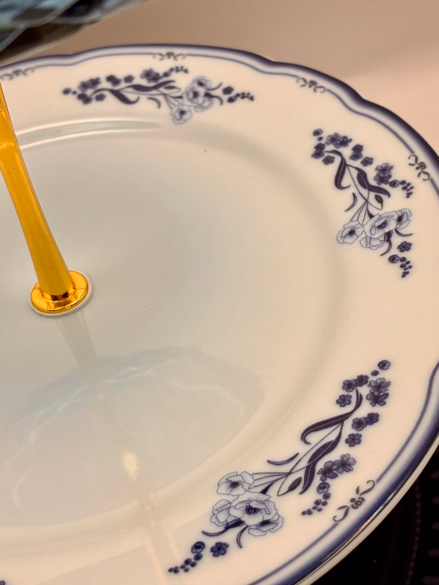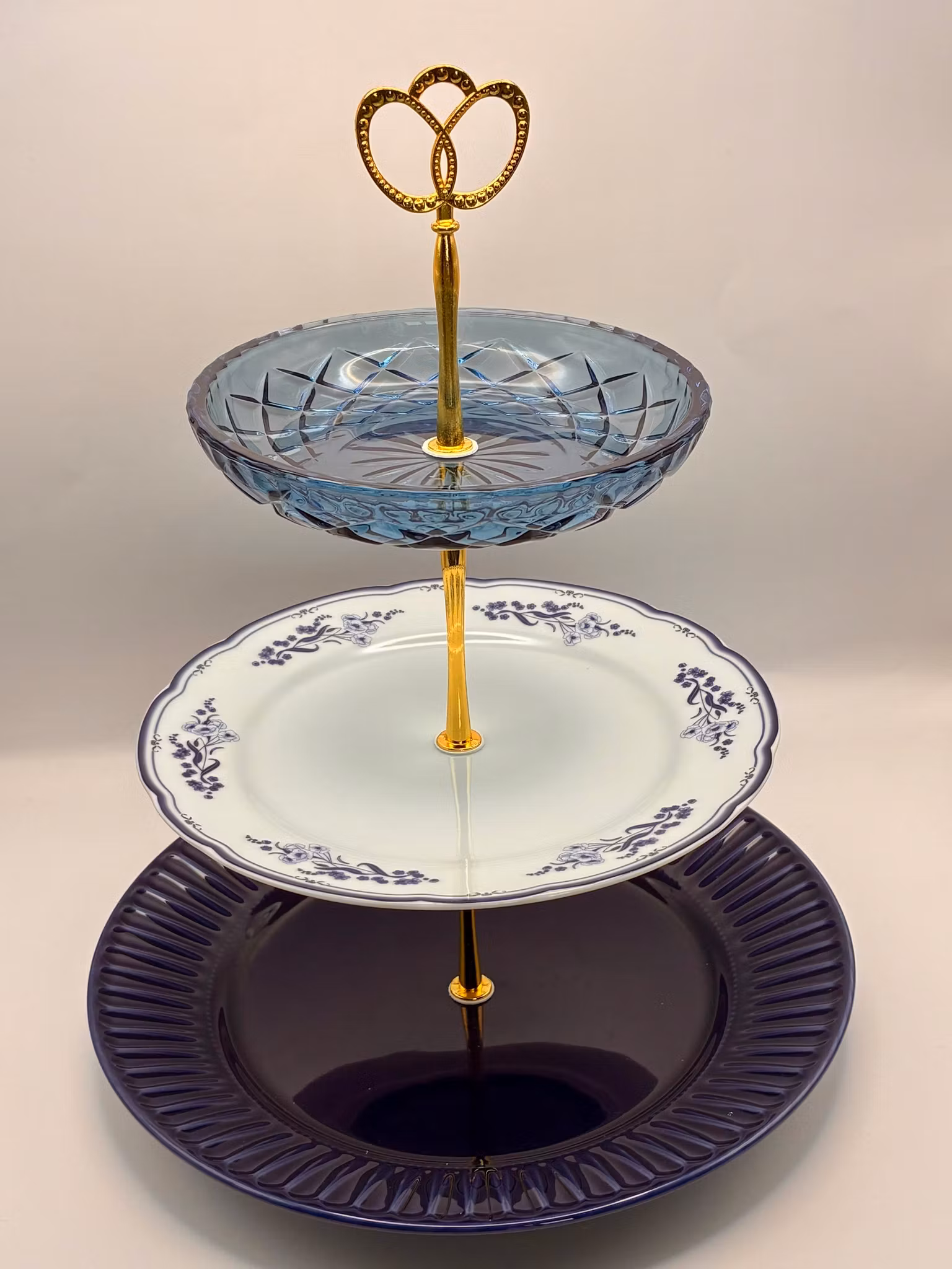 Dette elegante fatet er satt sammen av unike porselensskatter – nederst en ny, midnattsblå tallerken, i midten et vakkert vintagefat fra Firkløveren, på toppen en glassasjett fra Lyngby glass.
