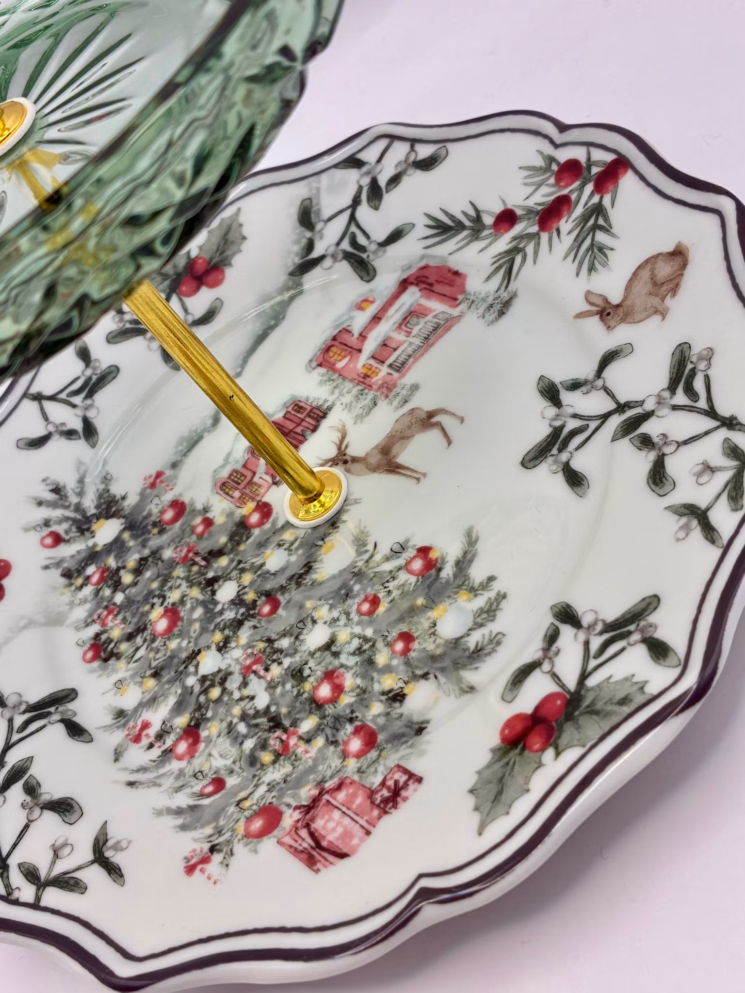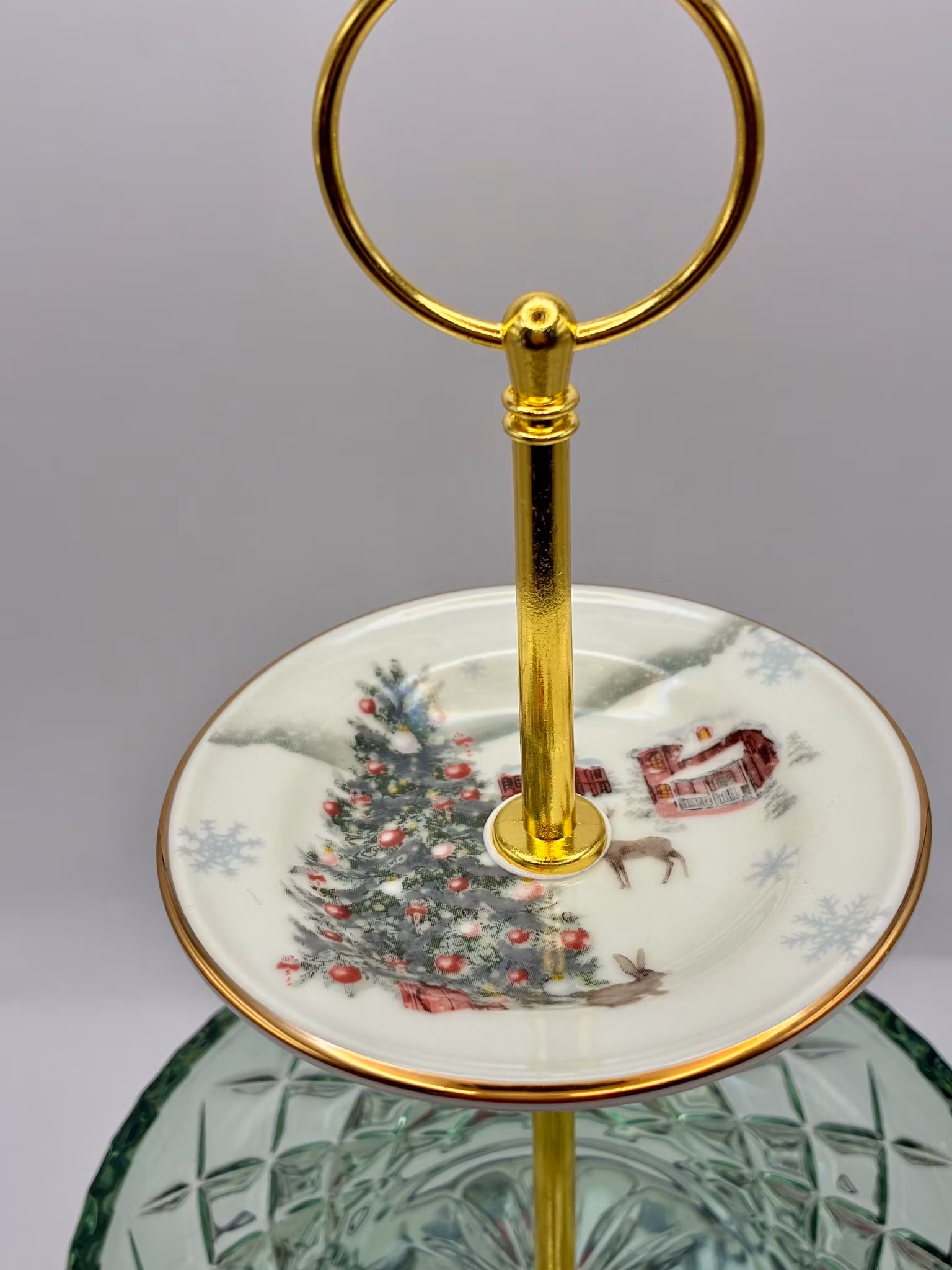 Dette fatet er laget av gjenbruksporselen og glass – med den nederste tallerkenen fra H&M Home sitt populære juleservise. Motivet viser et vakkert pyntet juletre omgitt av gaver, reinsdyr og vinterlandskap – en nostalgisk og varm julestemning i porselen.