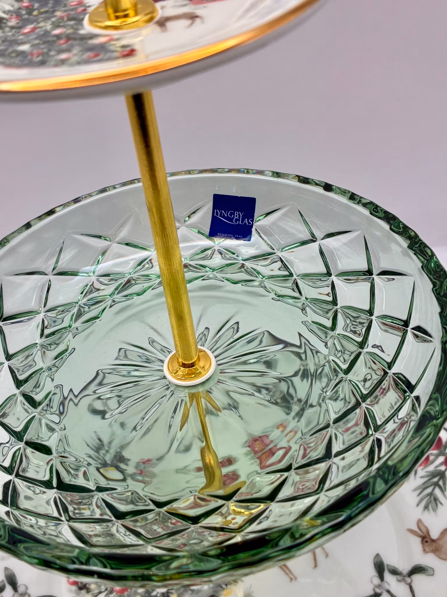 I midten en asjett i grønt pressglass fra danske Lyngby gir en elegant kontrast, mens den lille toppen i samme serviseserie fullfører helheten. Det gullfargede stativet binder det hele sammen og gir fatet et eksklusivt uttrykk.
