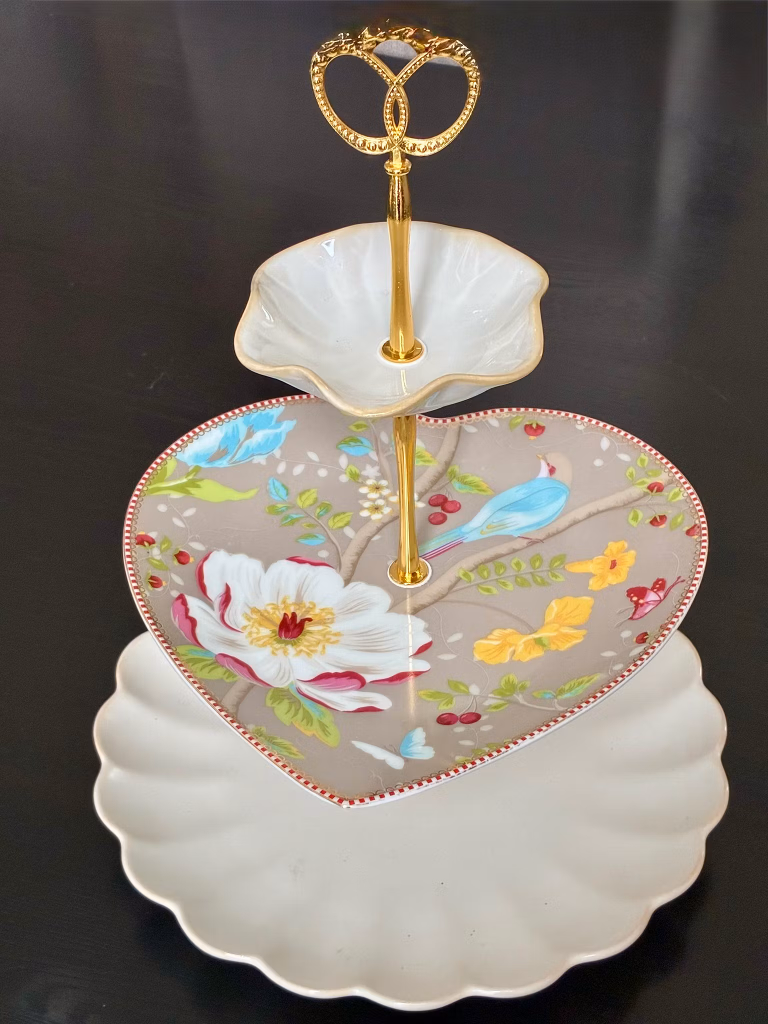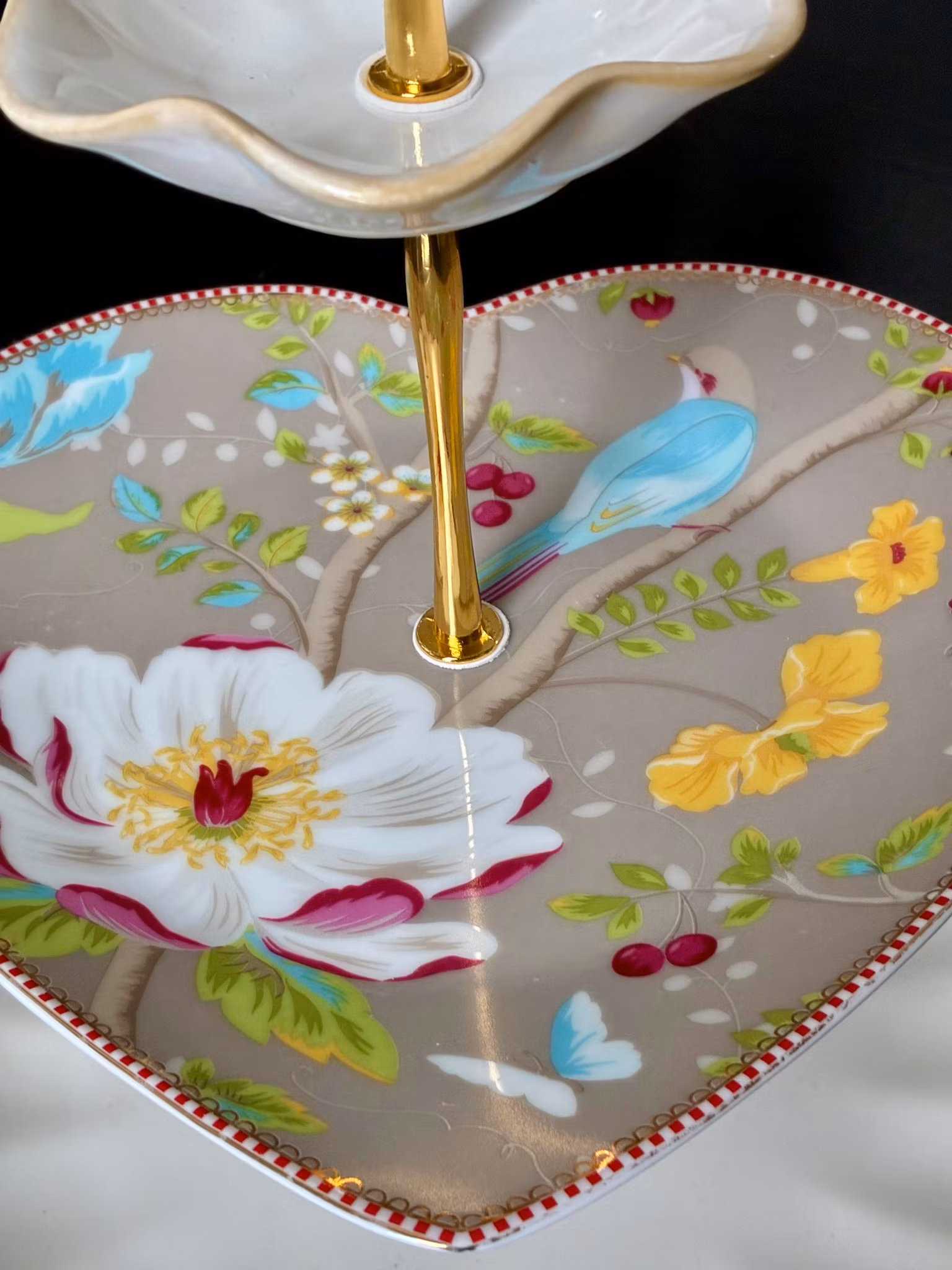 I midten finner du et nydelig hjerteformet fat fra PIP Studio – Chinese Garden, med blomster, fugl og delikate detaljer som gir et lekent og romantisk uttrykk.