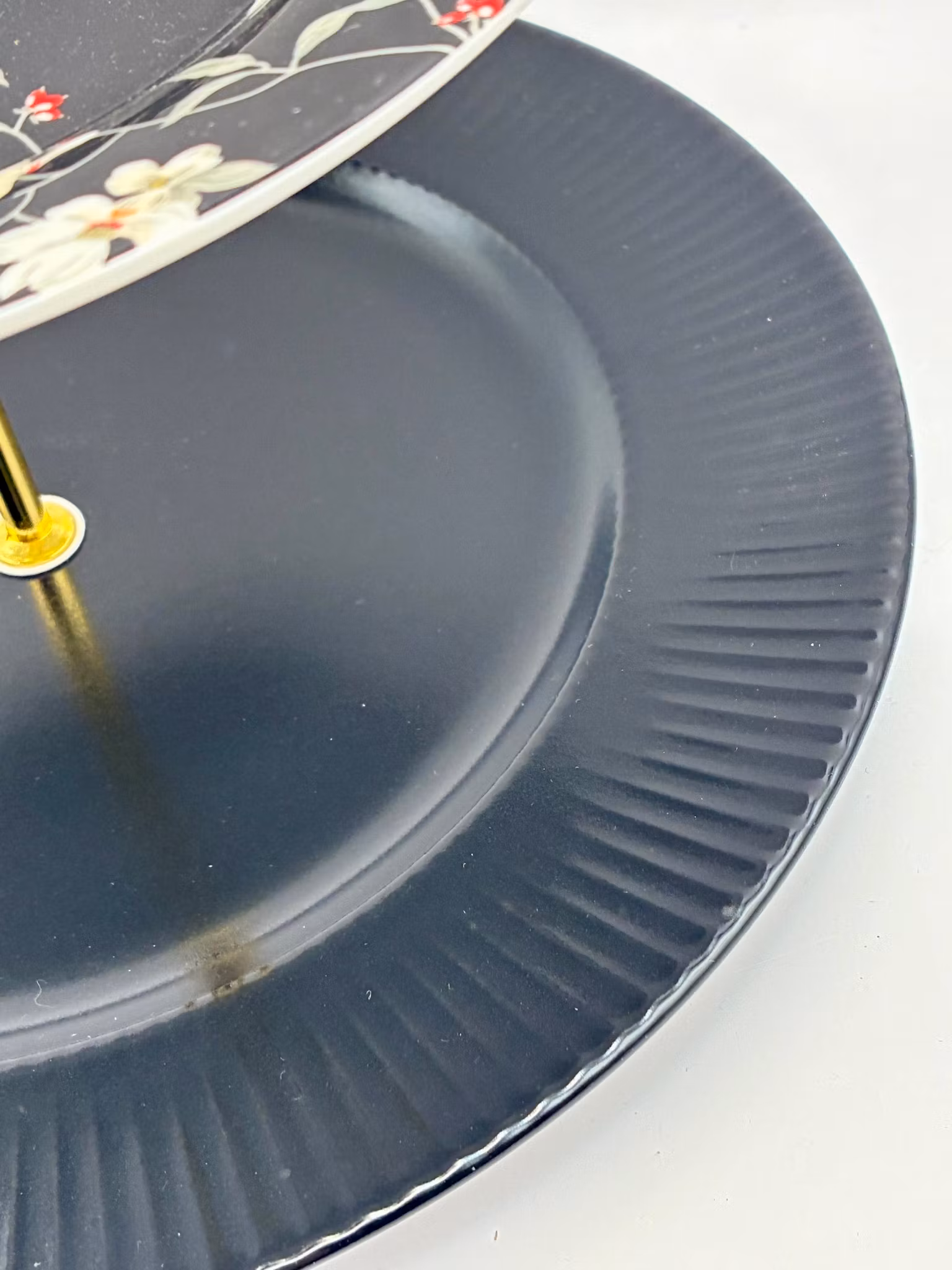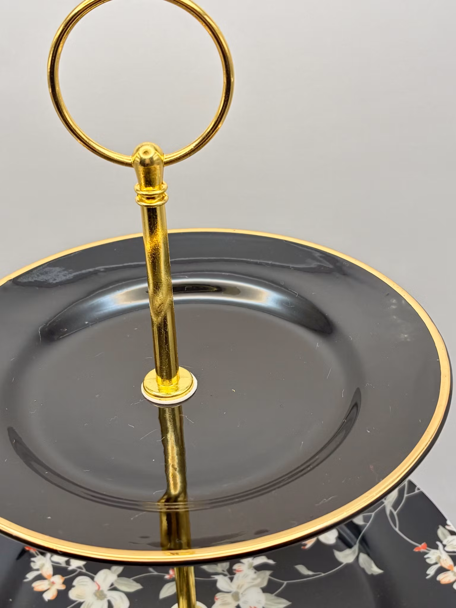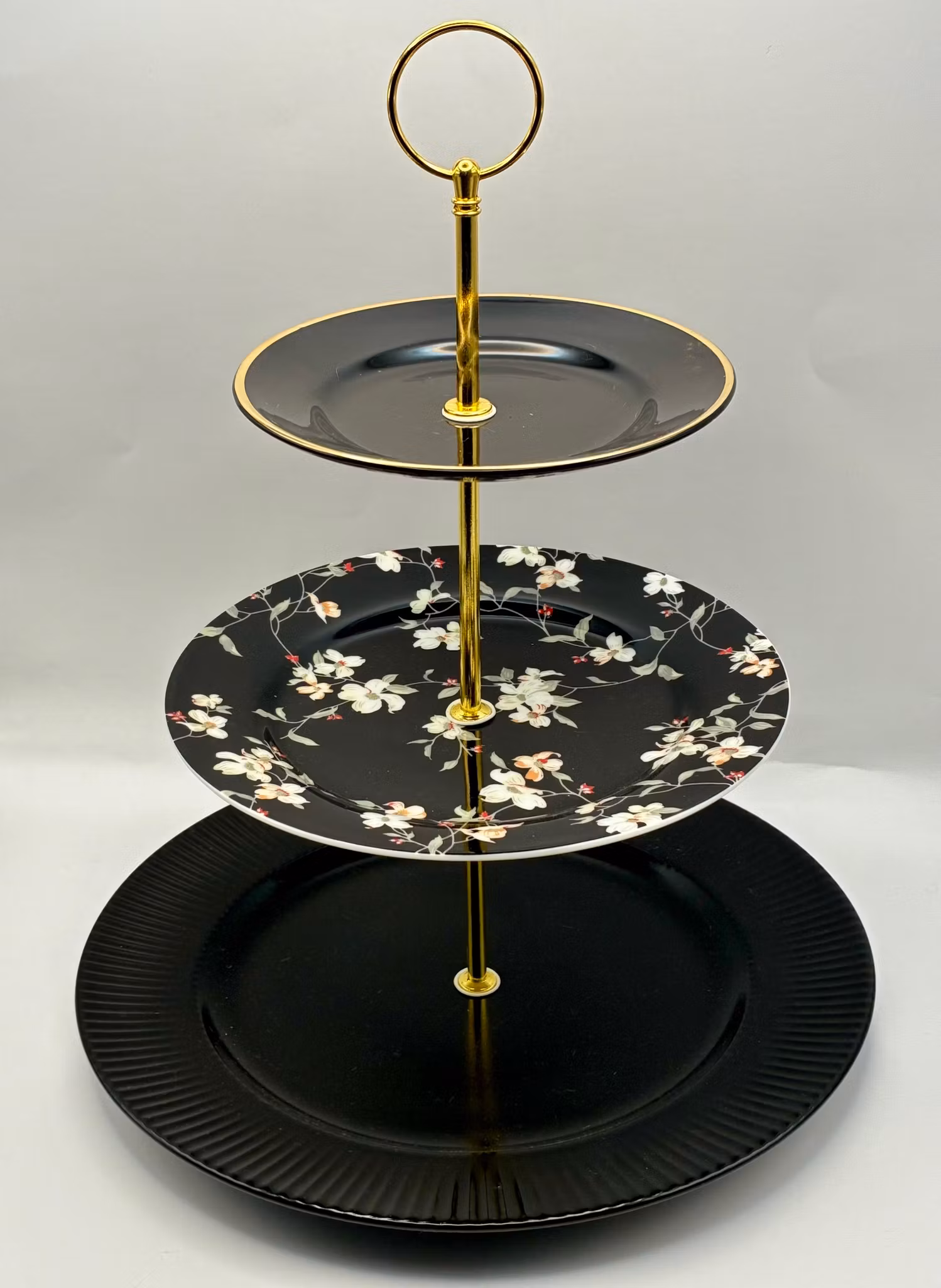 Dette tredelte etasjefatet er satt sammen av vakre tallerkener i sort, med et delikat blomstermønster på midten som gir en sofistikert kontrast. De gullfargede stengene løfter helhetsinntrykket og gjør fatet til et blikkfang på bordet.
