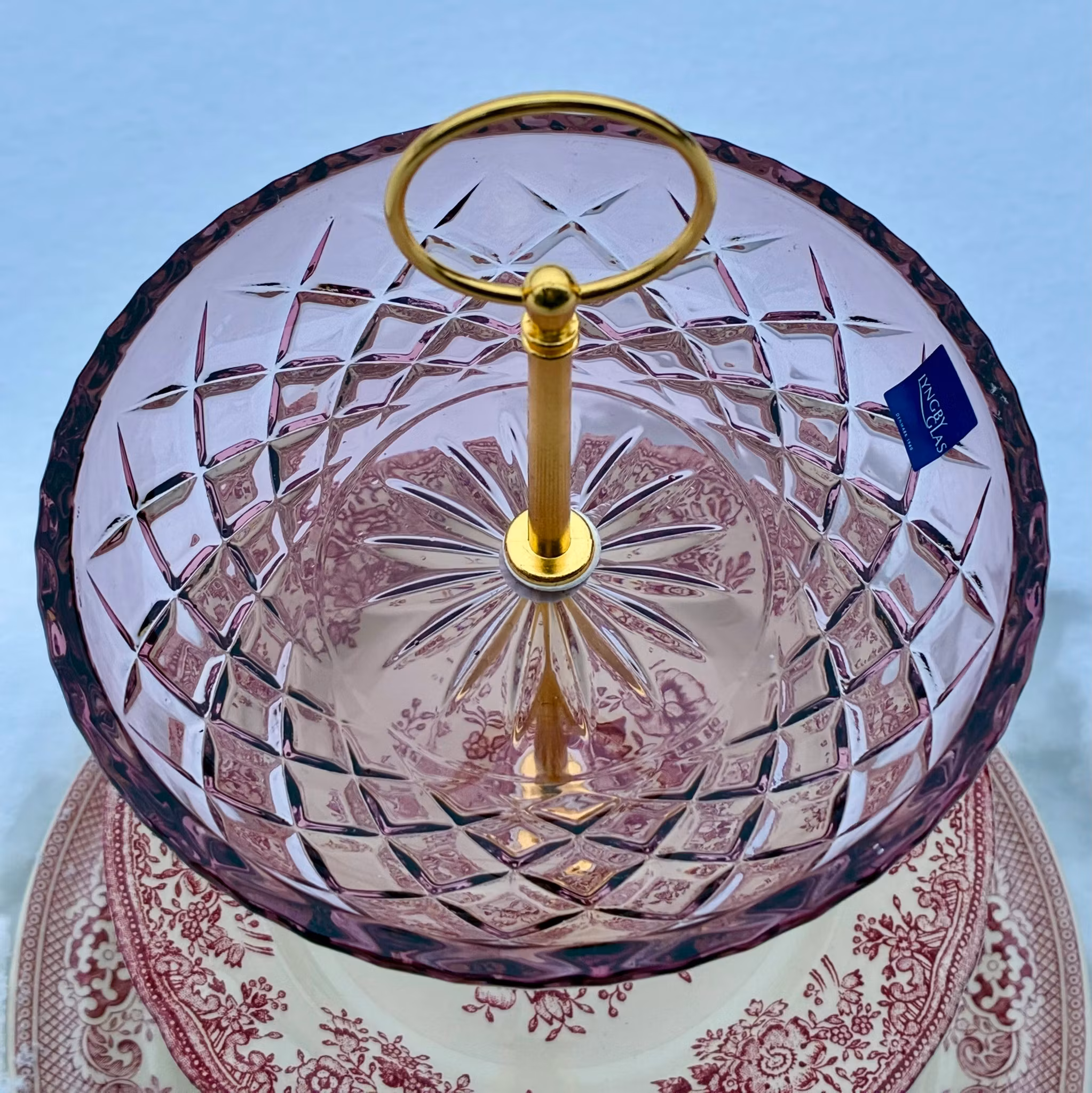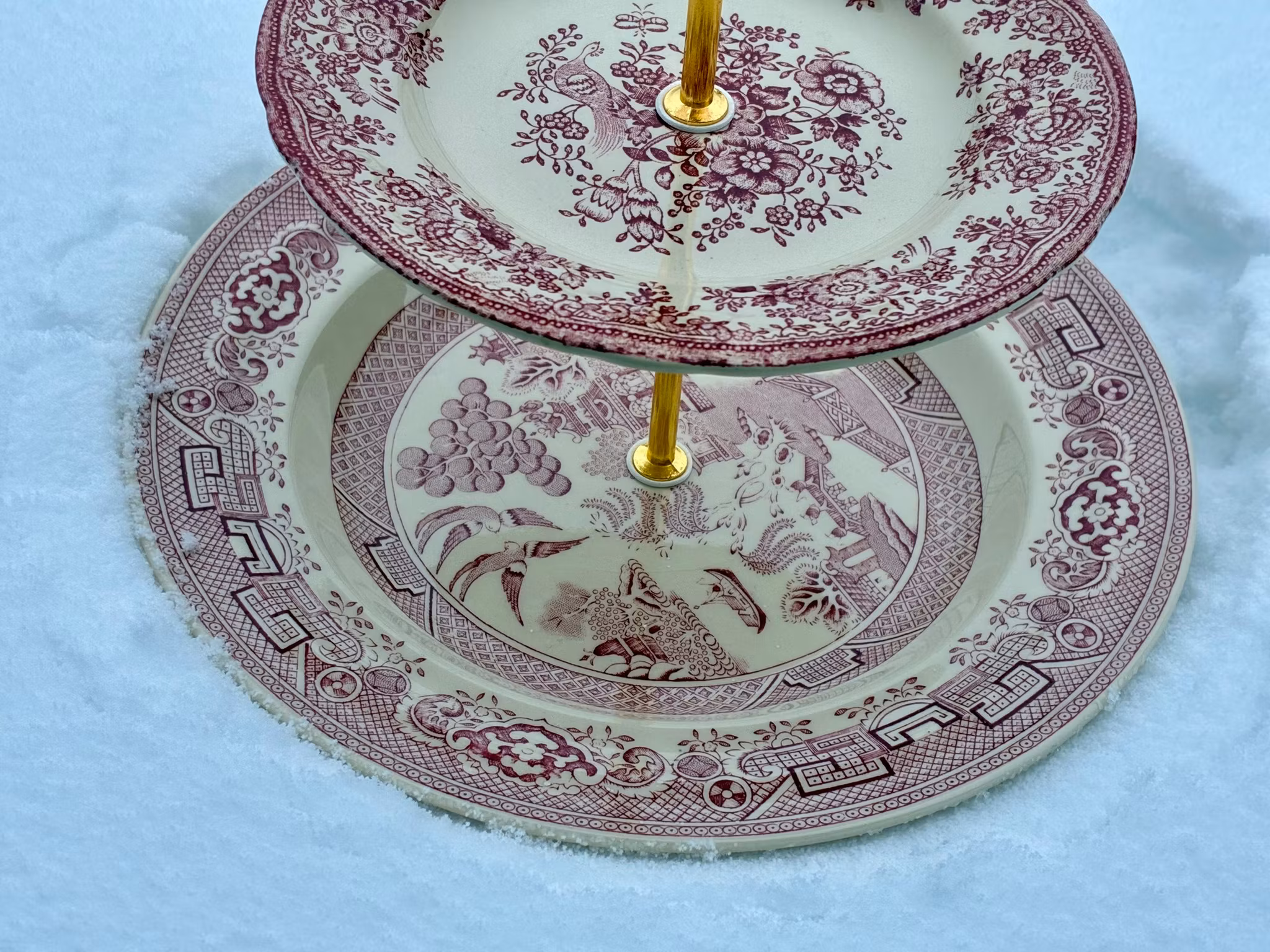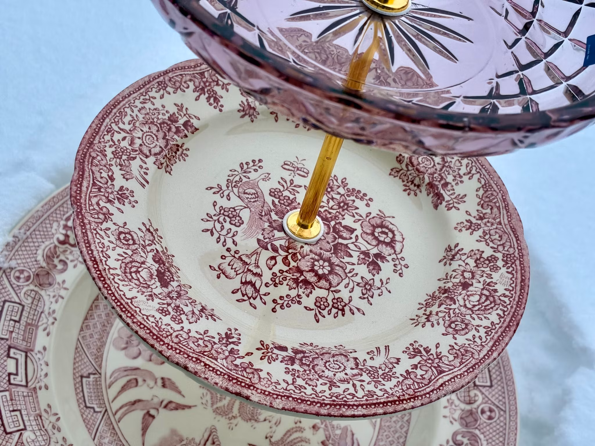 Dette elegante etasjefatet er en vakker kombinasjon av klassisk svensk porselen og moderne glass. De nederste etasjene er laget av Old Gustavsberg med rikt, rødt transfermønster – fullt av detaljer og historie. På toppen troner en ny asjett i glass fra Lyngby, som gir fatet et lett, elegant og litt overraskende uttrykk.