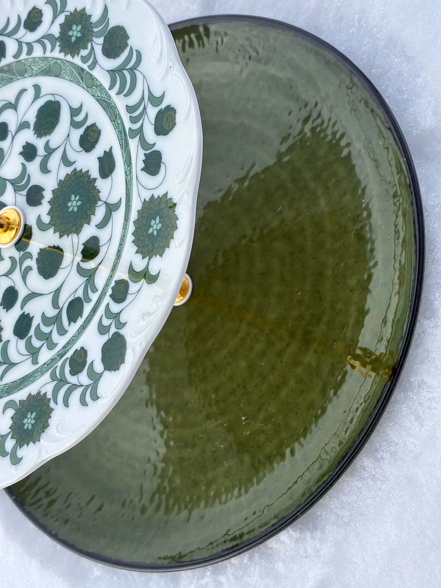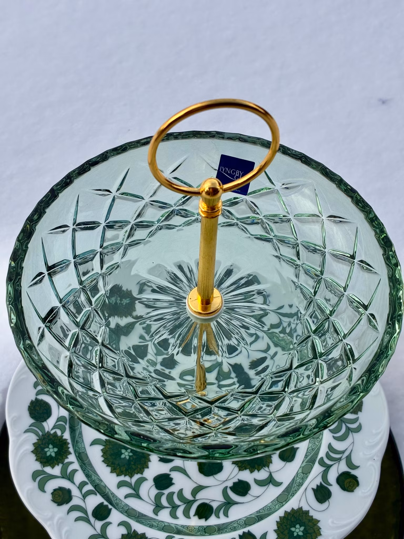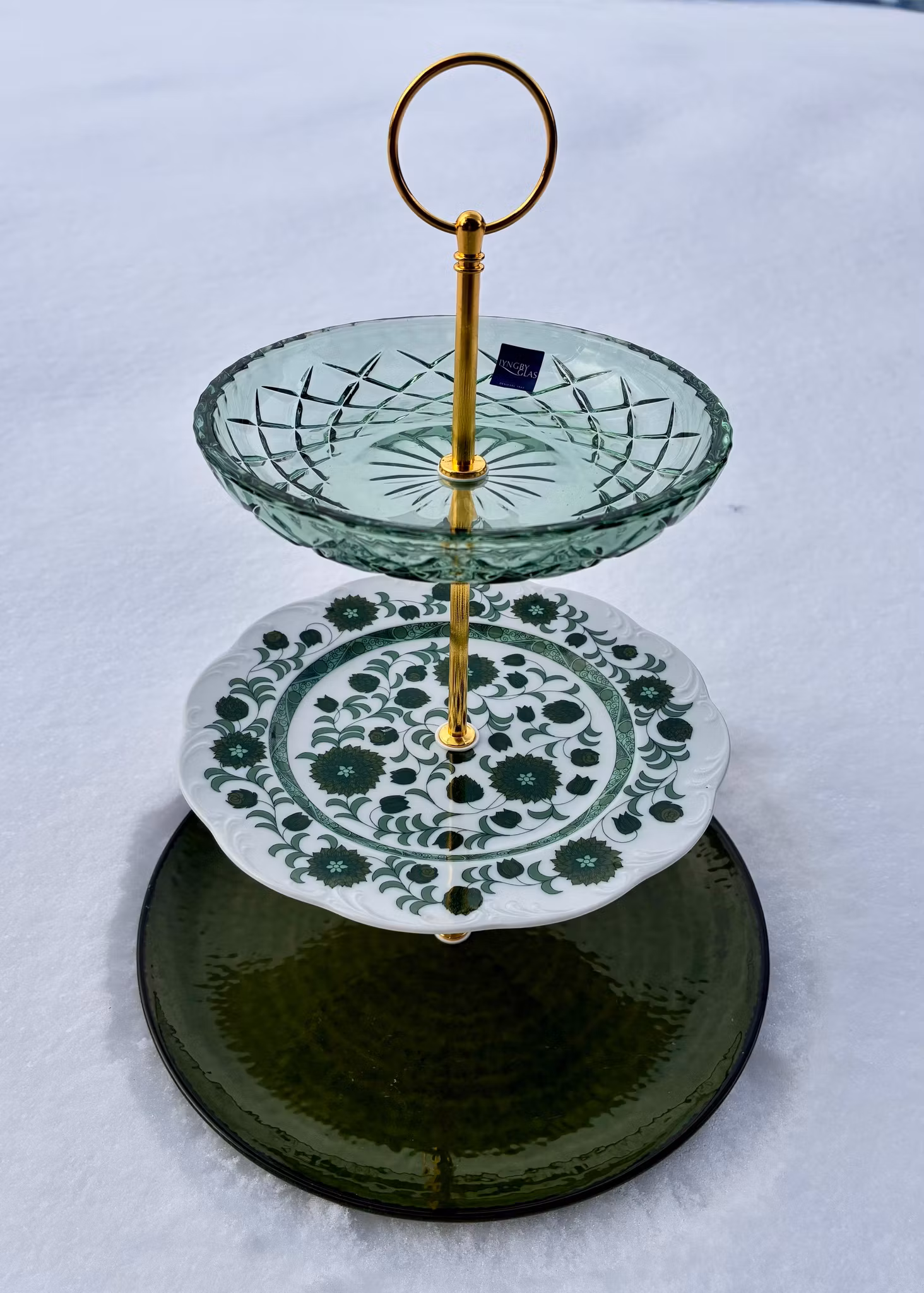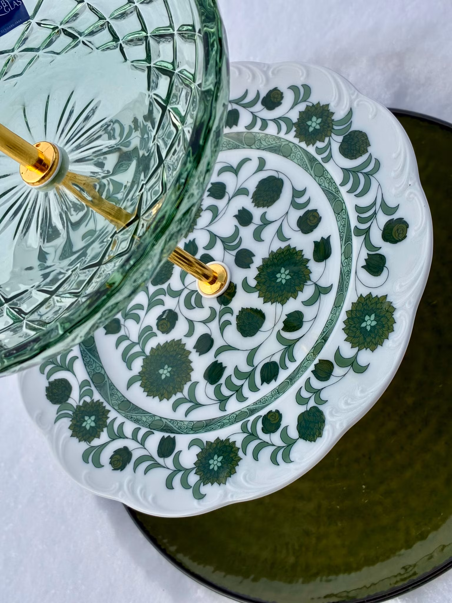 I midten finner du en eldre porselenstallerken fra Rosenthal – med et klassisk grønt blomstermønster som gir varme og historie. Nederst en grønn tallerken fra IKEA som gir tyngde og ro til helheten. På toppen troner en ny glassasjett fra danske Lyngby Glas med et vakkert mønster som fanger lyset.