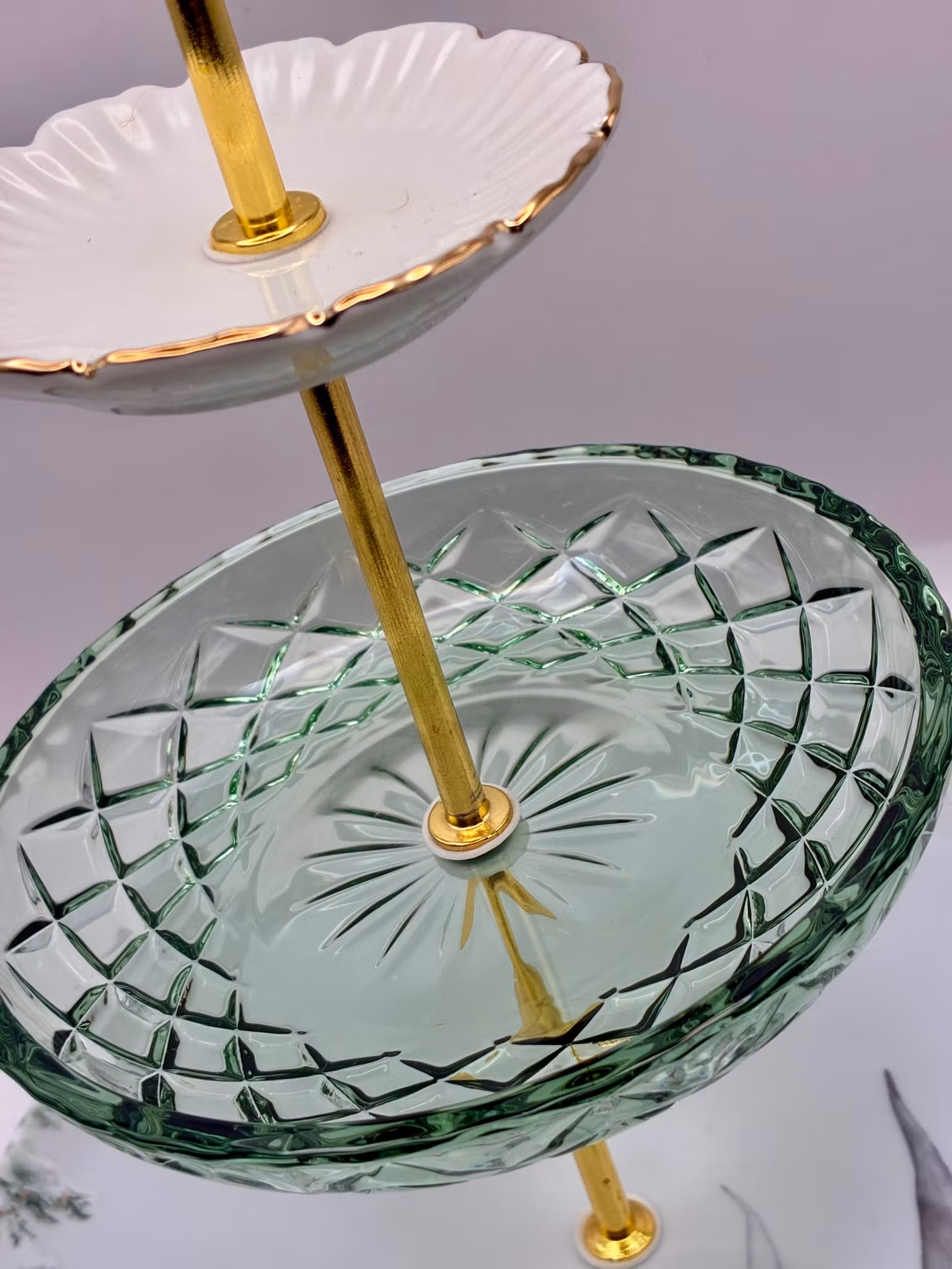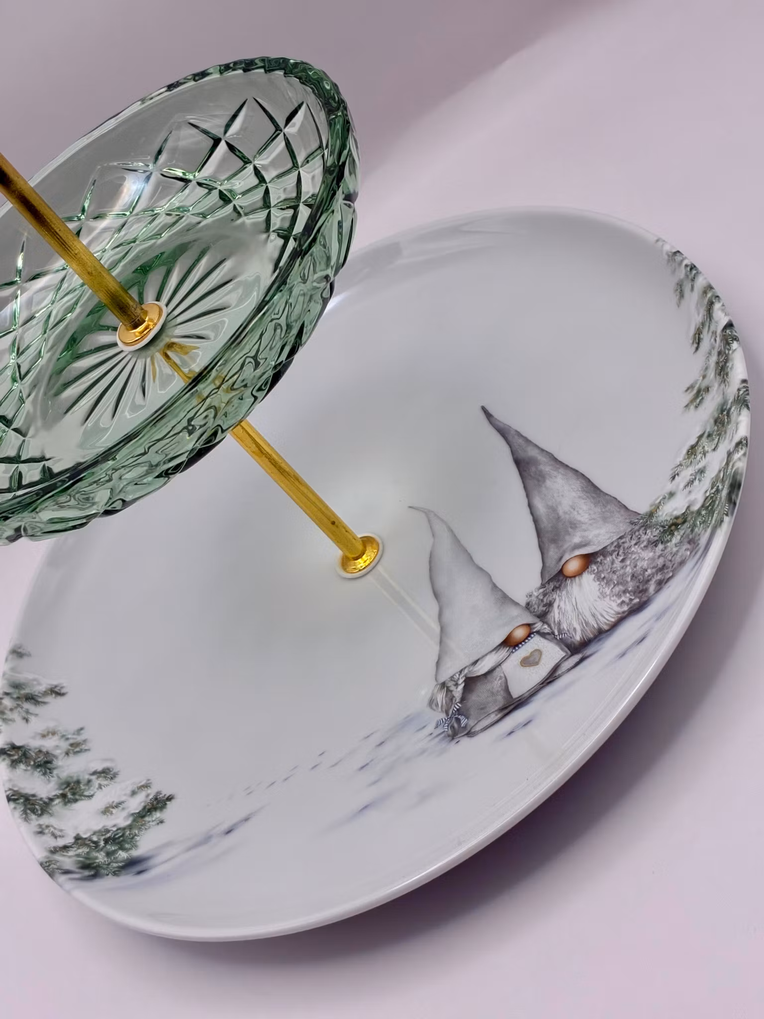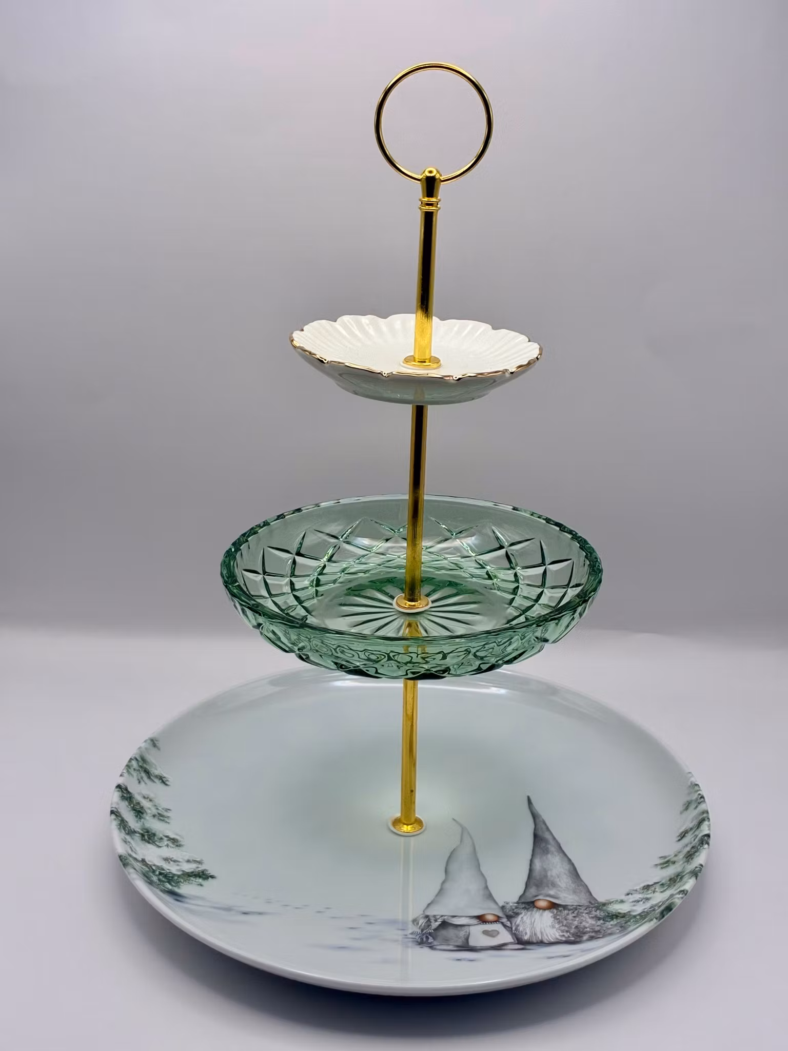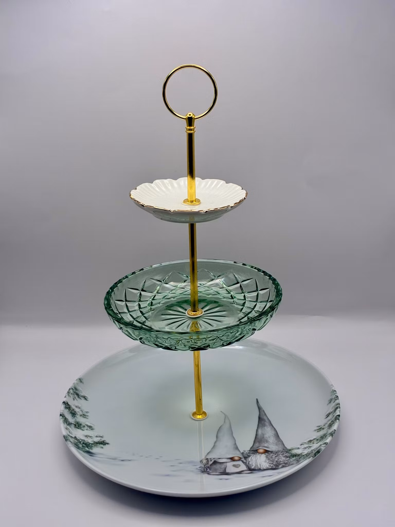 Et stemningsfullt etasjefat satt sammen av vakre gjenbruksskatter. Nederste fat er fra Åsas jul – en nostalgisk og ettertraktet juleserie fra Firkløveren. Kombinasjonen av porselen og glass, sammen med gullstativet, gir et uttrykk som både er koselig, klassisk og helt unikt.