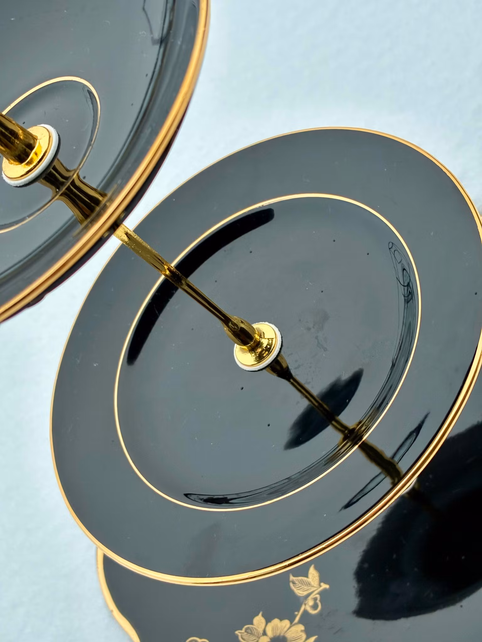 Dette nydelige etasjefatet er laget av klassisk servise fra Egersund Porselen, kjent for sin tidløse kvalitet og elegante uttrykk. Den dype sorte glasuren kombinert med delikate gullkanter og blomsterdekor gir fatet et eksklusivt og sofistikert preg.