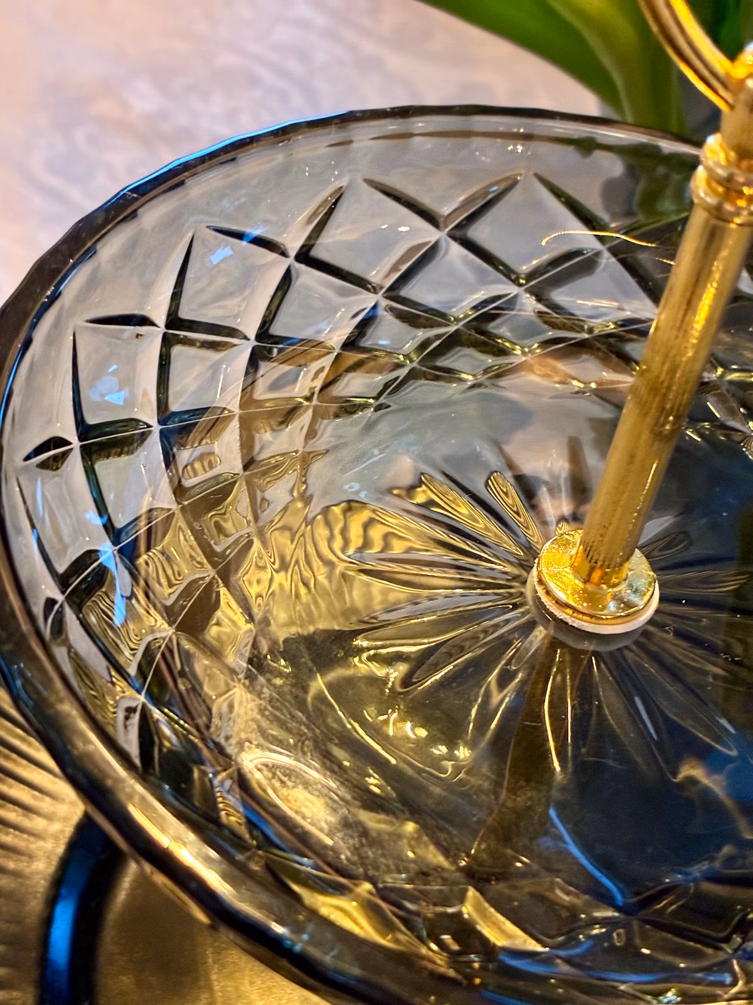 Dette stilrene etasjefatet er laget av nye deler, og kombinerer dype sorte tallerkener med riflet kant og et vakkert pressglassfat øverst. Det klare glasset gir et lett og eksklusivt uttrykk, mens det gullfargede stativet med hjerteformet topp tilfører en varm og romantisk kontrast.