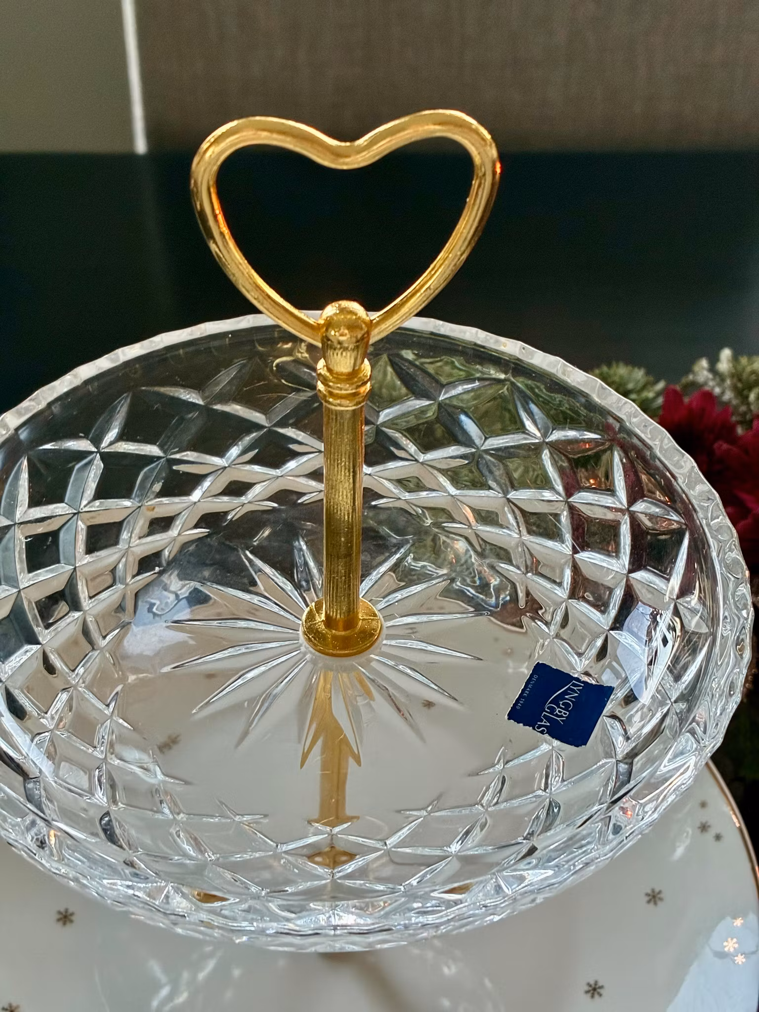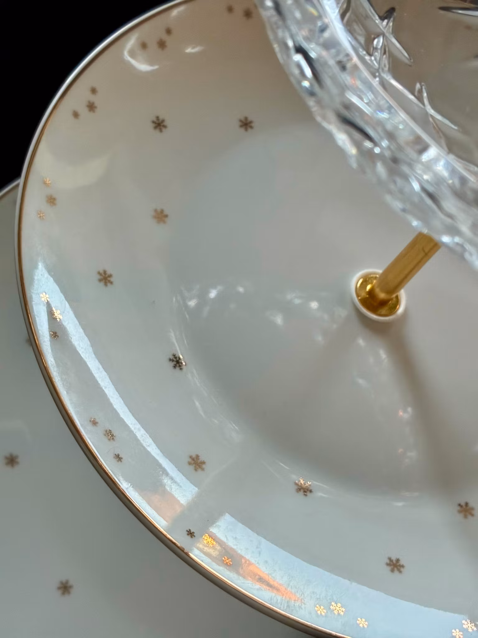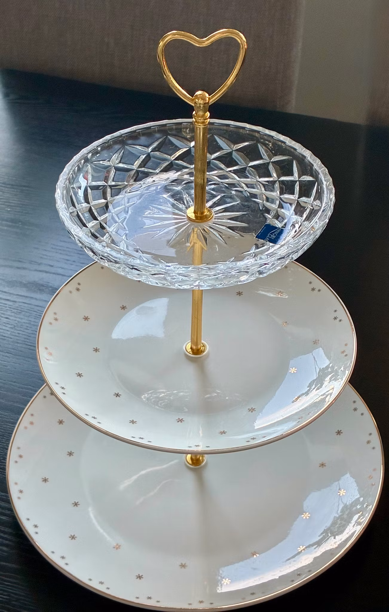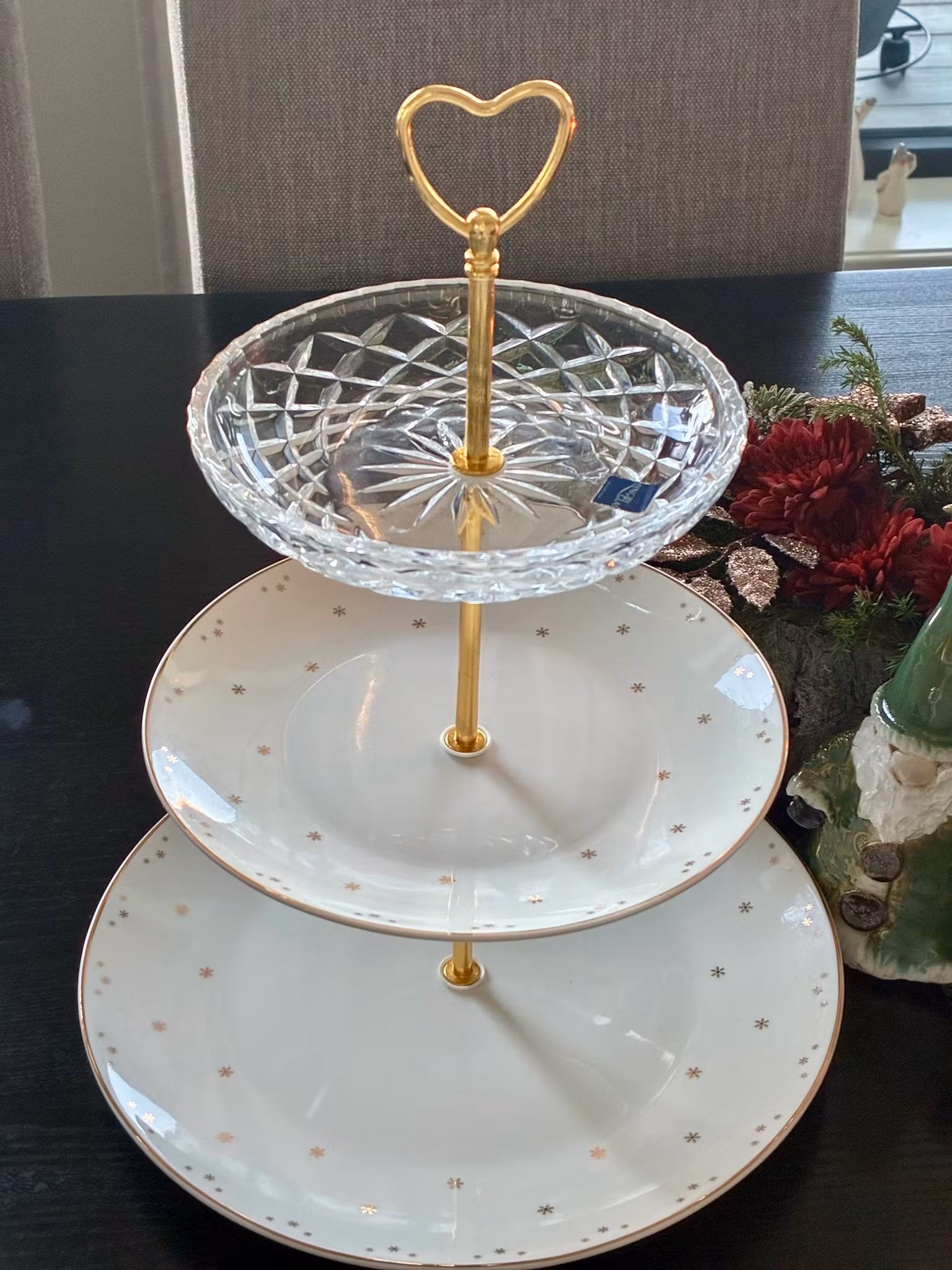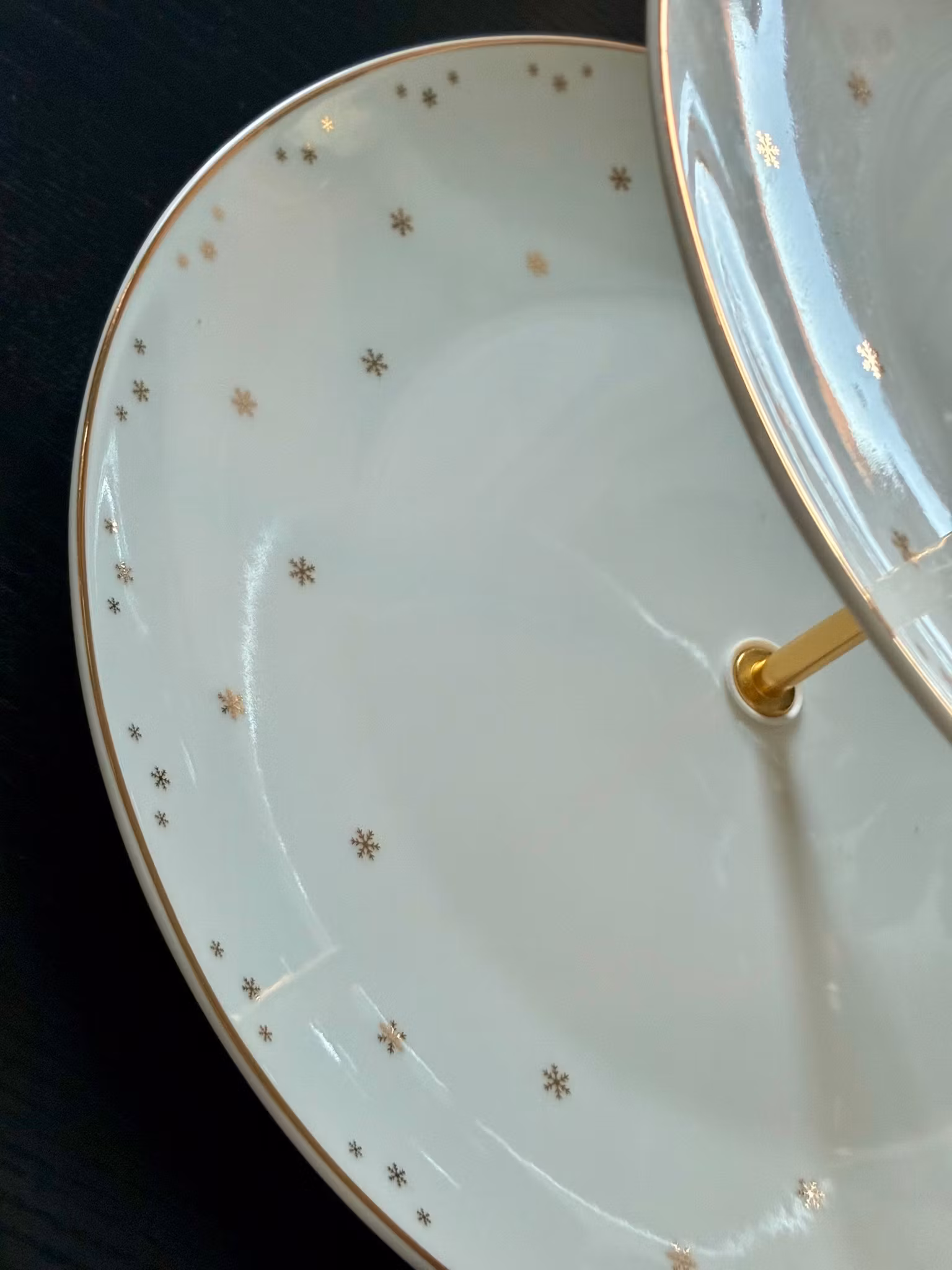 Et elegant og tidløst etasjefat laget av nye deler. Stjernehimmel er et servise fra Kremmerhuset med gulldetaljer gir bordet et sofistikert og stjernesprakende preg. Perfekt til festmåltider og høytider. Kombinert med et gullfarget stativ får et luksuriøst uttrykk.