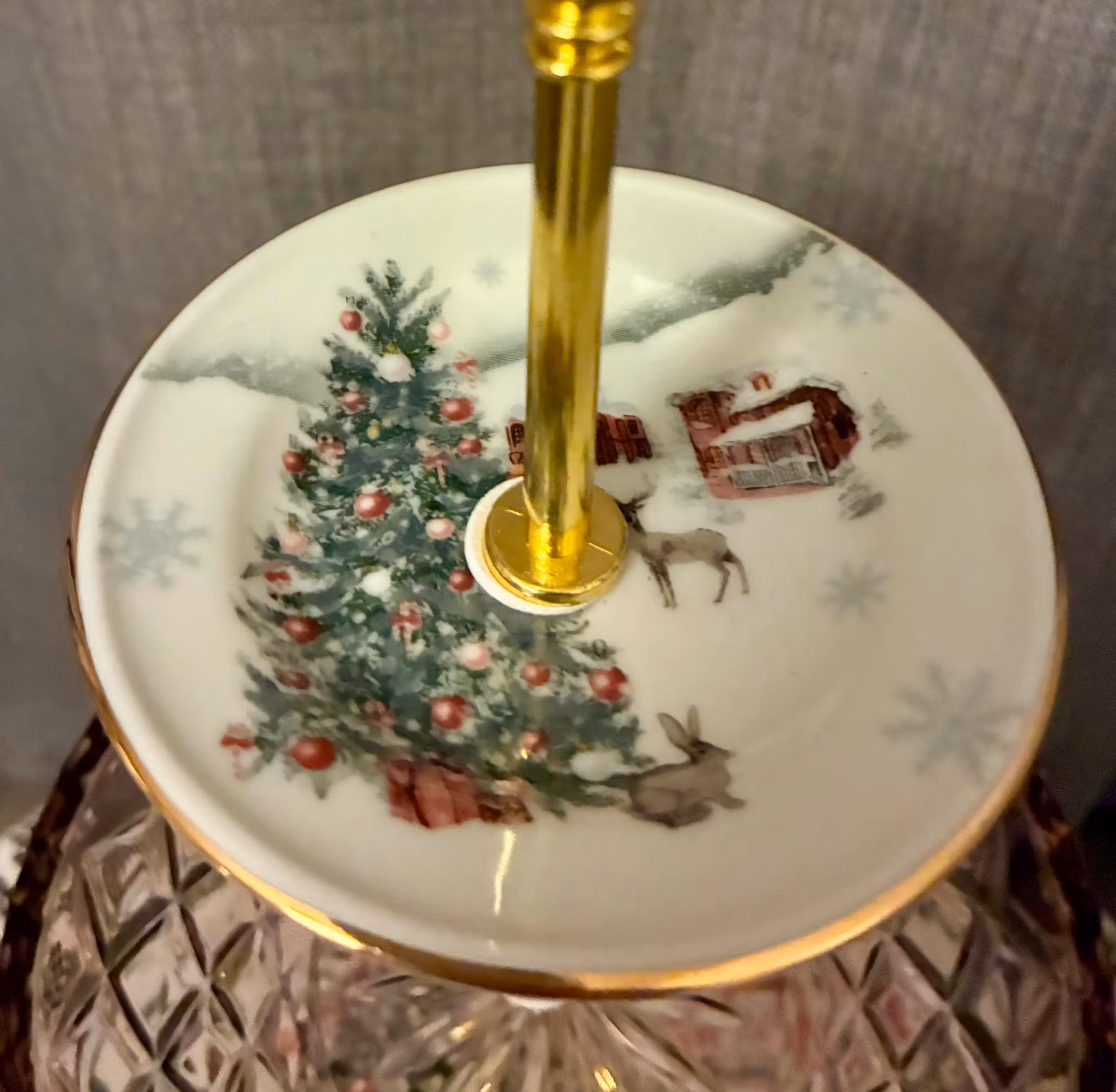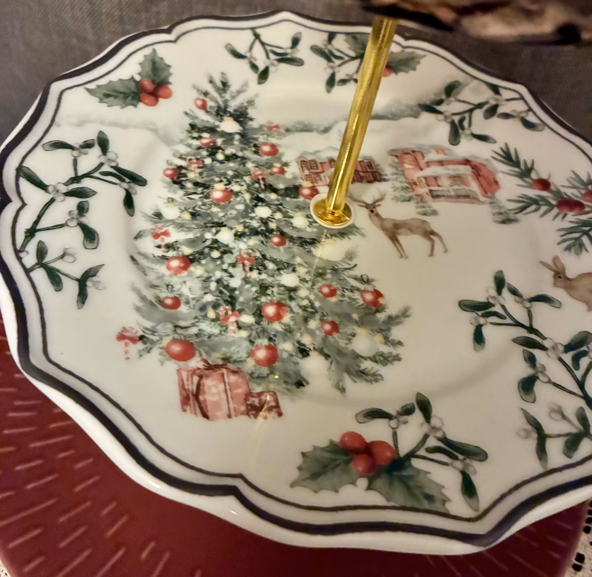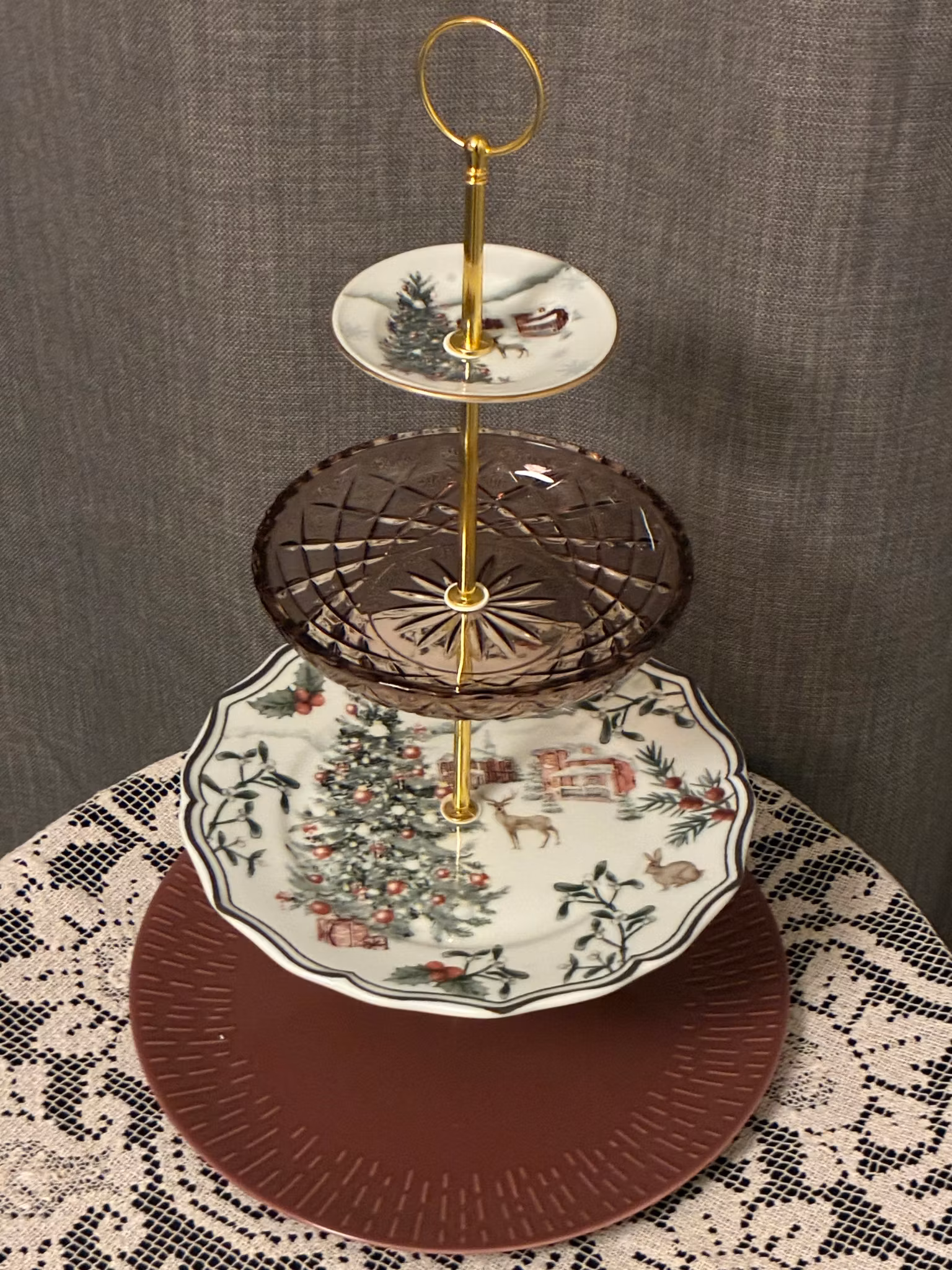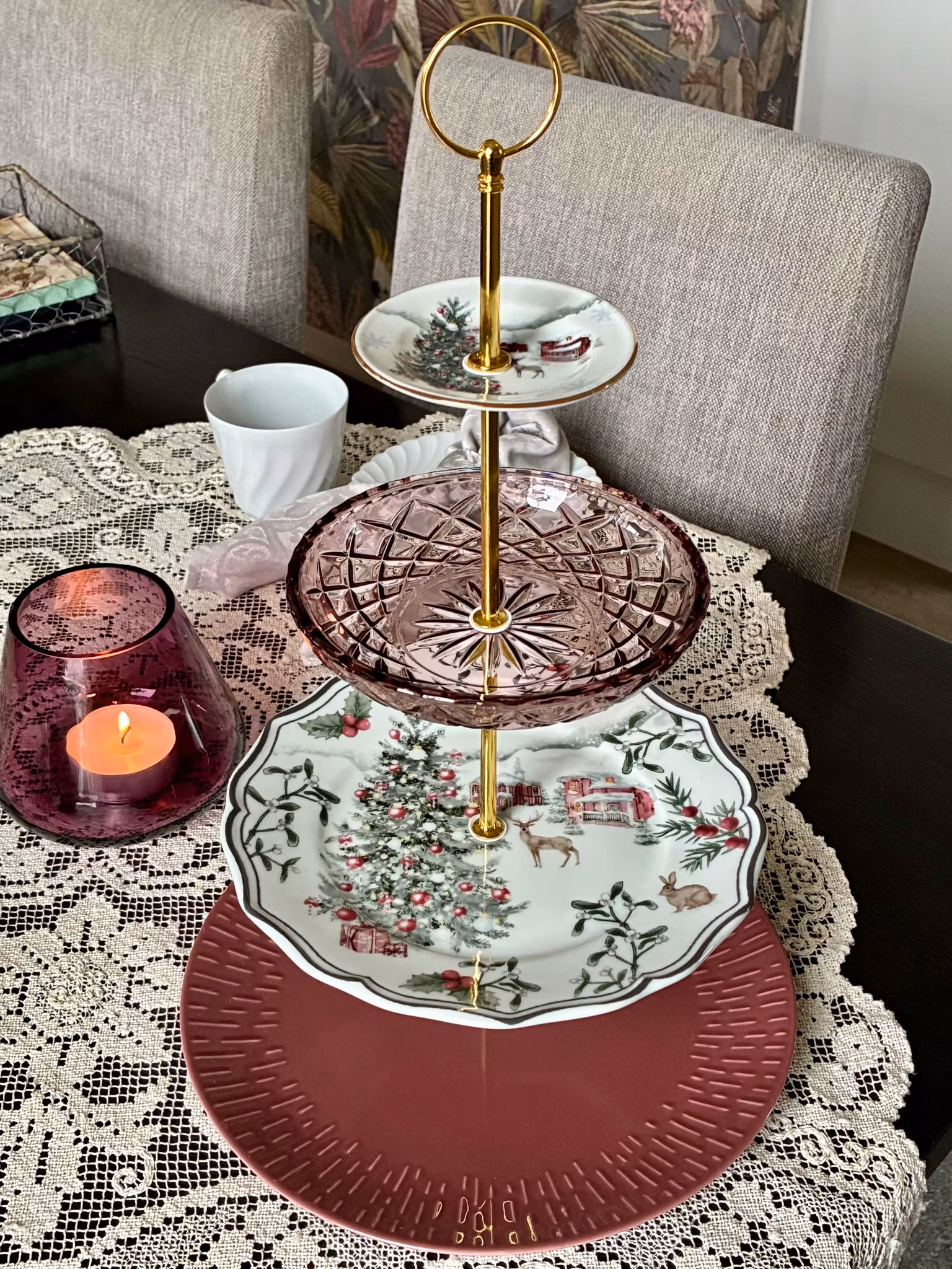 Nederst finner du en dyp rød tallerken fra aida, confetti life in colour , i midten en nydelig tallerken med julemotiv fra H&M Home og en glassasjett fra Lyngby glass. På toppen en nydelig liten tallerken med vintermotiv – alt bundet sammen med et gullfarget stativ som gir et elegant og festlig uttrykk.