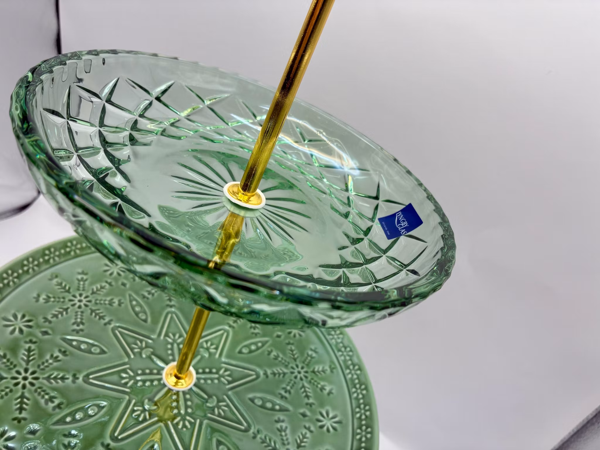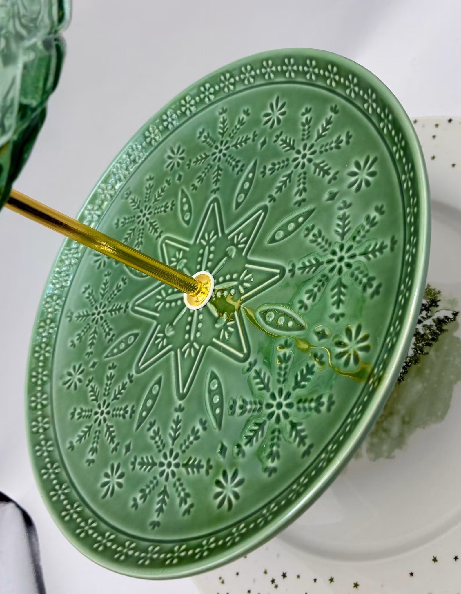 Et elegant etasjefat i duse grønne og hvite toner, med vintermotiv nederst og hvite og grønne detaljer.