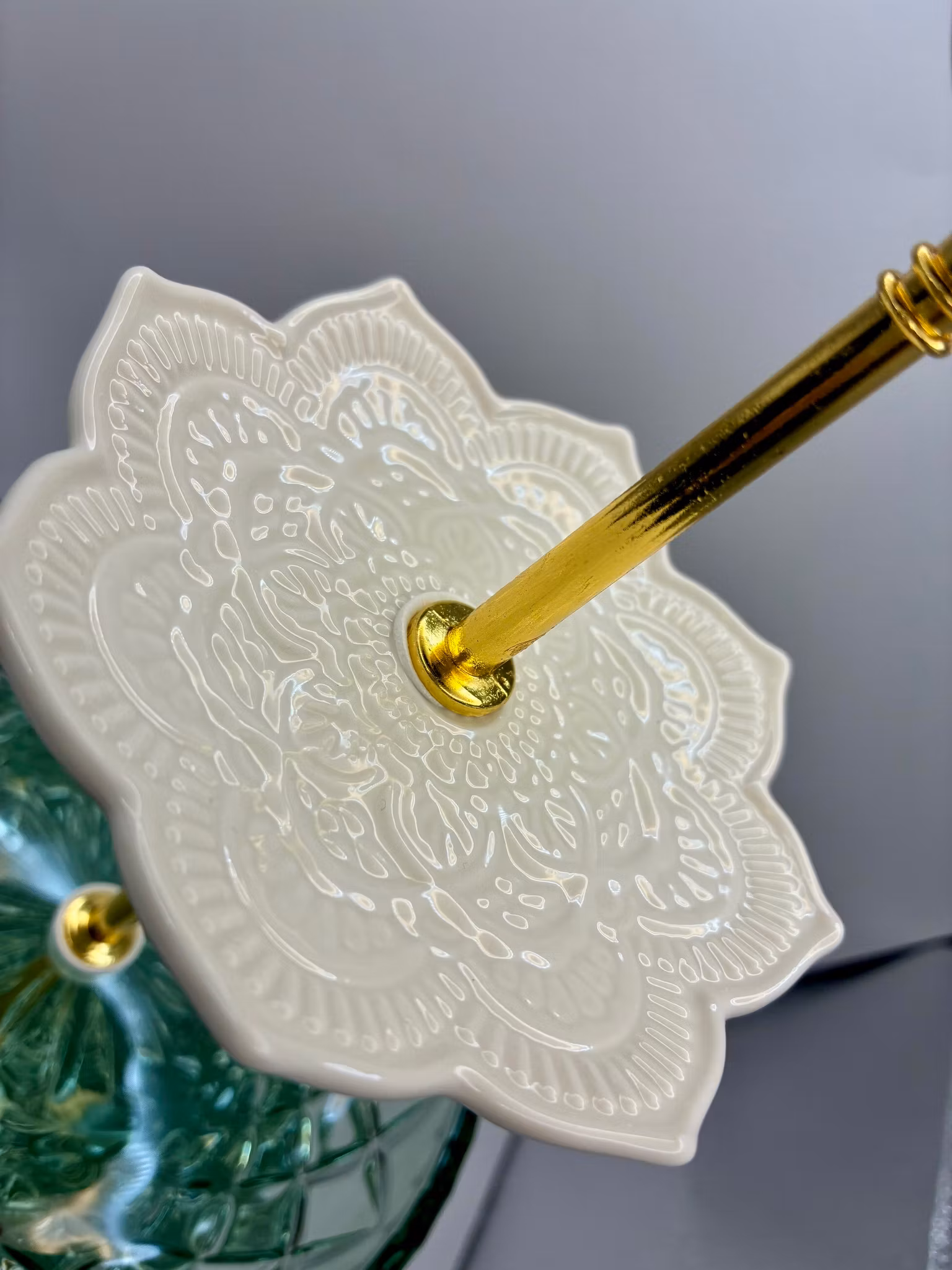 Kombinasjonen av porselen, grønt pressglass og keramikk gir et harmonisk og eksklusivt uttrykk.