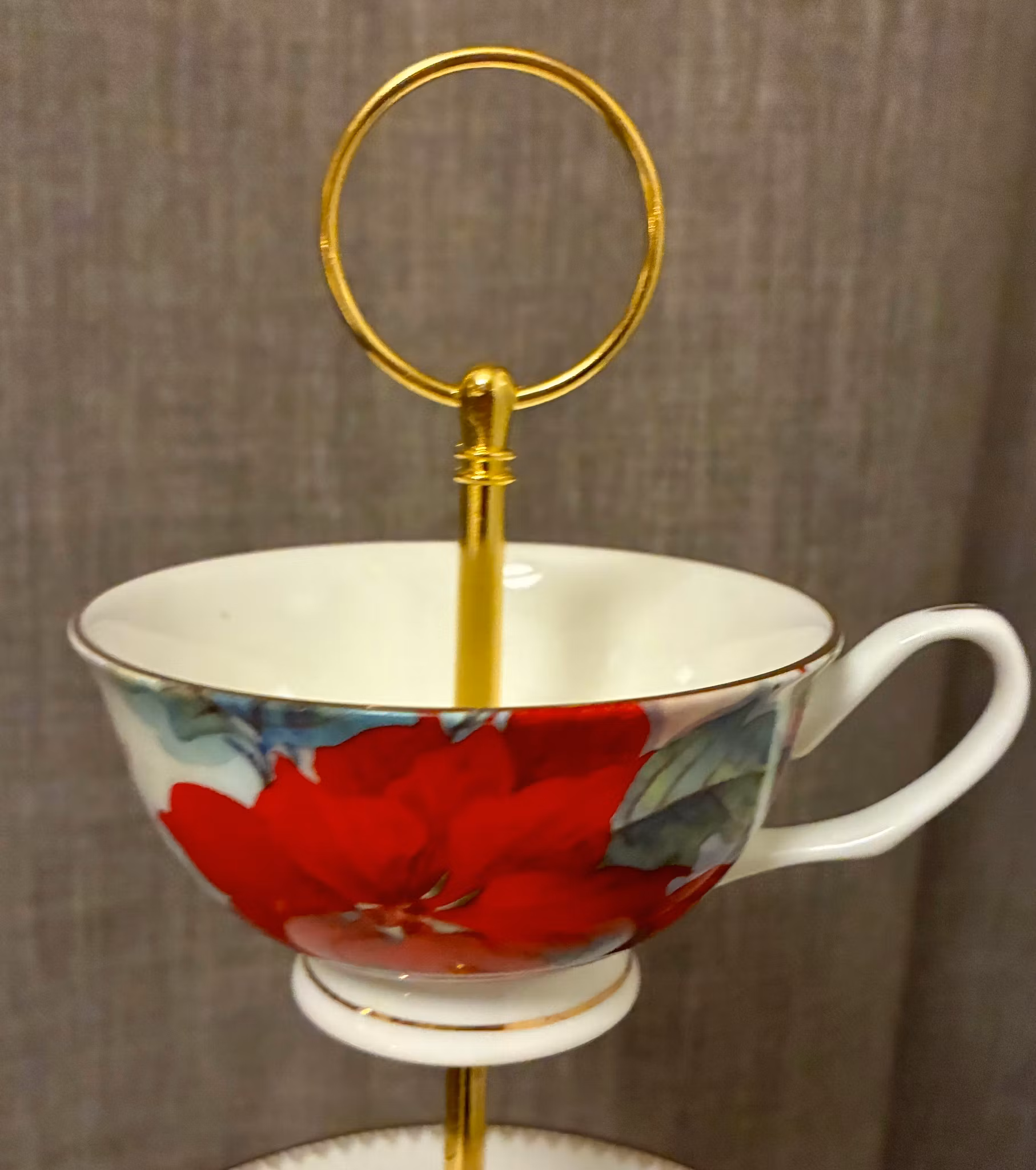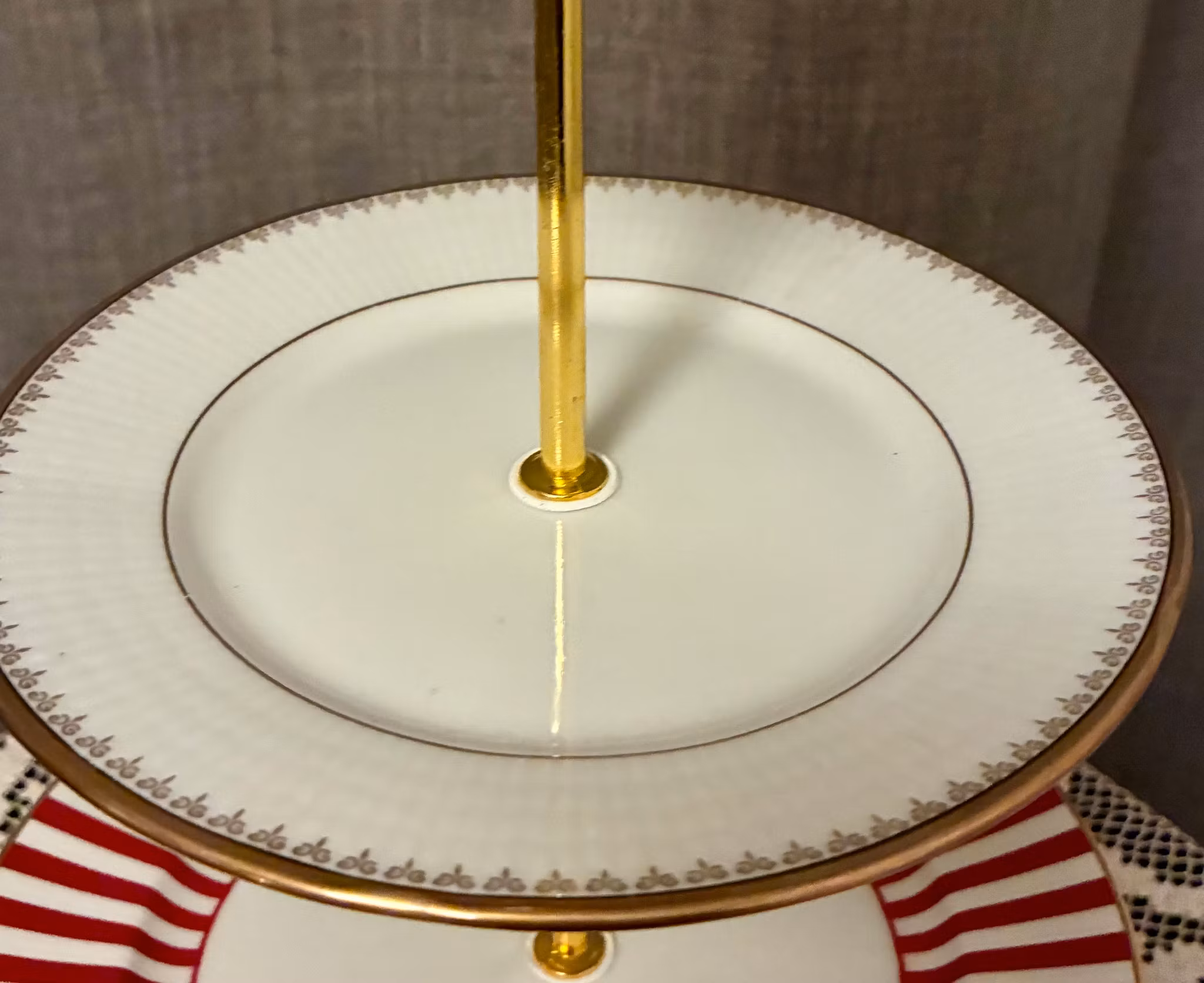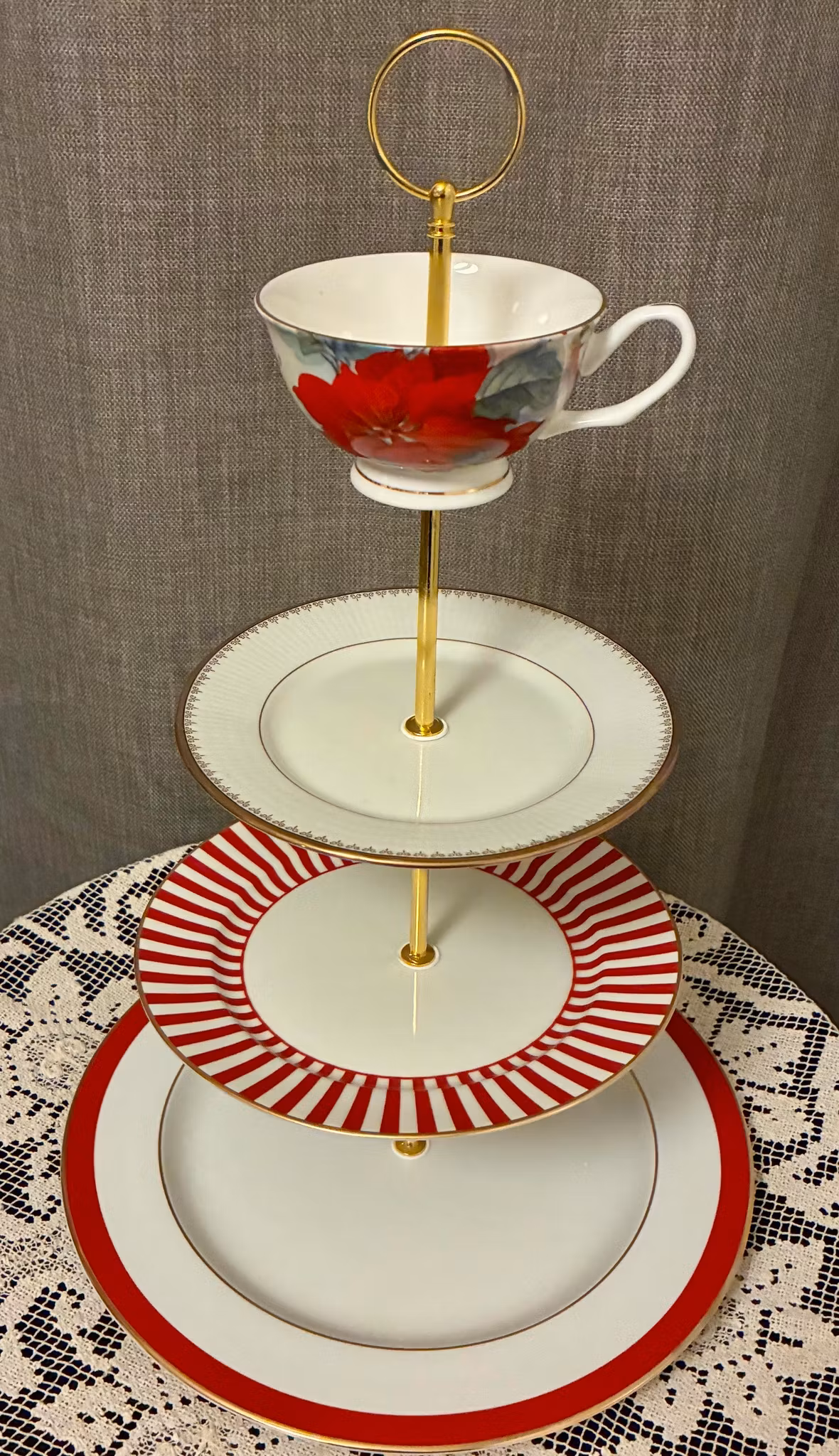 Øverst troner en vakker kopp i kinaporselen med julemotiv, ideell for smågodt, nøtter eller dekor. Under følger tre etasjer med nøye utvalgte tallerkener i ulike mønstre og stiler – fra elegante gullkanter til friske røde striper. Alt satt sammen for hånd med solid gullfarget stativ. Nederste tallerken er fra HMHome og er ca Ø28cm. Fatet er satt sammen av et gulllfarget stativ