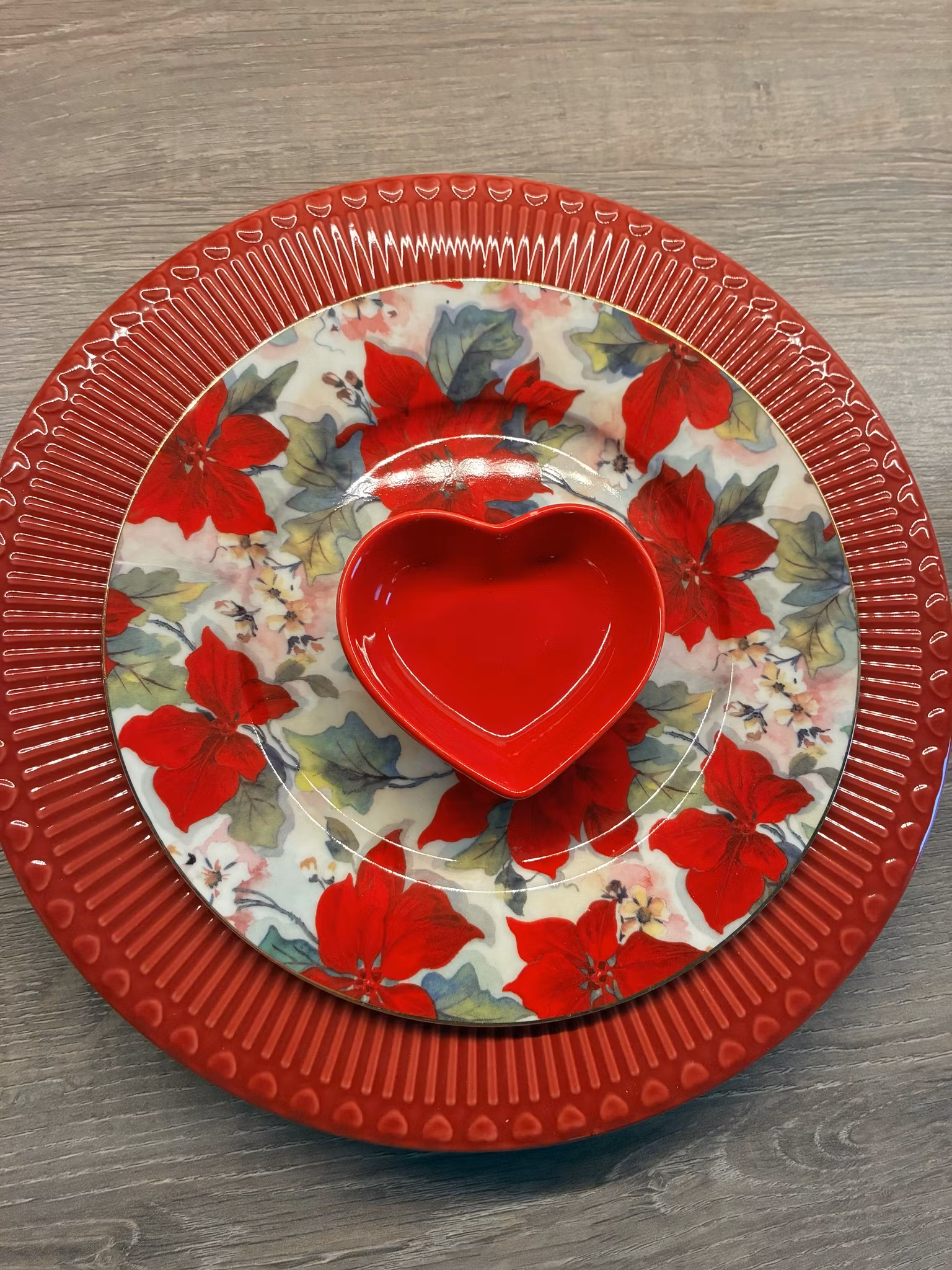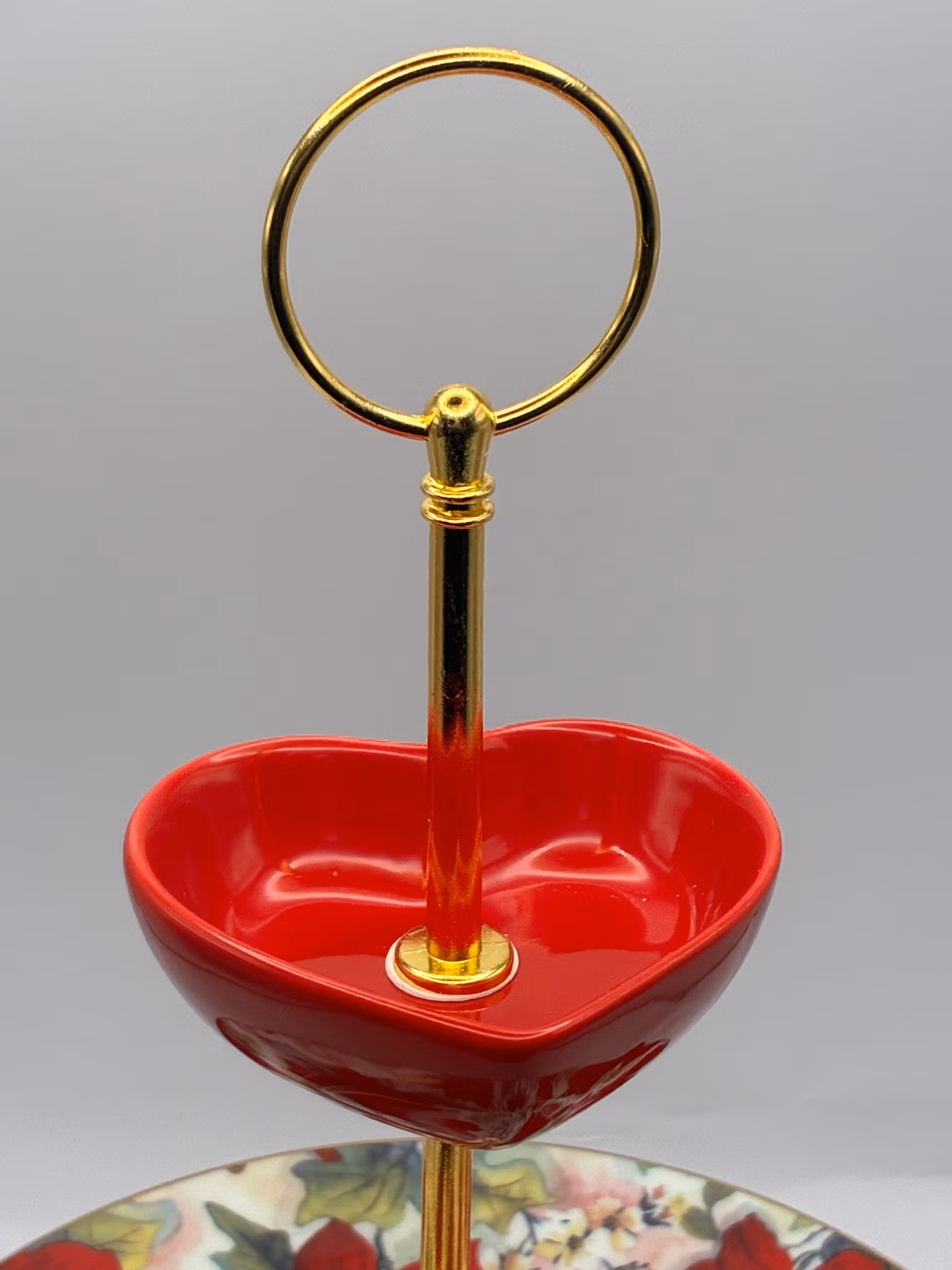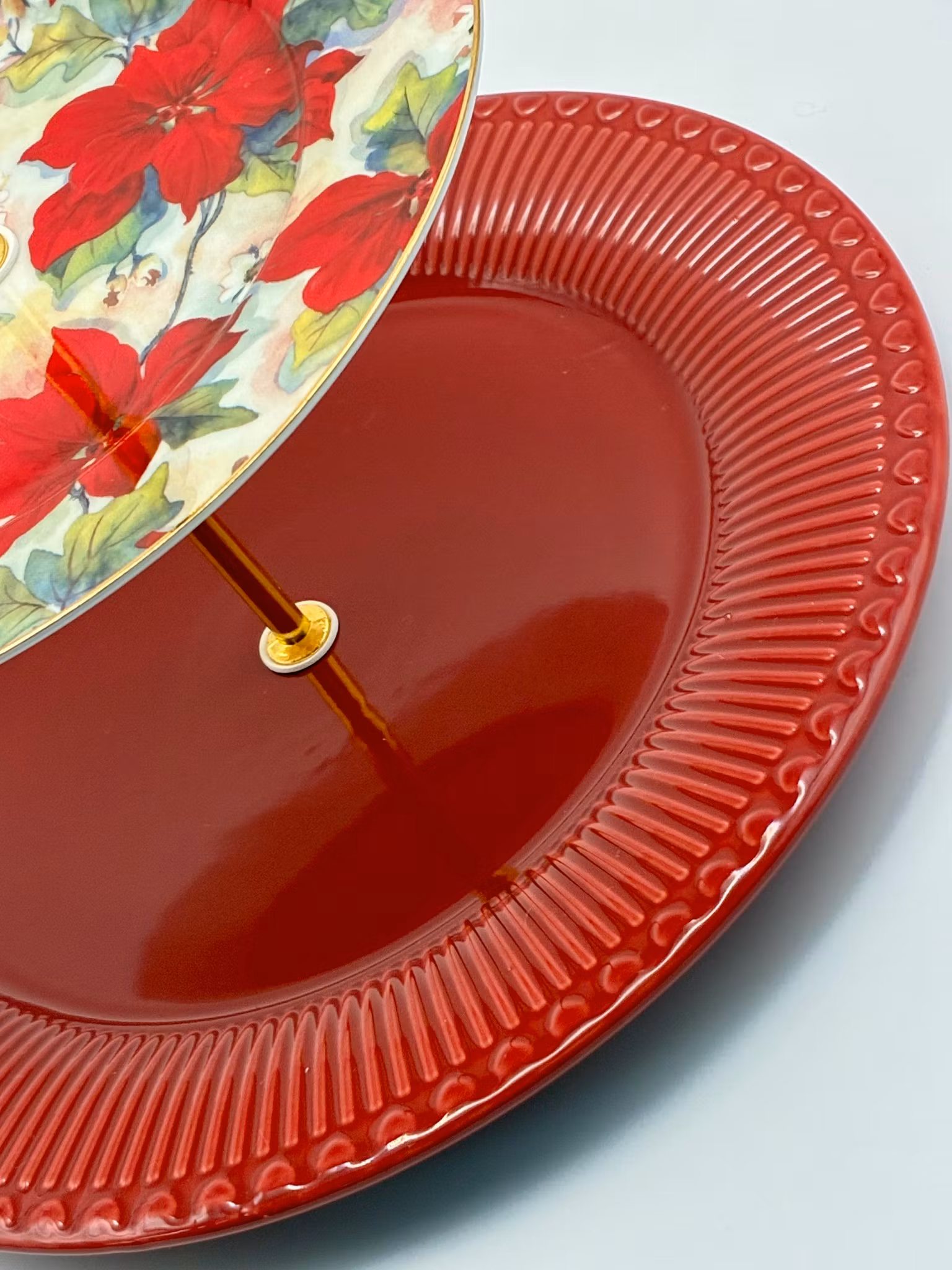 Øverst finner du en liten hjerteskål i blank rød keramikk, etterfulgt av en asjett i kinaporselen med tradisjonelt julmotiv i rødt, grønt og krem. Nederst en tallerken i glansfull rød glasur som gir helheten tyngde og varme. Gullfarget stativ binder alt sammen i et elegant uttrykk.