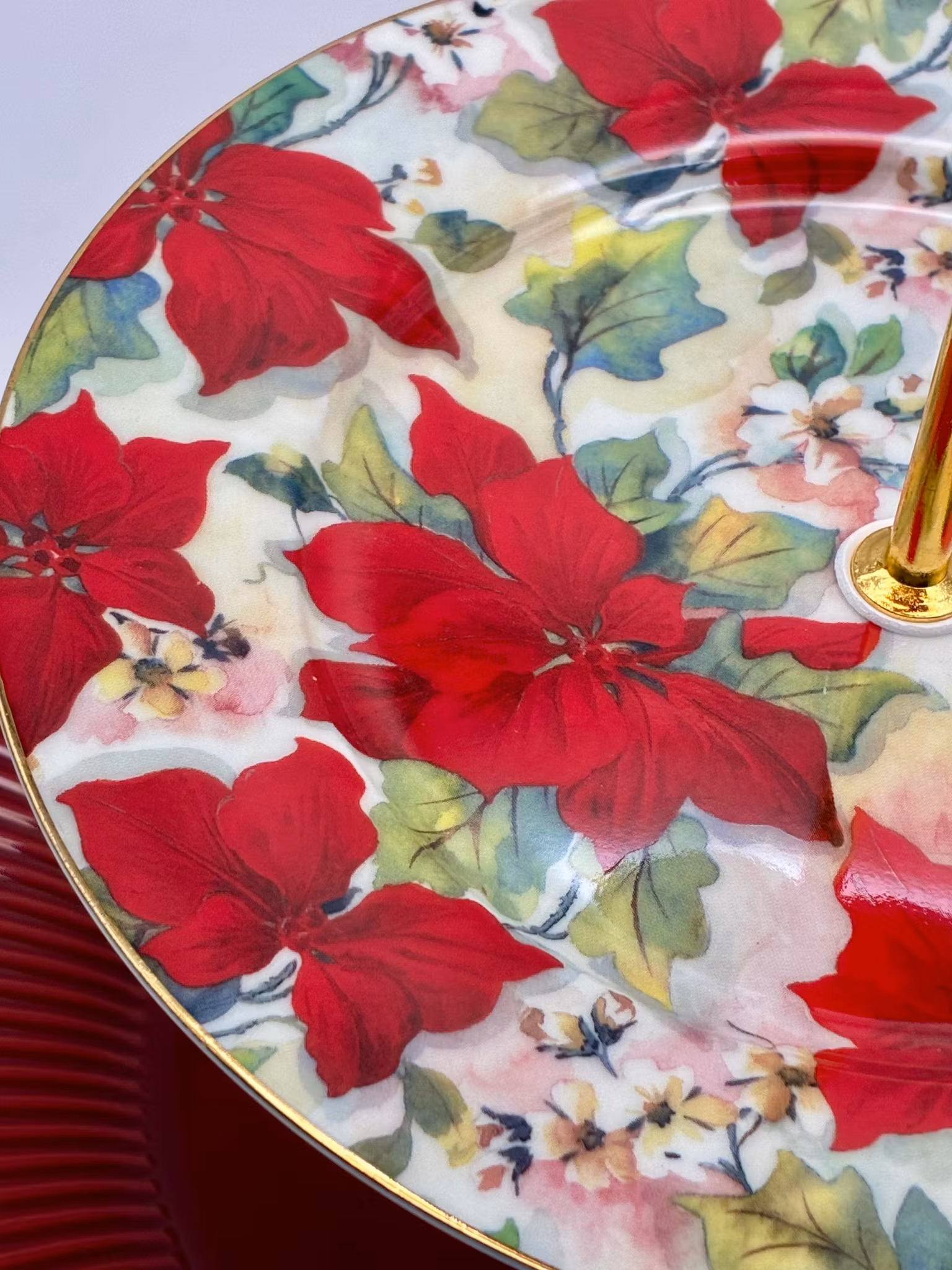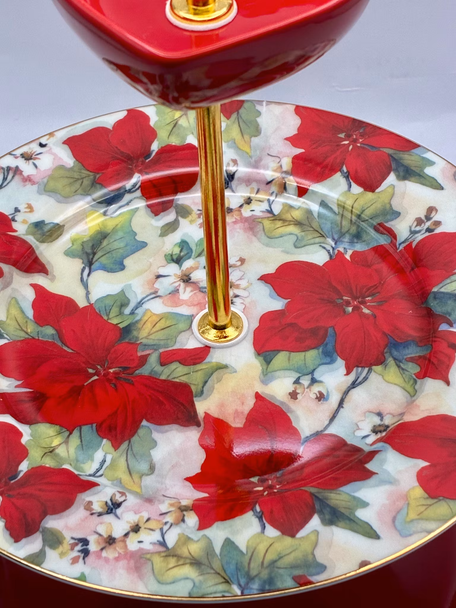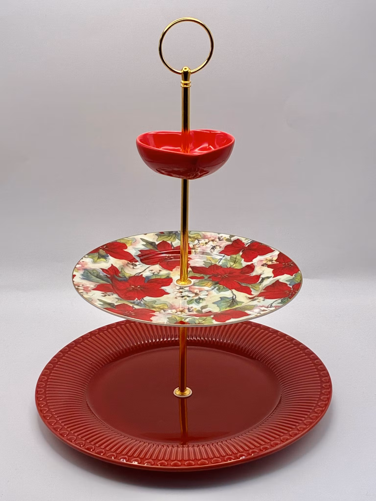 Dette treetasjes fatet kombinerer dype røde toner med klassiske juleblomster – perfekt for småkaker, konfekt eller servering av julefrokost i høytiden.