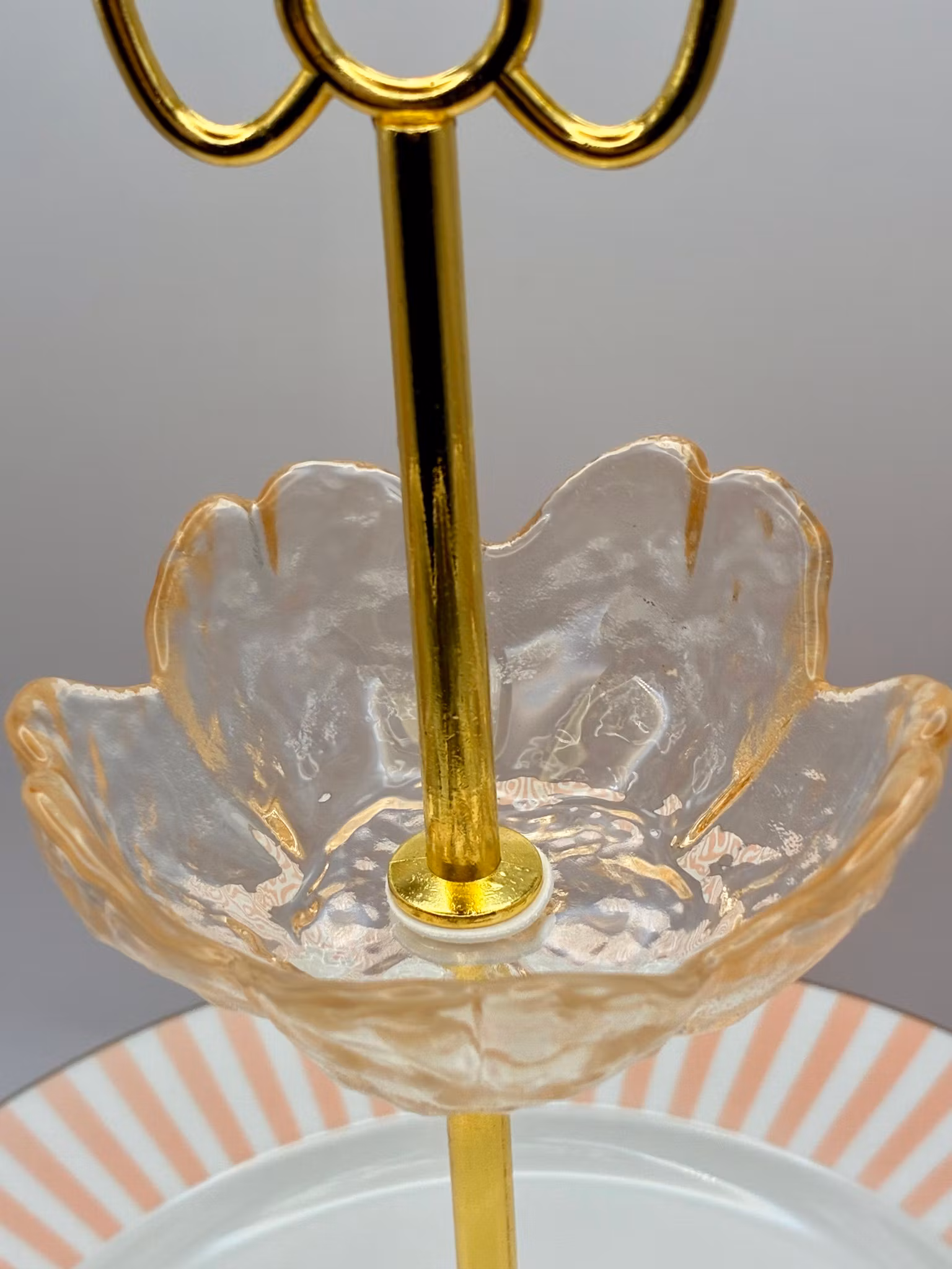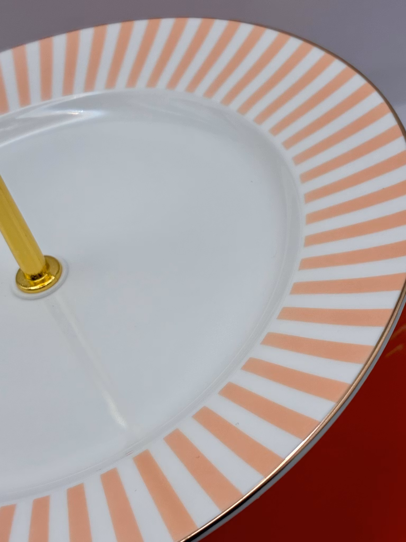 Kombinasjonen av gullfarget stativ, myke nyanser og spennende kontraster gjør dette fatet til et blikkfang på ethvert bord. Ideelt til kaker, småretter eller snacks – og et sjarmerende innslag i både hverdag og fest.
