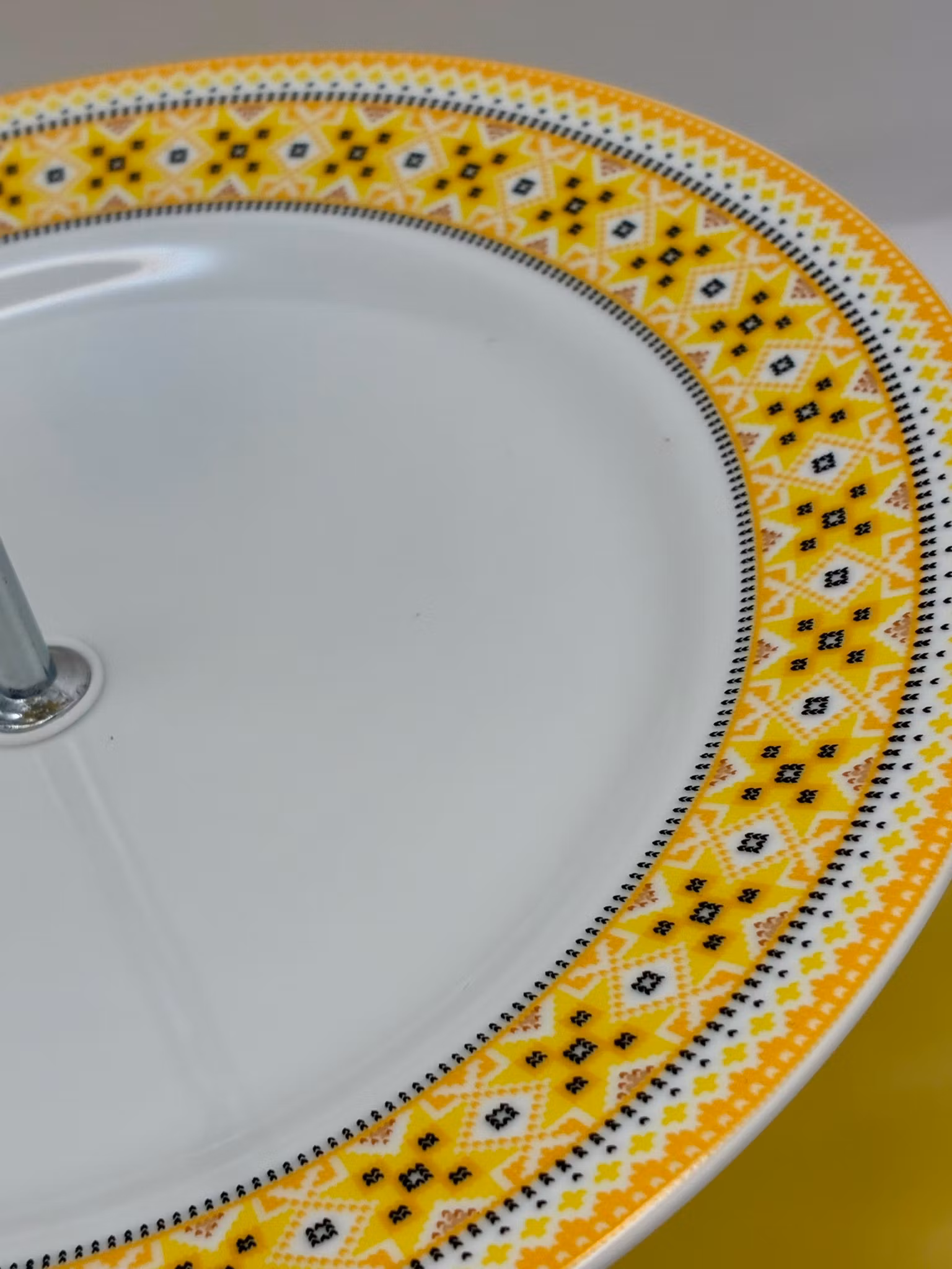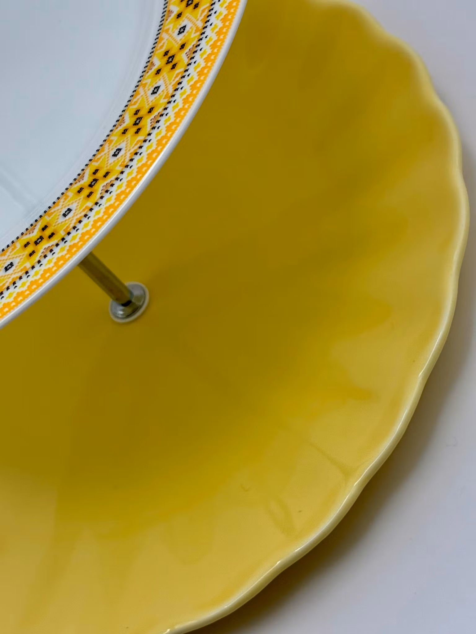 Kombinasjonen av norsk porselensarv og moderne keramikk gjør dette etasjefatet til et unikt blikkfang. Det sprer glede og passer både til hverdags og fest.
