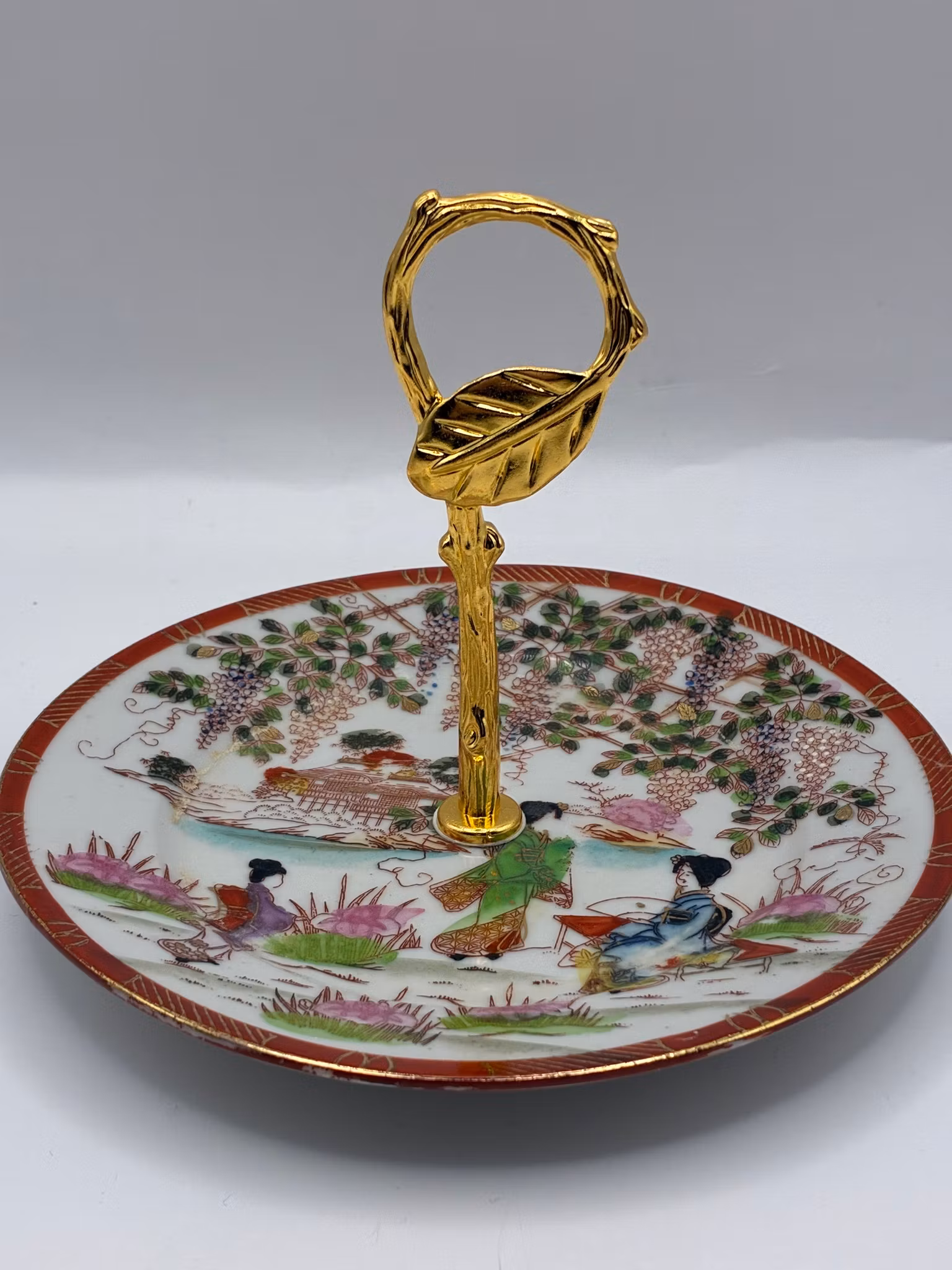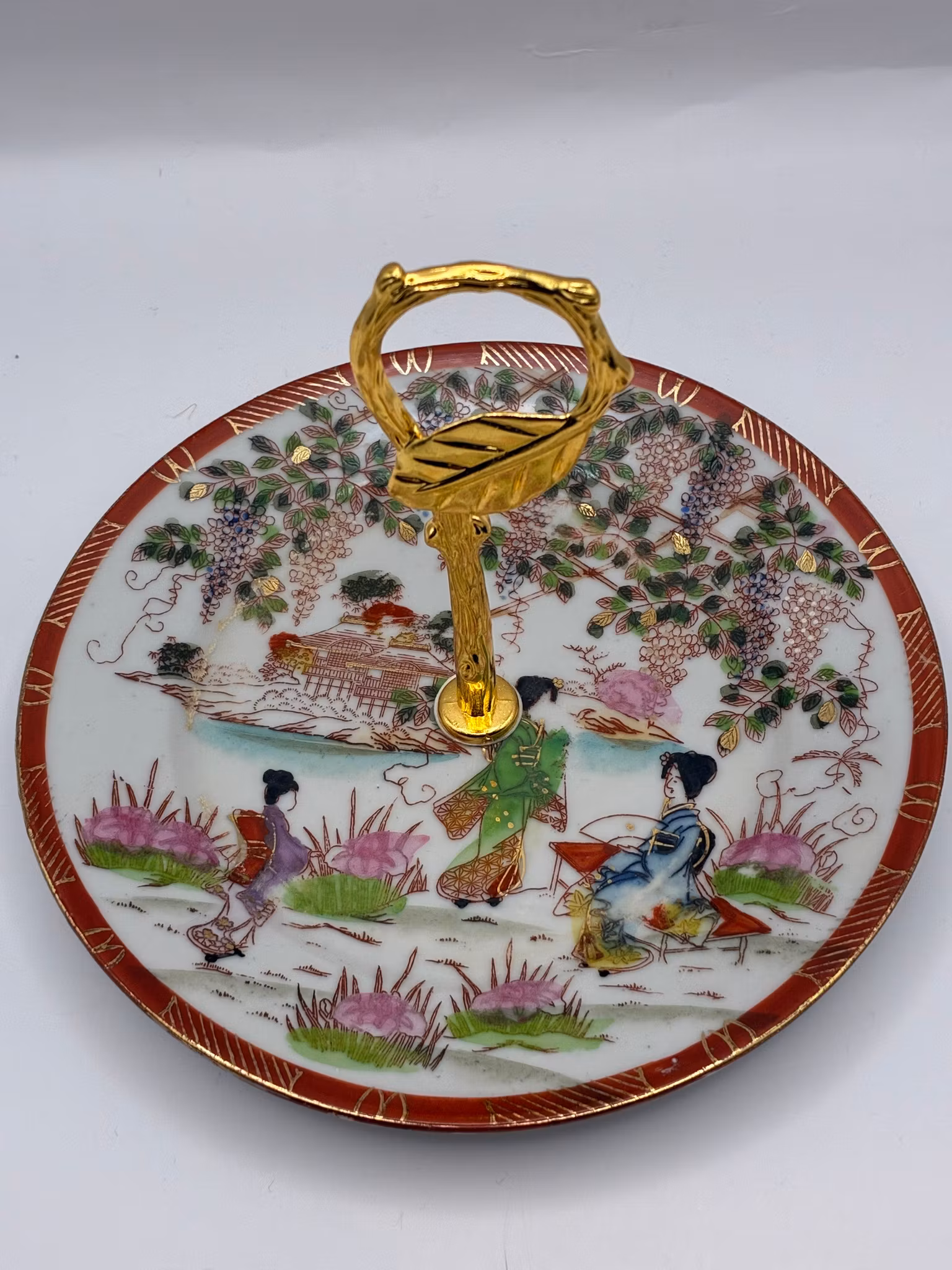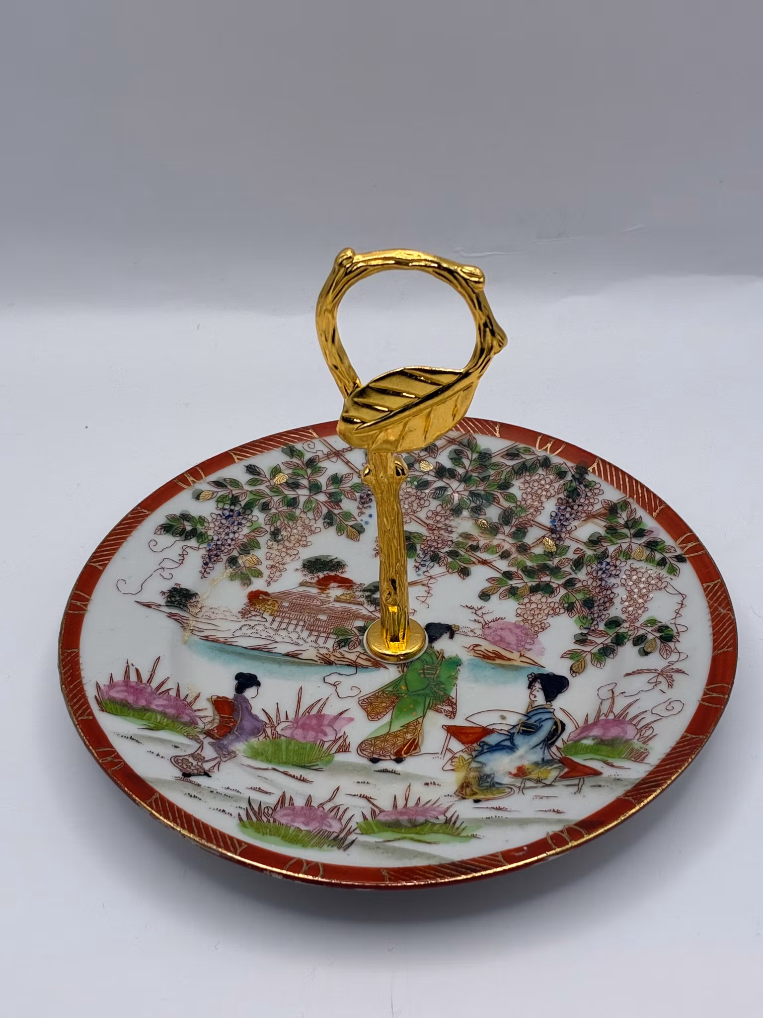 Dette er et japansk lite fat i porselen, mønsteret er ofte referert til som "Geisha Ware" eller Satsuma-stil, med håndmalte detaljer og en forgylt hank. Fatet er dekorert med en tradisjonell scene som viser japanske kvinner i en hage eller ved en elvebredd med pagoder og blomstrende trær i bakgrunnen.