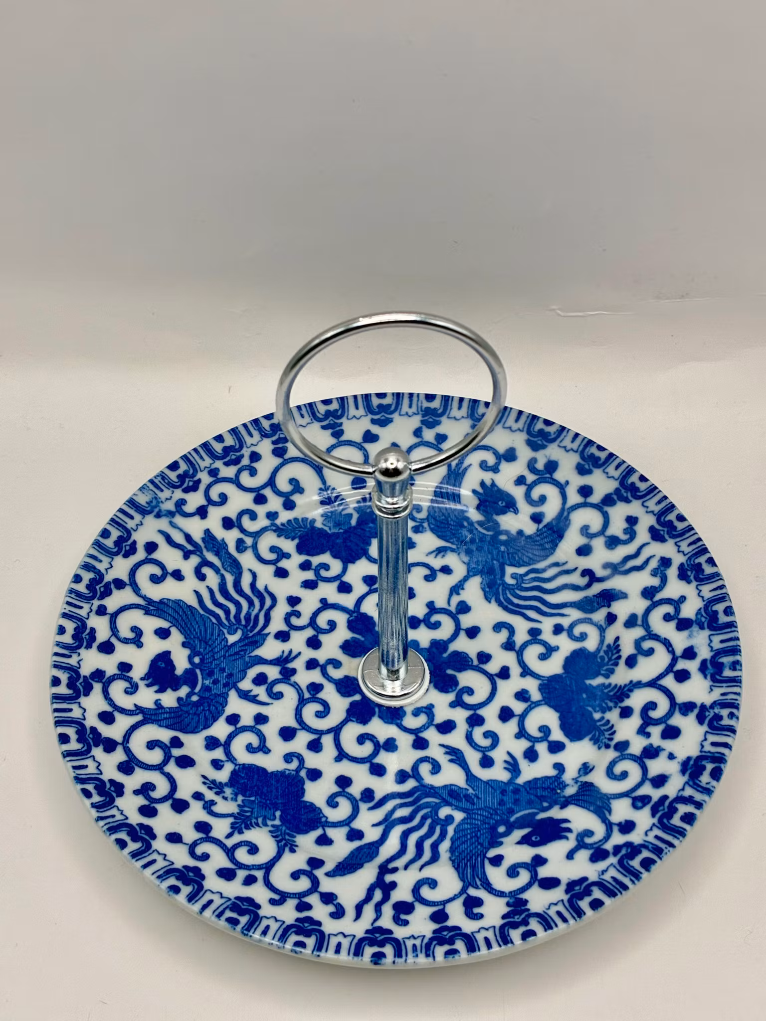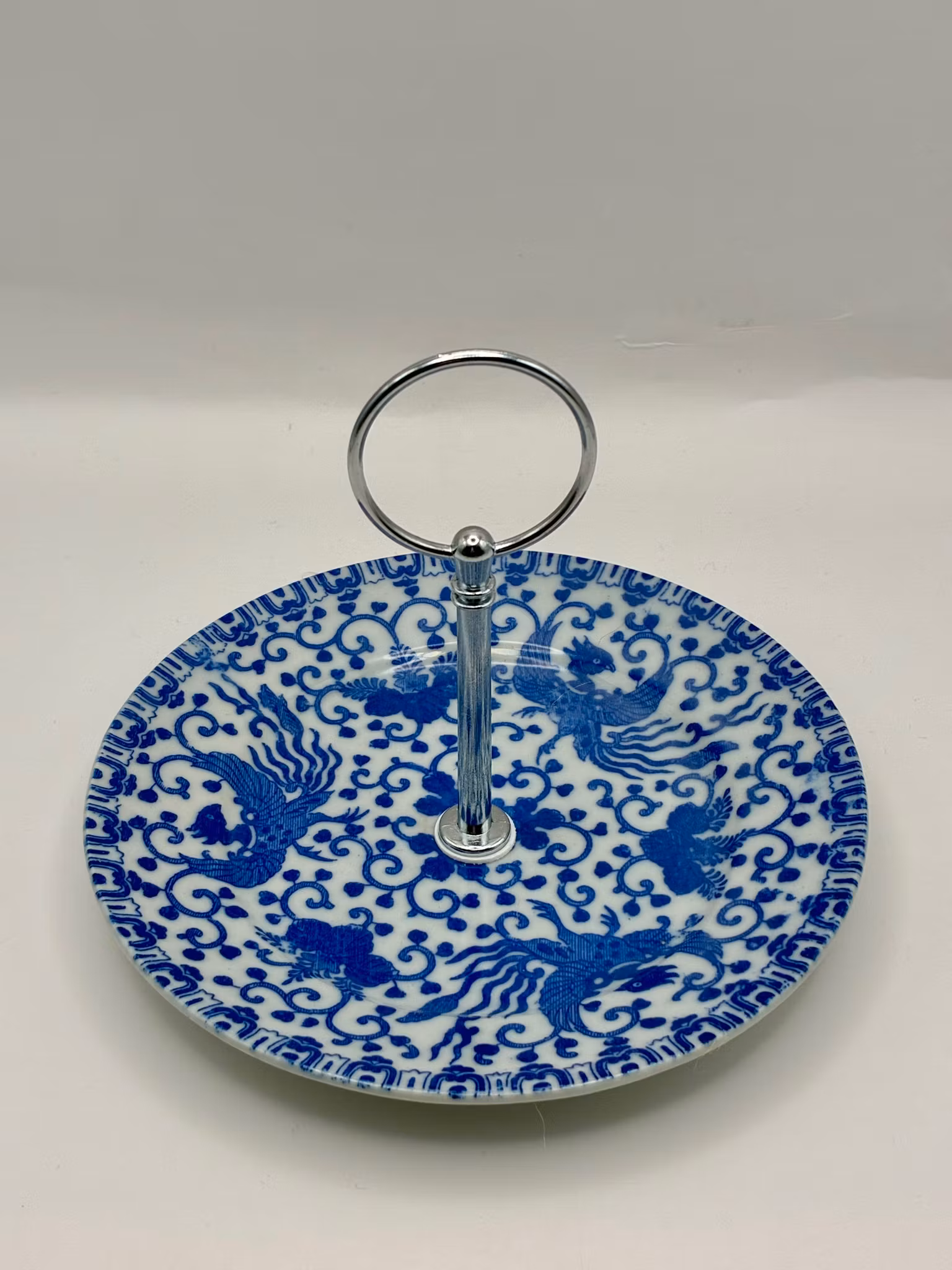 Dette toetasjes smykkefatet er bygget på en porselensskål med et mønster kjent som "Phoenix Ware", toppet av en hvit skål.