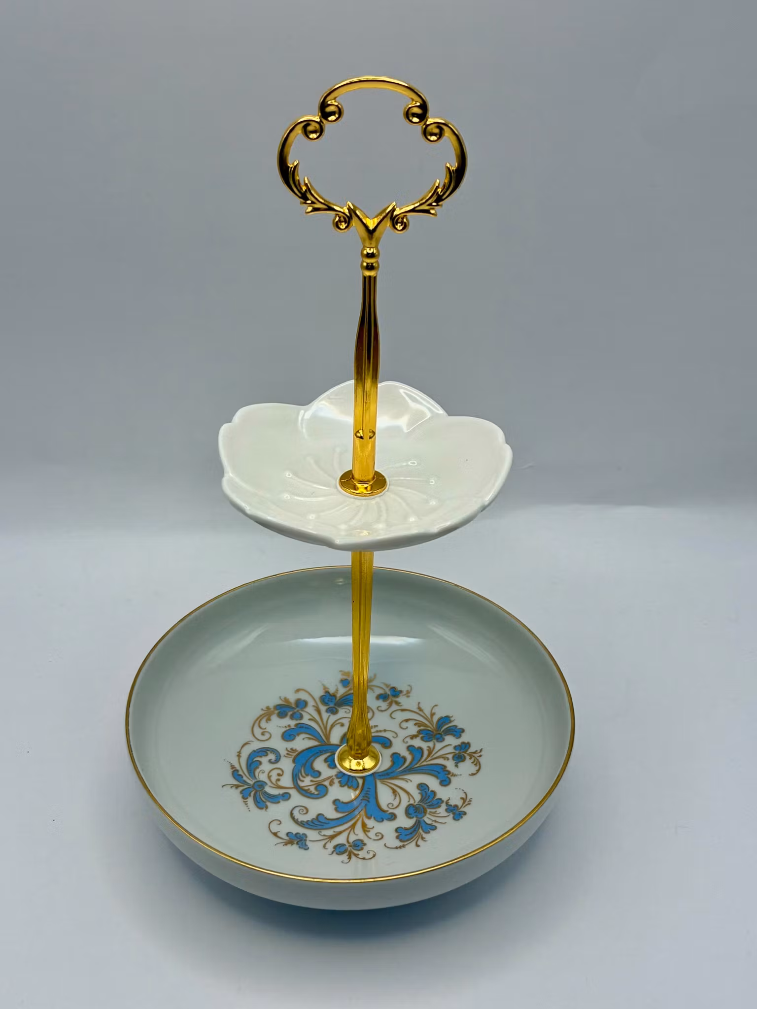 Dette toetasjes smykkefatet er bygget på en skål i mønsteret "Seljord" fra Porsgrunds Porselænsfabrik. Øverst en liten hvit «blomsterskål».