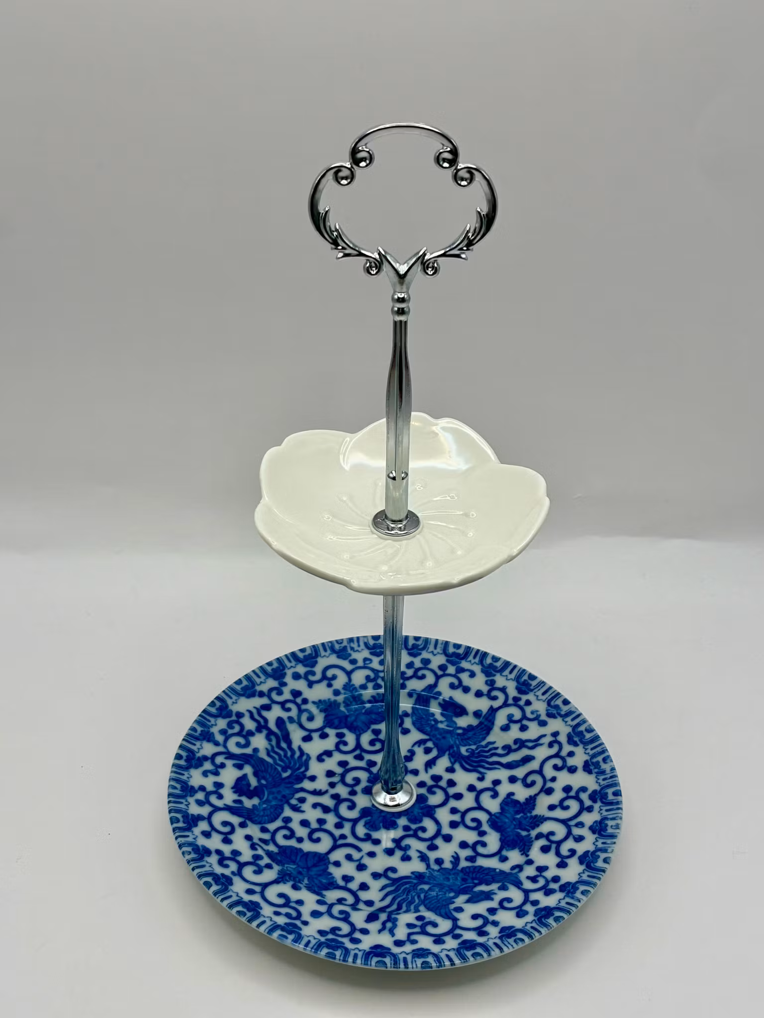 Dette toetasjes smykkefatet er bygget på en porselensskål med et mønster kjent som "Phoenix Ware", toppet av en hvit skål.
