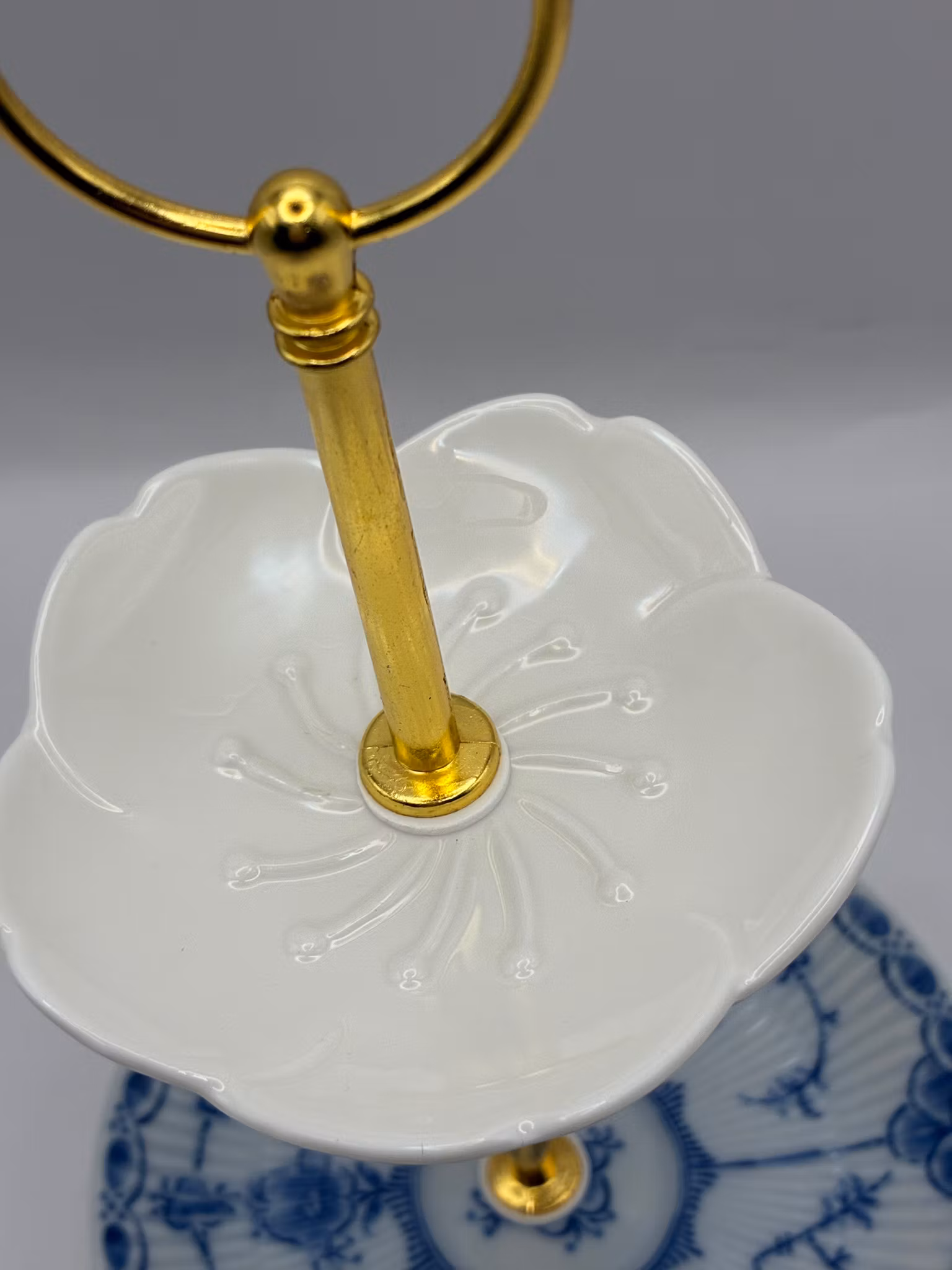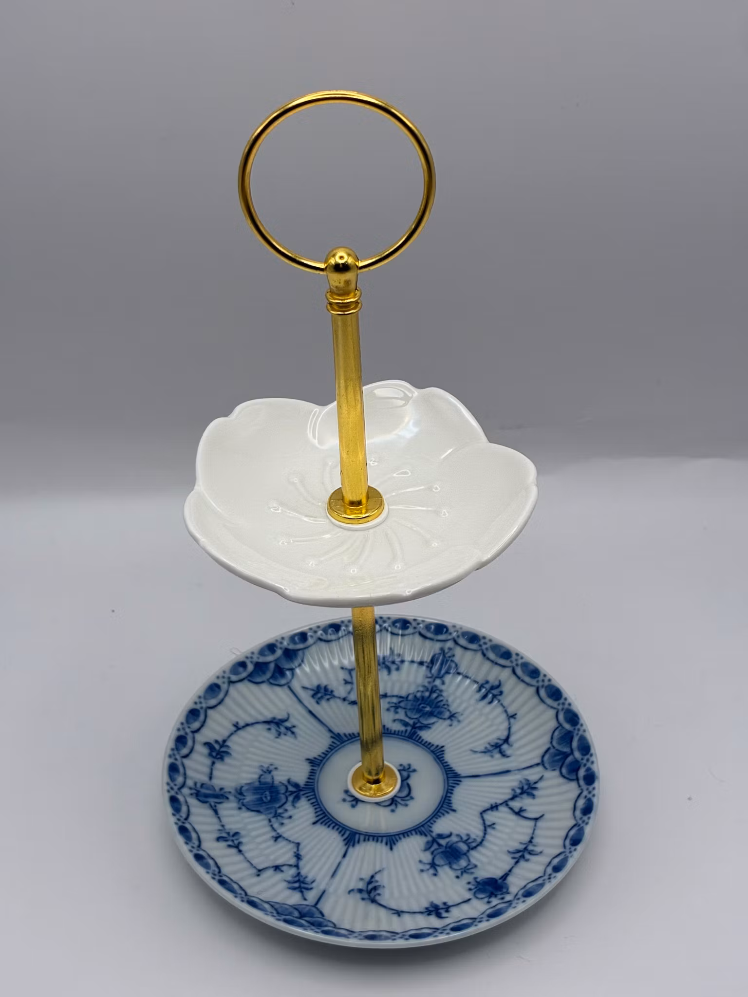 Dette toetasjes smykkefatet er bygget på en porselensskål med et mønster kjent som "Royal Copenhagen Musselmalet» toppet av en hvit skål.