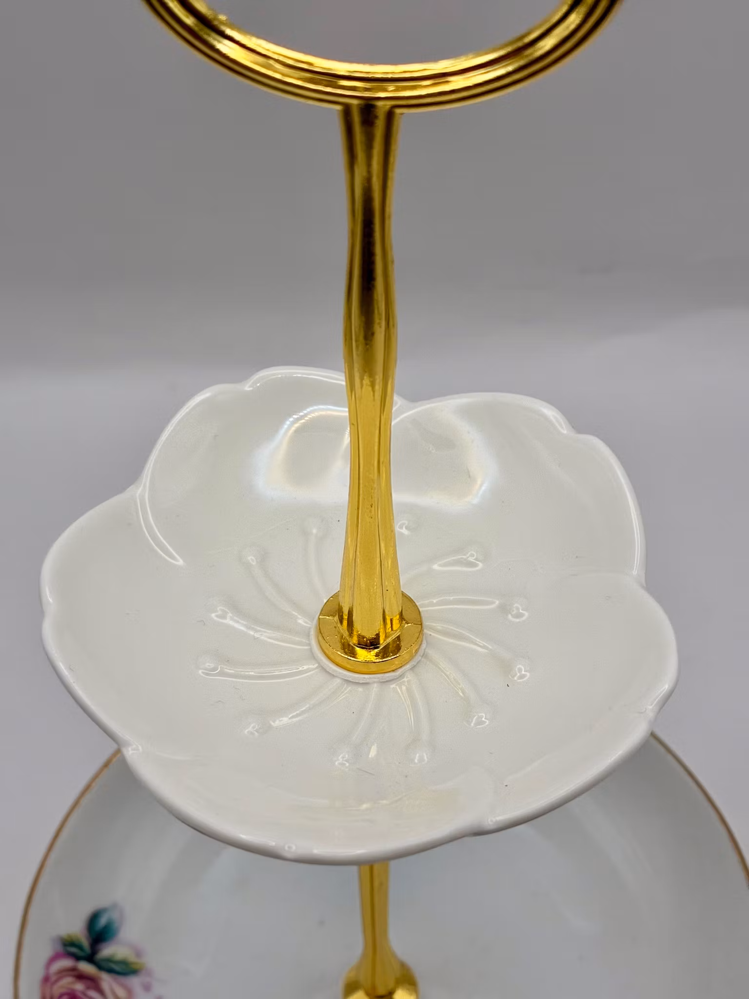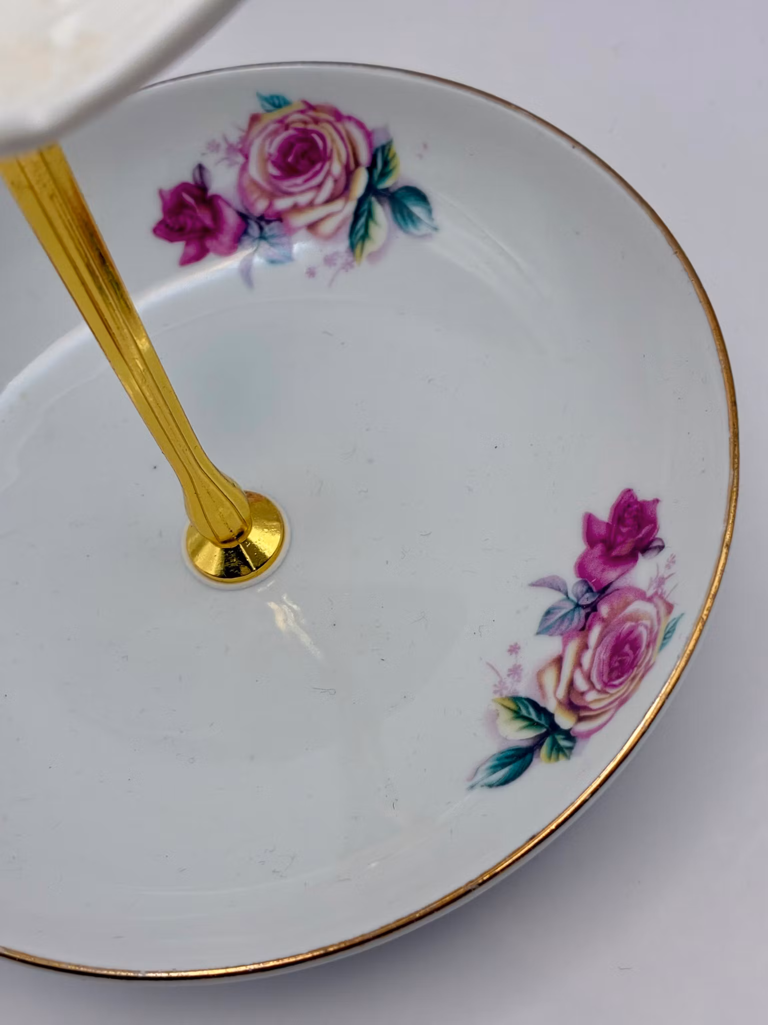 Dette toetasjes smykkefatet fra Anitas Skatter er laget med omtanke av vintage porselen med nydelig rosemotiv og gullkant. Det er perfekt til å oppbevare dine mest kjære smykker med stil.