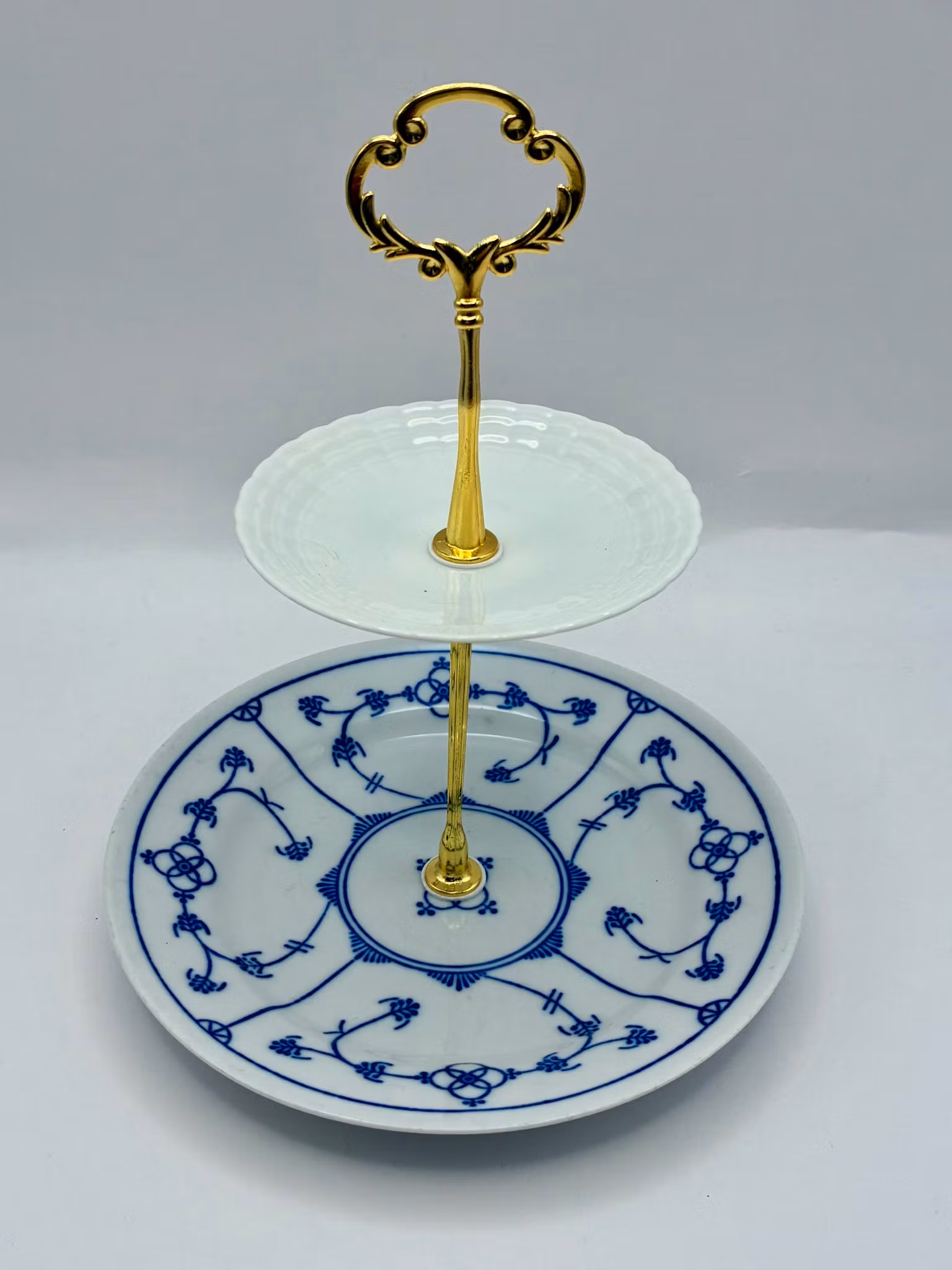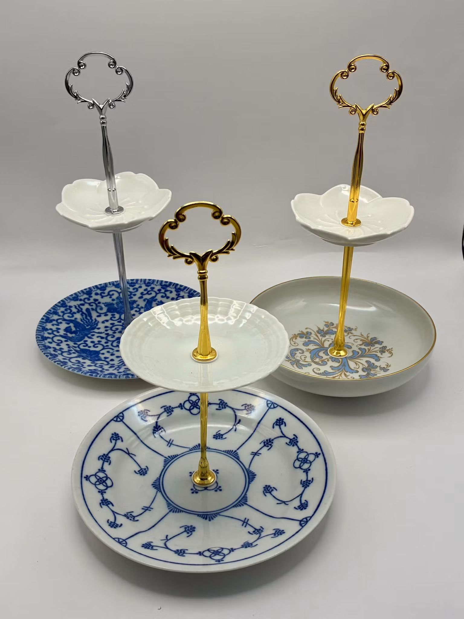Dette toetasjes smykkefatet er bygget på en skål i stråmønster, toppet av en liten hvit skål.
